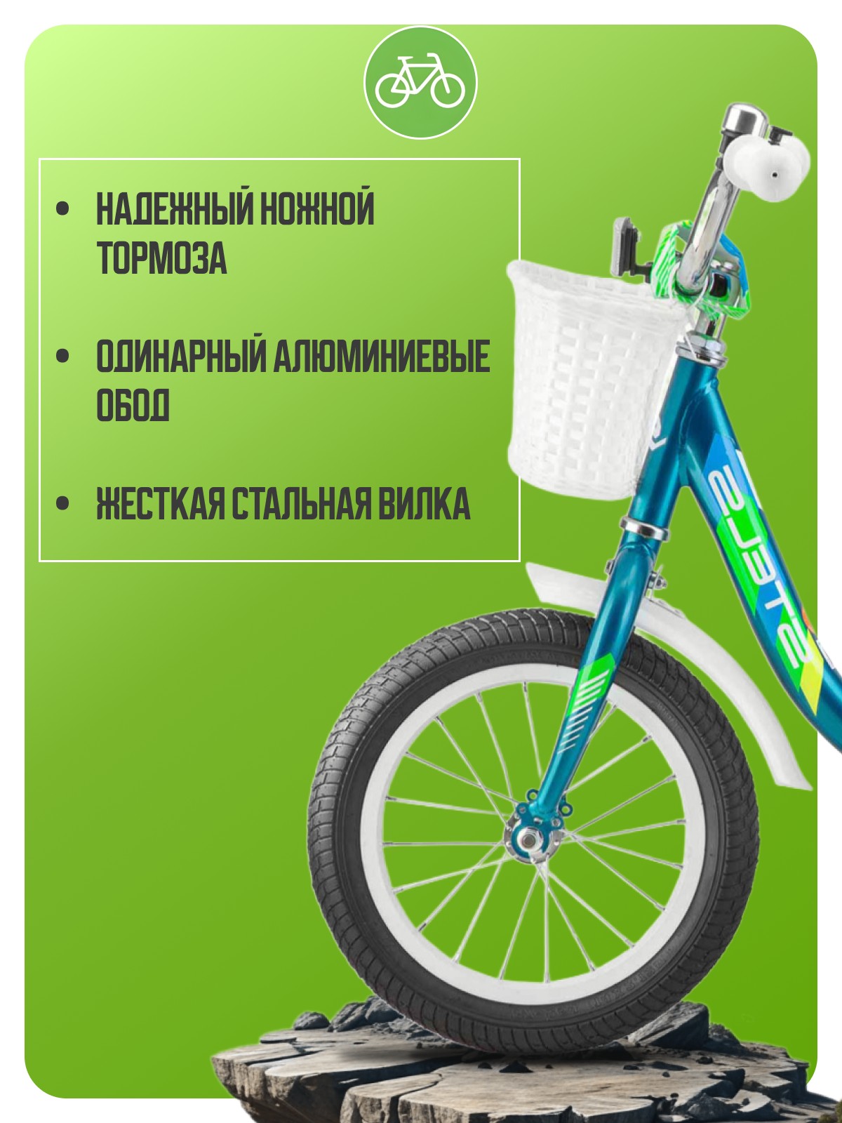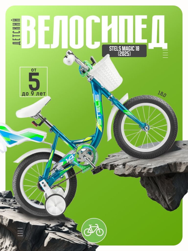 Велосипед, предназначенный для детей в возрасте от пяти до девяти лет, с оборудованием начального класса, без переключения передач. Технические особенности: прочная стальная рама, жесткая стальная вилка, одинарный алюминиевые обод, надежный ножной тормоза , защита цепи, крылья, звонок, боковые колеса, багажник. Подходит для обучения и прогулочного катания в городских условиях. Диаметр колес - 18 дюймов. Вес - 10 кг.