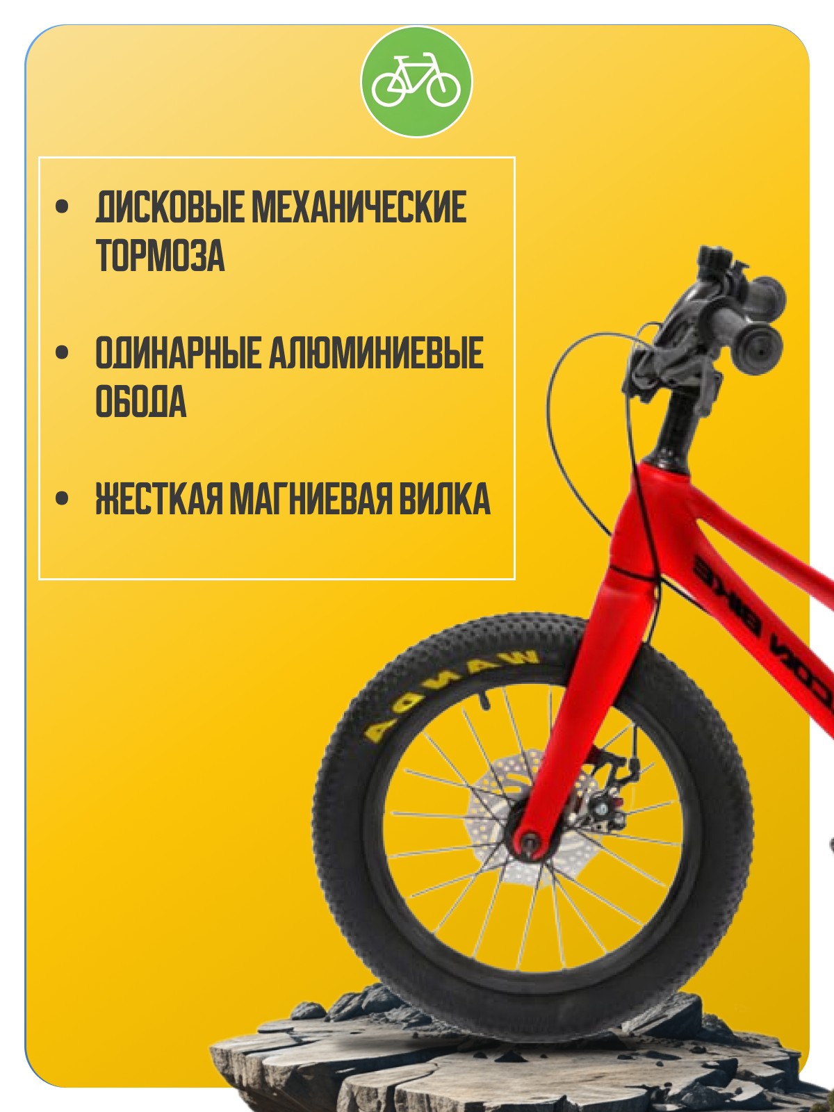Велосипед, предназначенный для детей в возрасте от двух до четырех лет, без переключения передач. Технические характеристики: легкая рама из магниевого сплава, жесткая магниевая вилка, одинарные алюминиевые обода, дисковые механические тормоза, полная защита цепи, боковые колеса, звонок. Подходит для обучения и прогулочного катания в городских условиях. Диаметр колес - 14 дюймов. Вес - 8,5 кг.