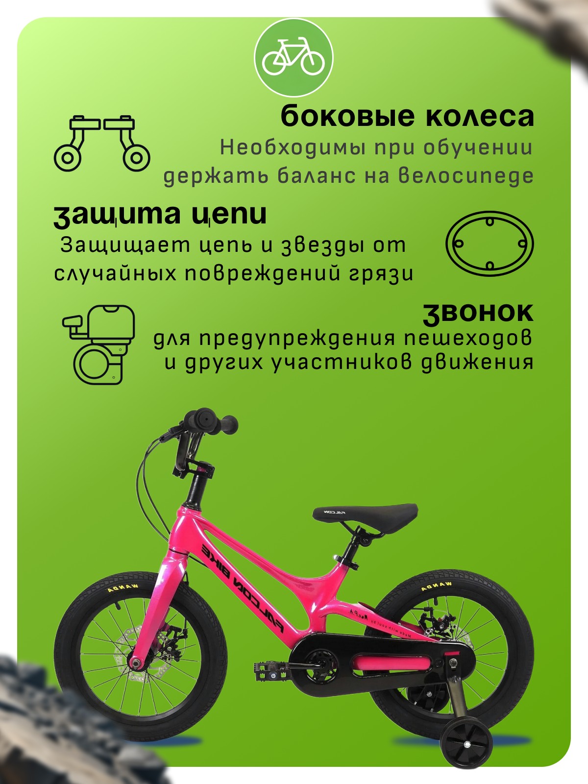 Особенности велосипеда: Боковые колеса, Дисковые тормоза, Защита цепи, Звонок, Крепления для боковых колес.