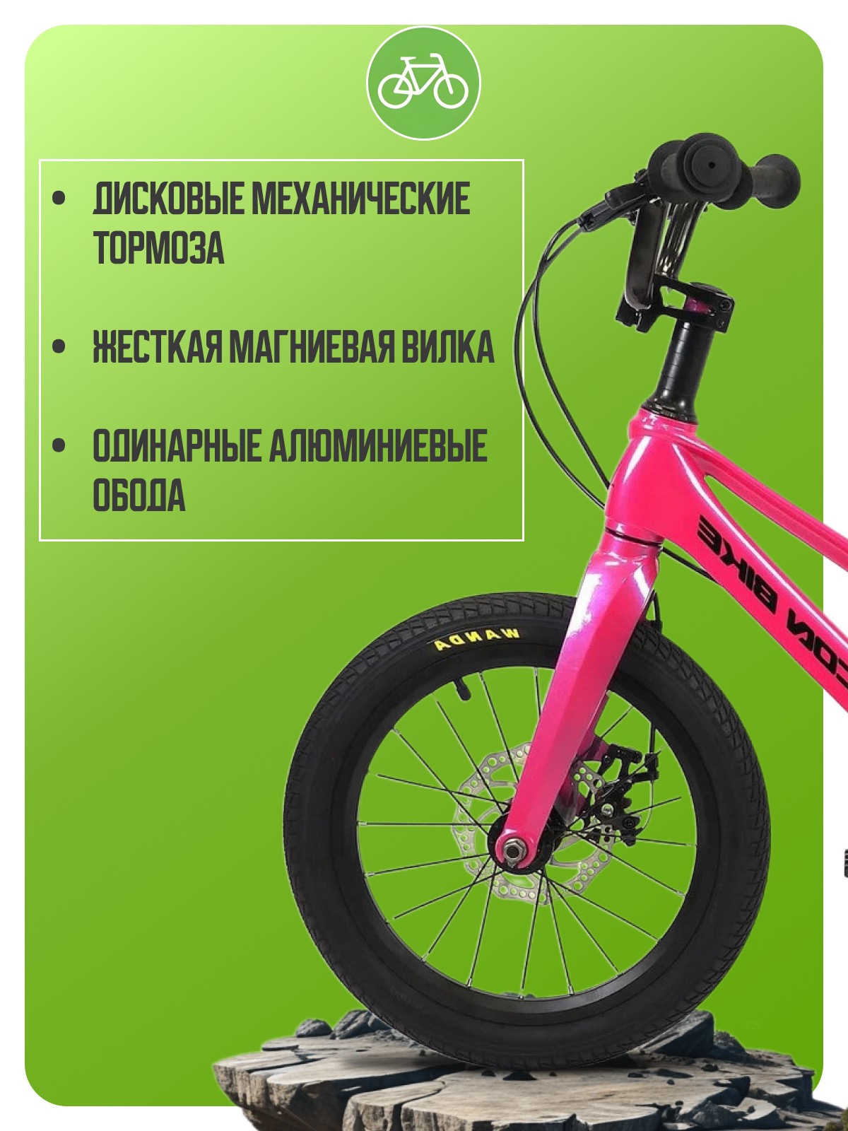 Велосипед, предназначенный для детей в возрасте от двух до четырех лет, без переключения передач. Технические характеристики: легкая рама из магниевого сплава, жесткая магниевая вилка, одинарные алюминиевые обода, дисковые механические тормоза, полная защита цепи, боковые колеса, звонок. Подходит для обучения и прогулочного катания в городских условиях. Диаметр колес - 14 дюймов. Вес - 8,5 кг.