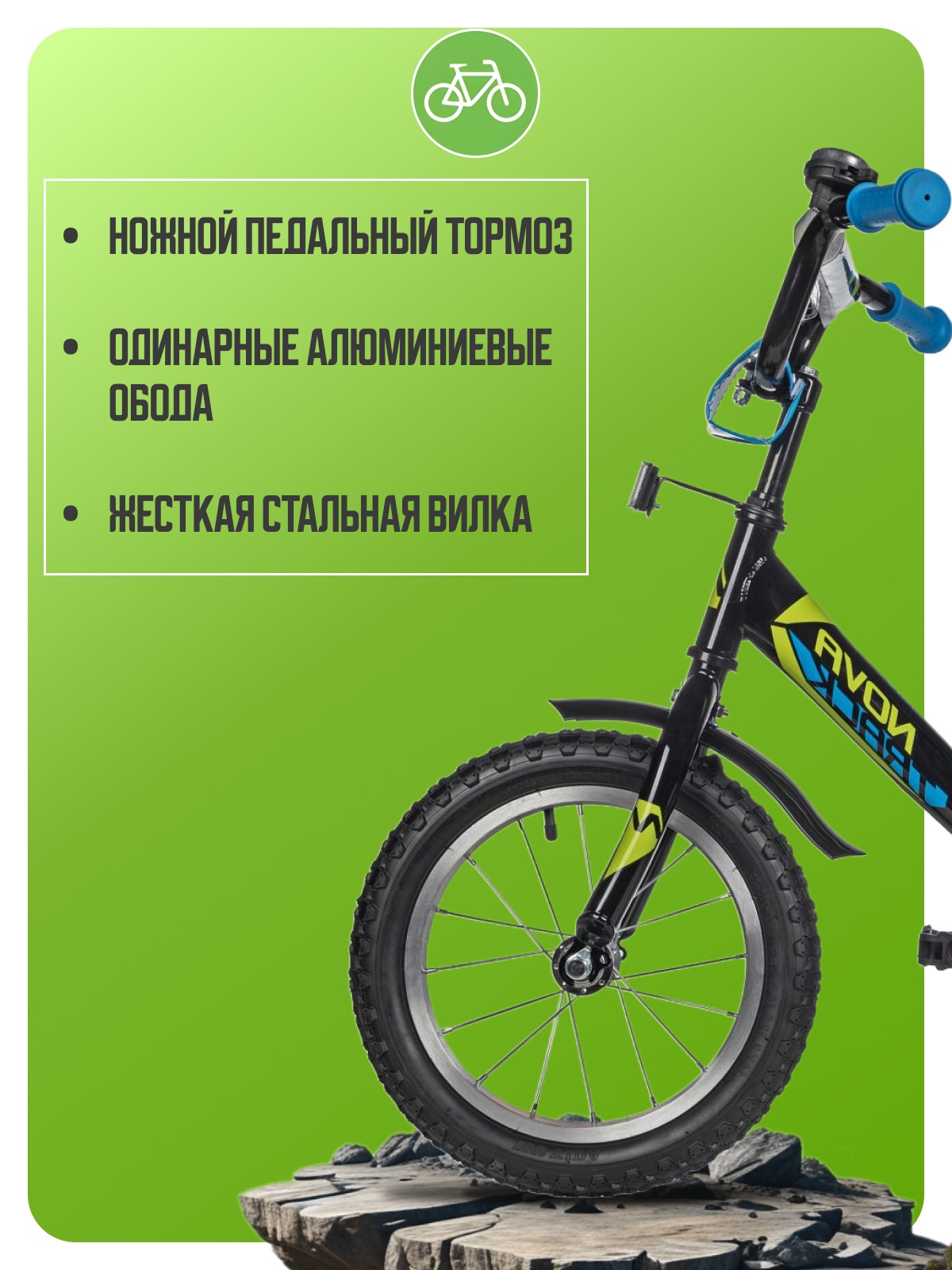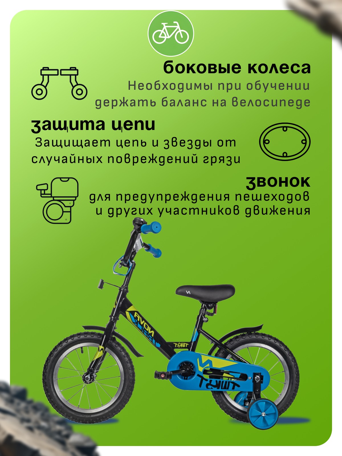 Особенности велосипеда: Боковые колеса, Защита цепи, Защитная накладка на руль, Звонок, Катафоты, Крепления для боковых колес, Крылья, Мягкая накладка на руль, Ножной тормоз.