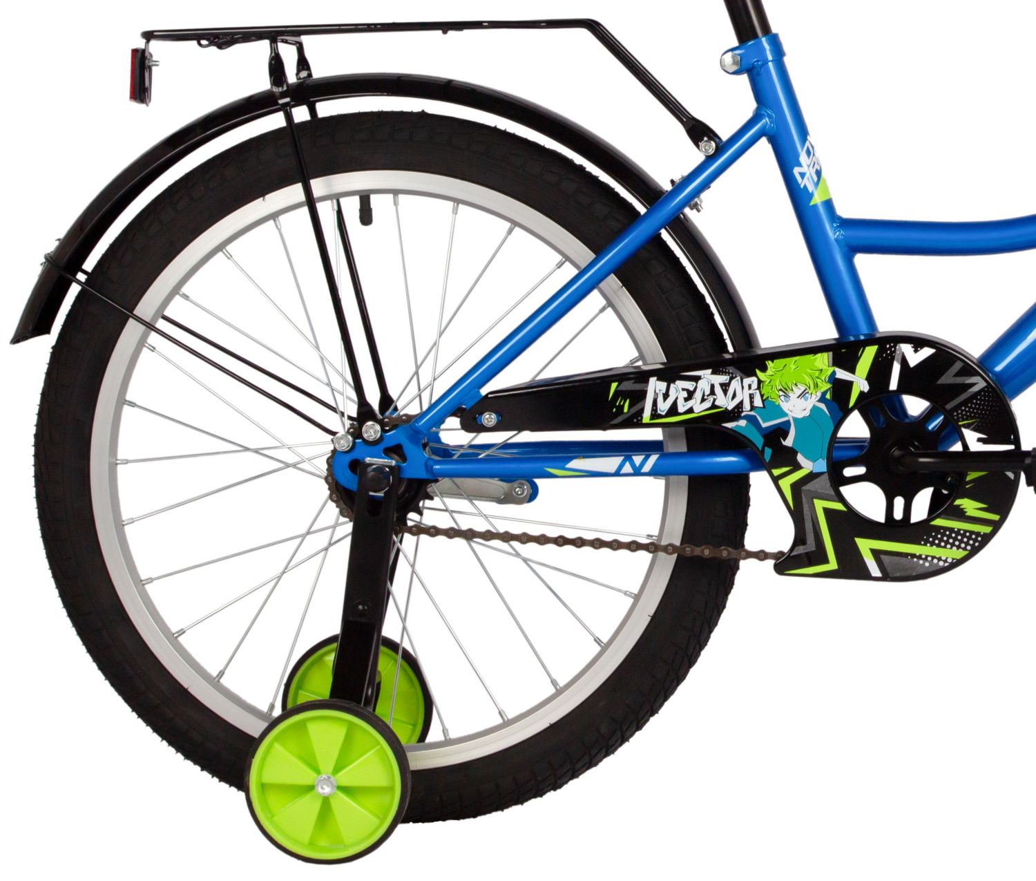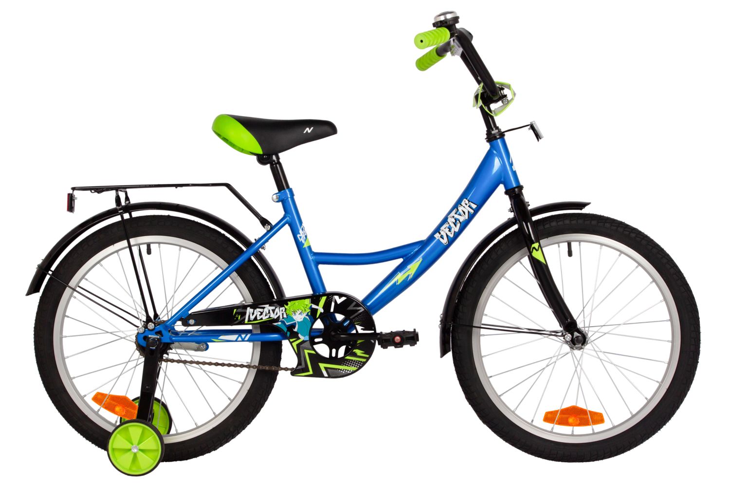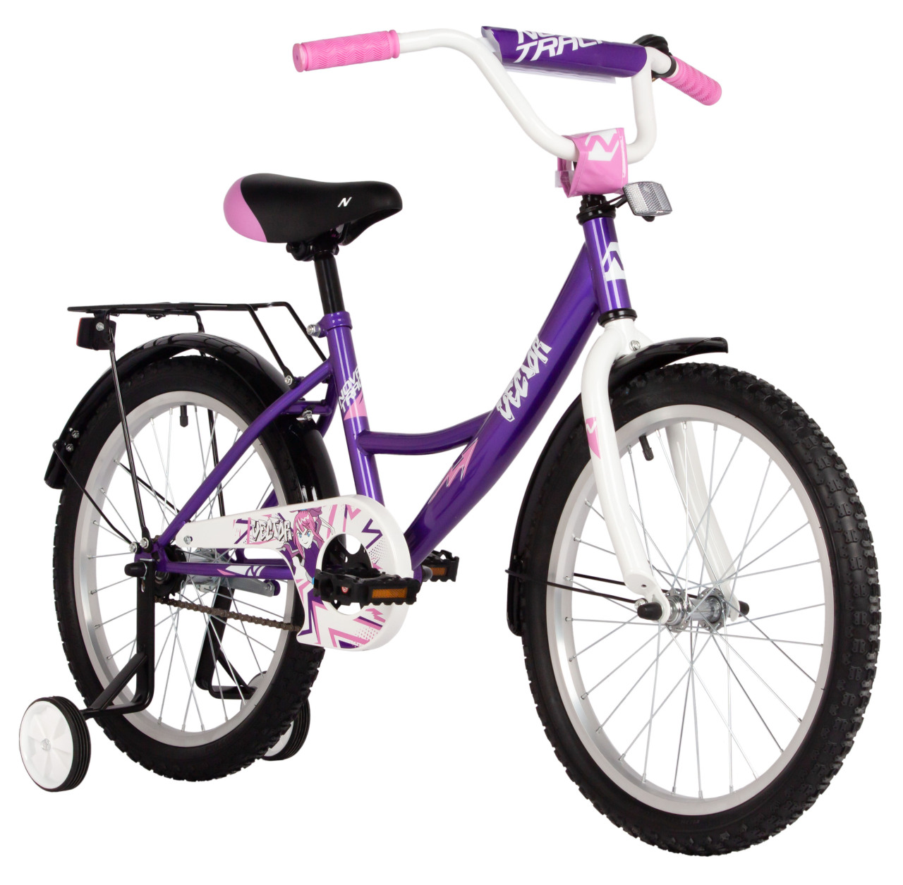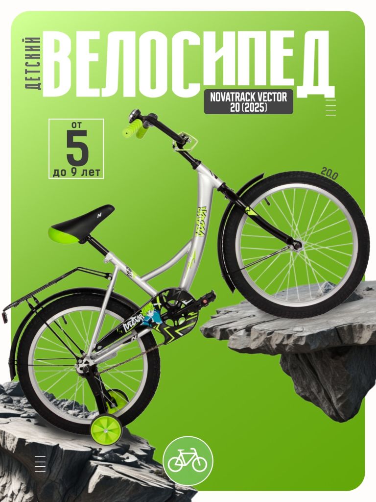 Велосипед, предназначенный для детей в возрасте от пяти до девяти лет, без переключения передач. Технические особенности: прочная стальная рама, жесткая стальная вилка, одинарные алюминиевые обода, ножные педальные тормоза, защита цепи, съемные боковые колеса, крылья, катафоты, мягкая накладка на руль, задний багажник, звонок. Подходит для обучения и прогулочного катания в городских условиях. Диаметр колес - 20 дюймов. Вес - 12,5 кг.