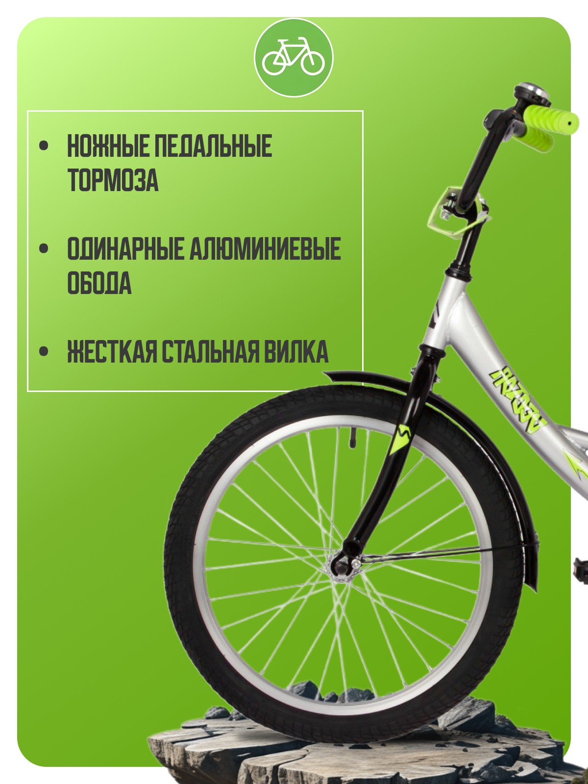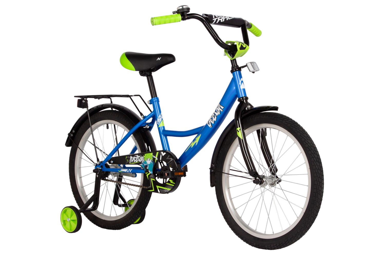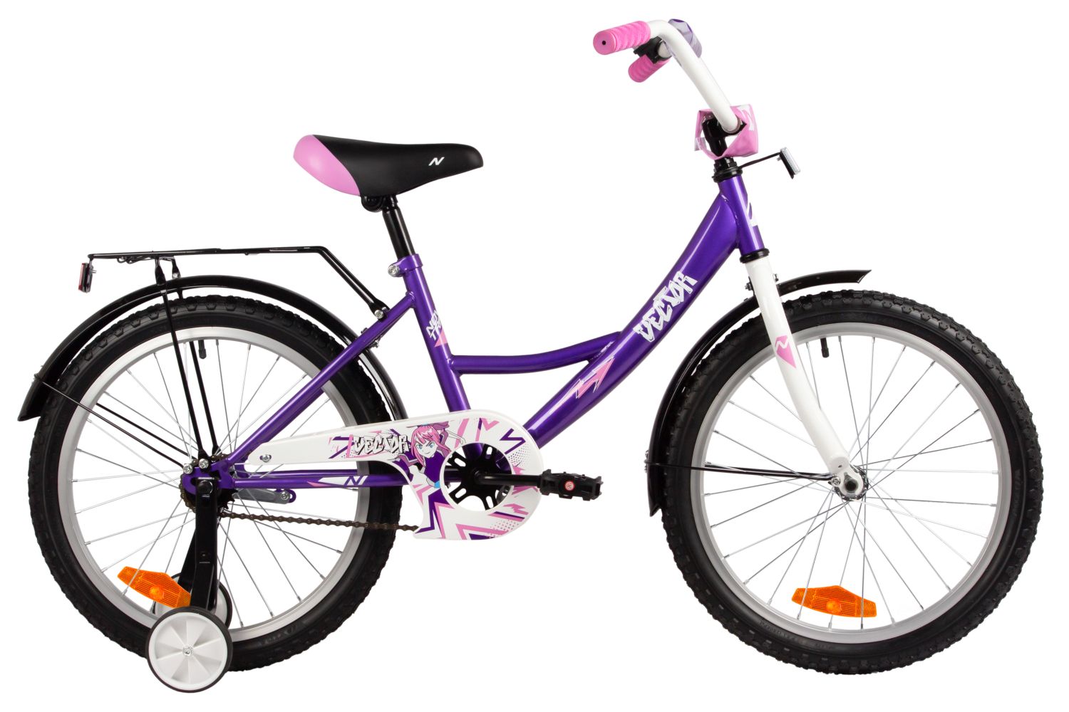 Велосипед, предназначенный для детей в возрасте от пяти до девяти лет, без переключения передач. Технические особенности: прочная стальная рама, жесткая стальная вилка, одинарные алюминиевые обода, ножные педальные тормоза, защита цепи, съемные боковые колеса, крылья, катафоты, мягкая накладка на руль, задний багажник, звонок. Подходит для обучения и прогулочного катания в городских условиях. Диаметр колес - 20 дюймов. Вес - 12,5 кг.