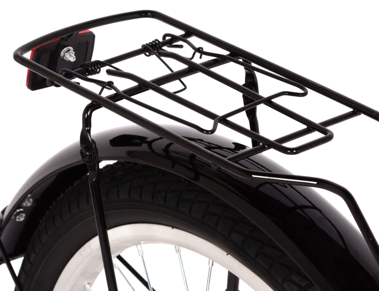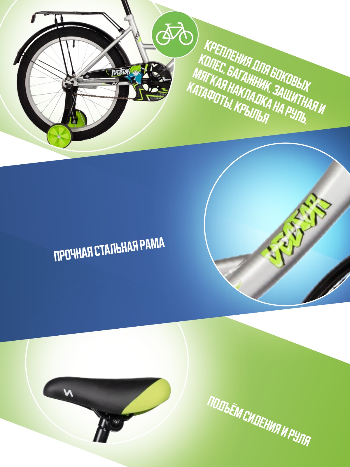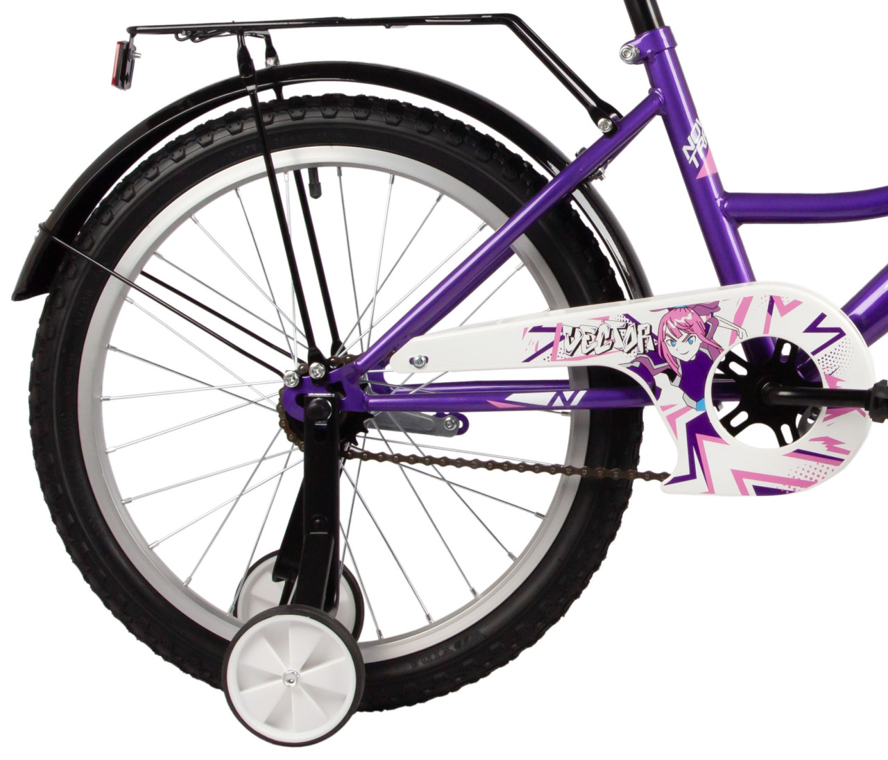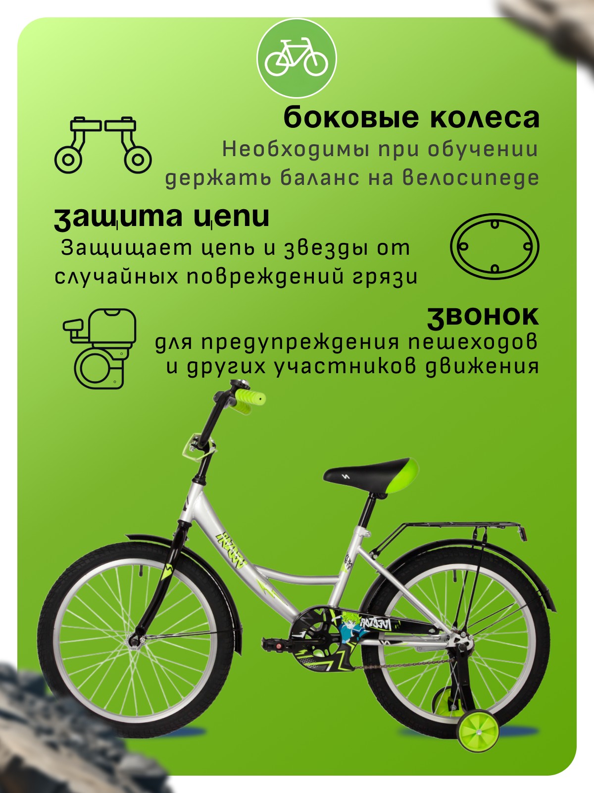 Особенности велосипеда: Багажник, Боковые колеса, Защита цепи, Защитная накладка на руль, Звонок, Катафоты, Крепления для боковых колес, Крылья, Мягкая накладка на руль, Ножной тормоз.