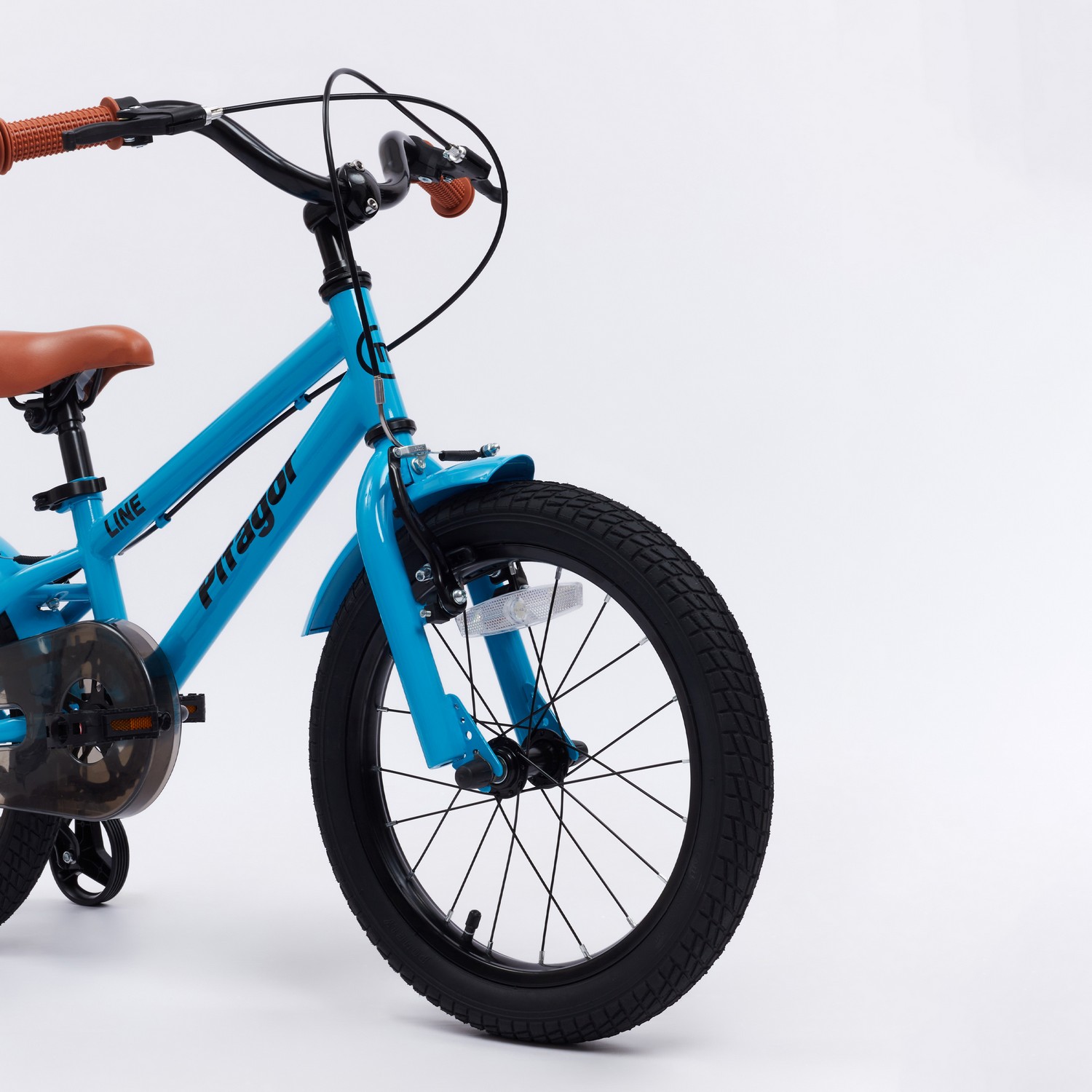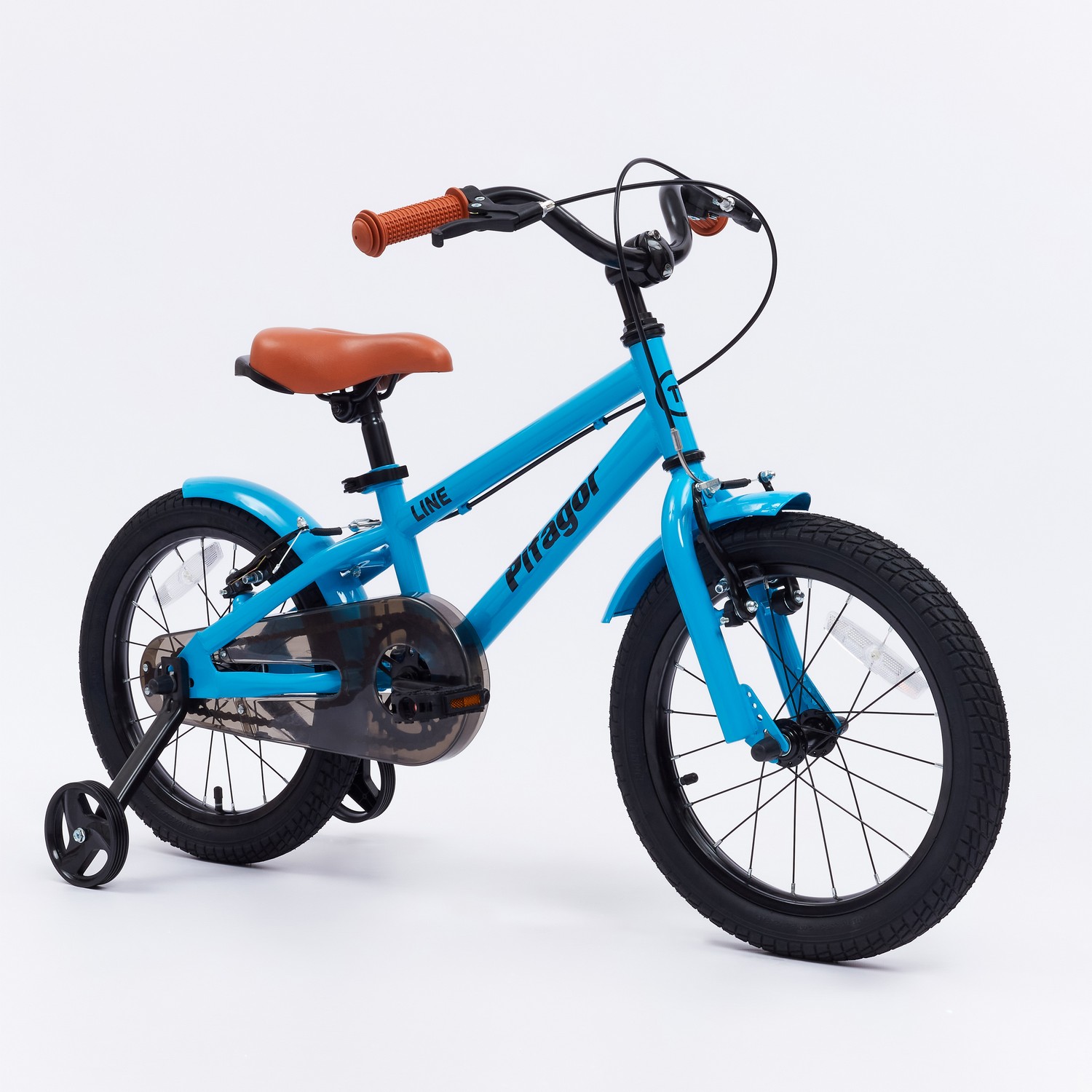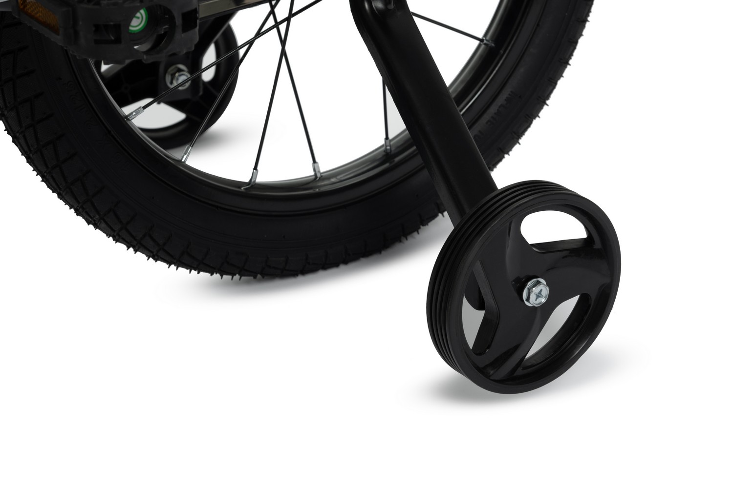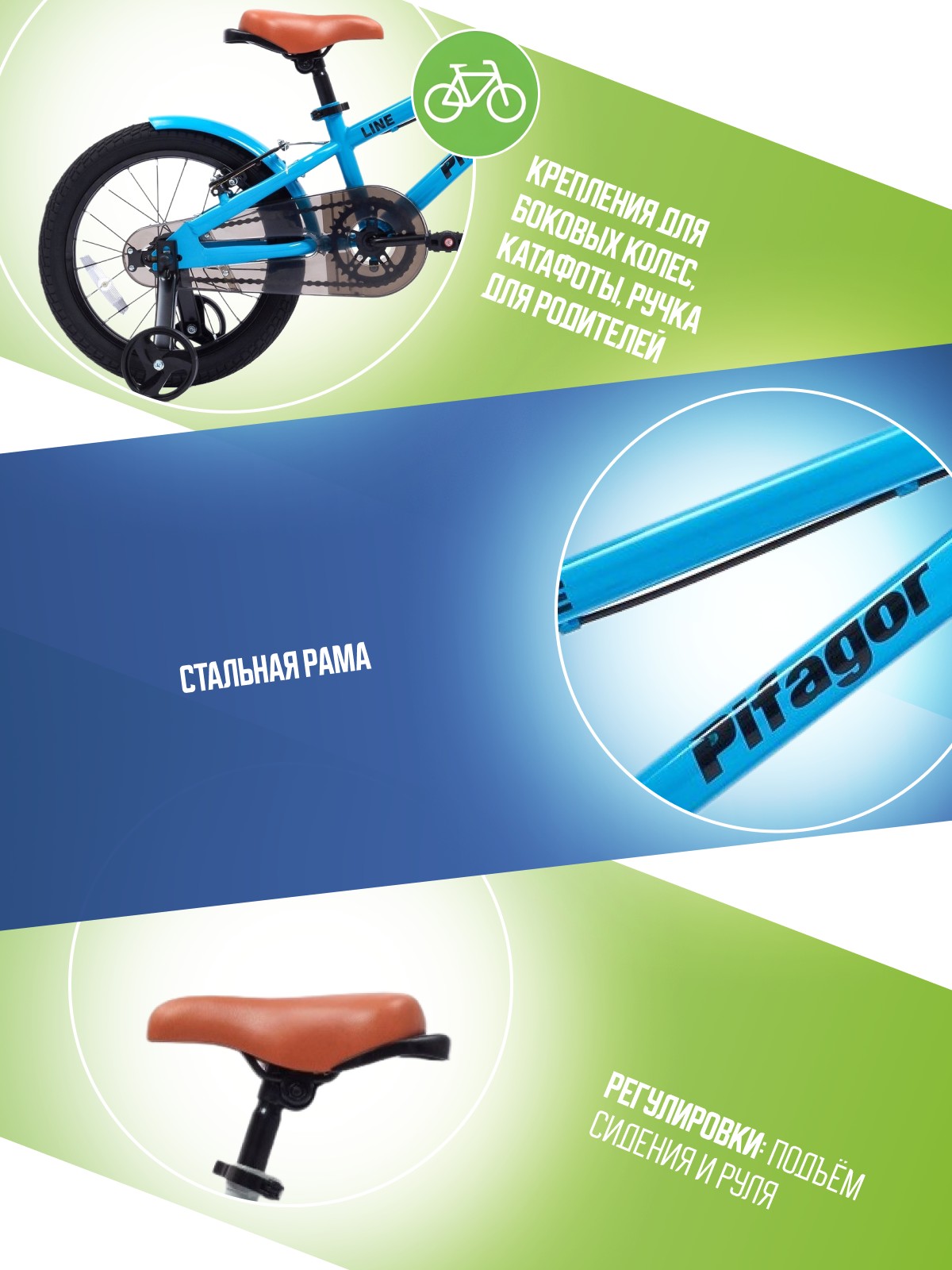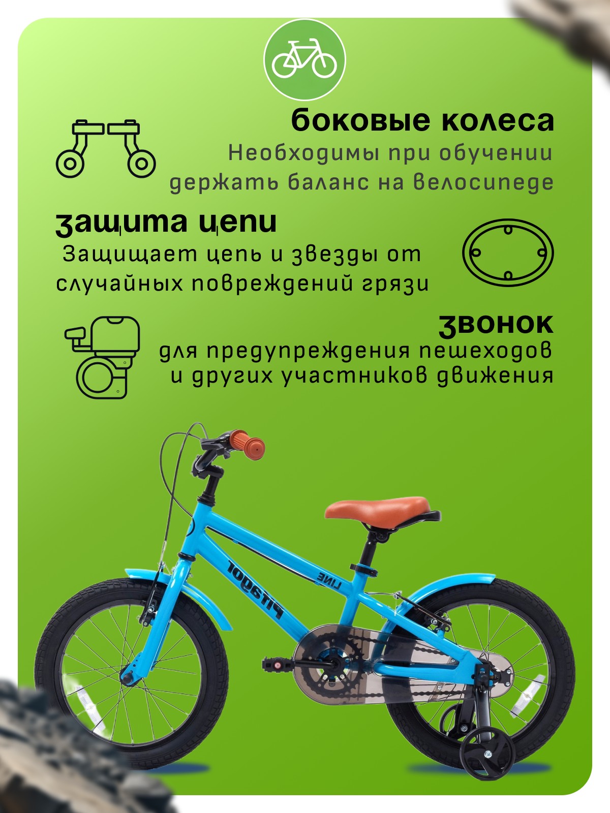 Особенности велосипеда: Боковые колеса, Защита цепи, Звонок, Катафоты, Крепления для боковых колес, Ножной тормоз, Ручка для родителей.