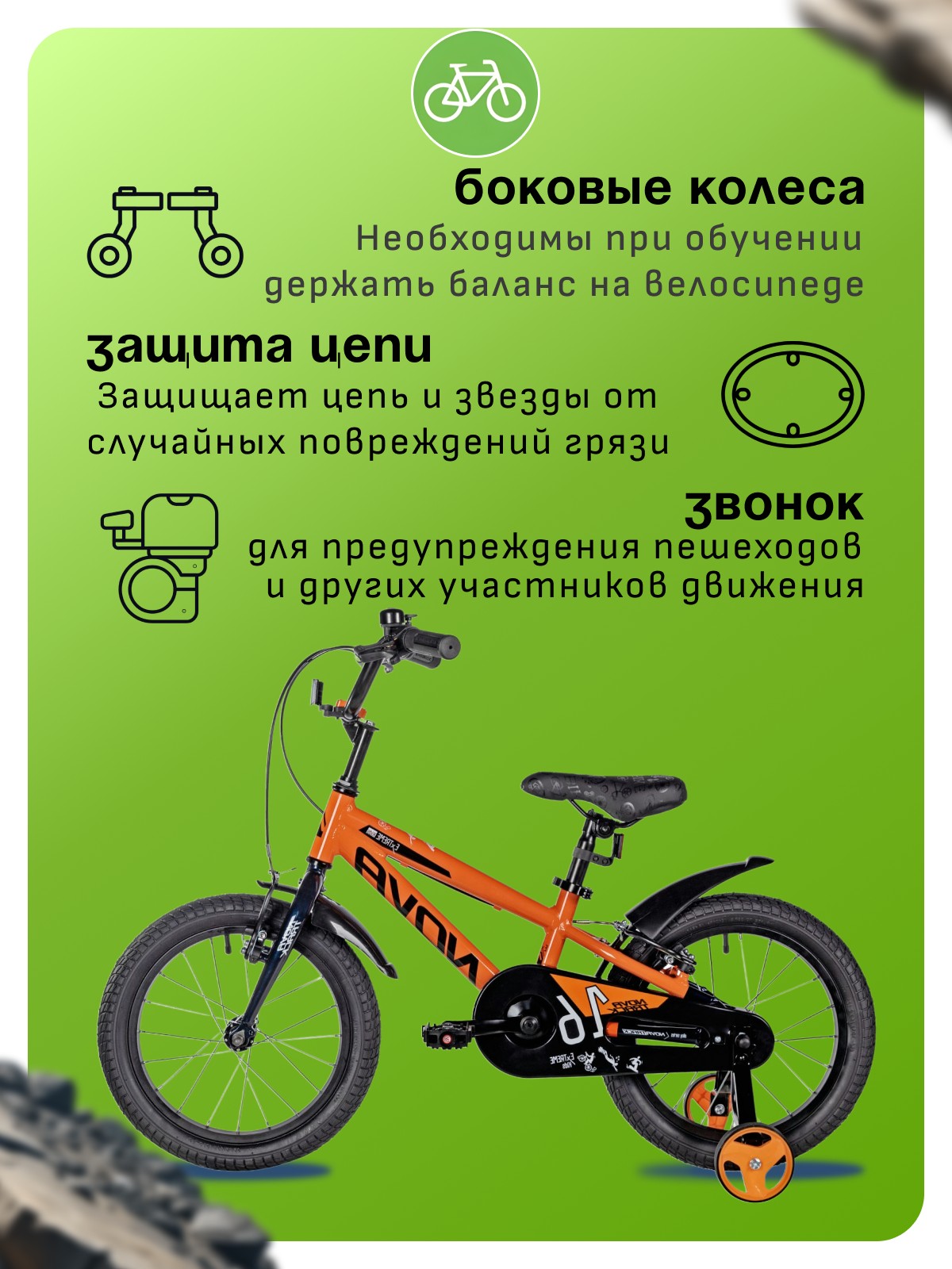 Особенности велосипеда: Алюминиевая рама, Боковые колеса, Защита цепи, Звонок, Катафоты, Крепления для боковых колес, Крылья.