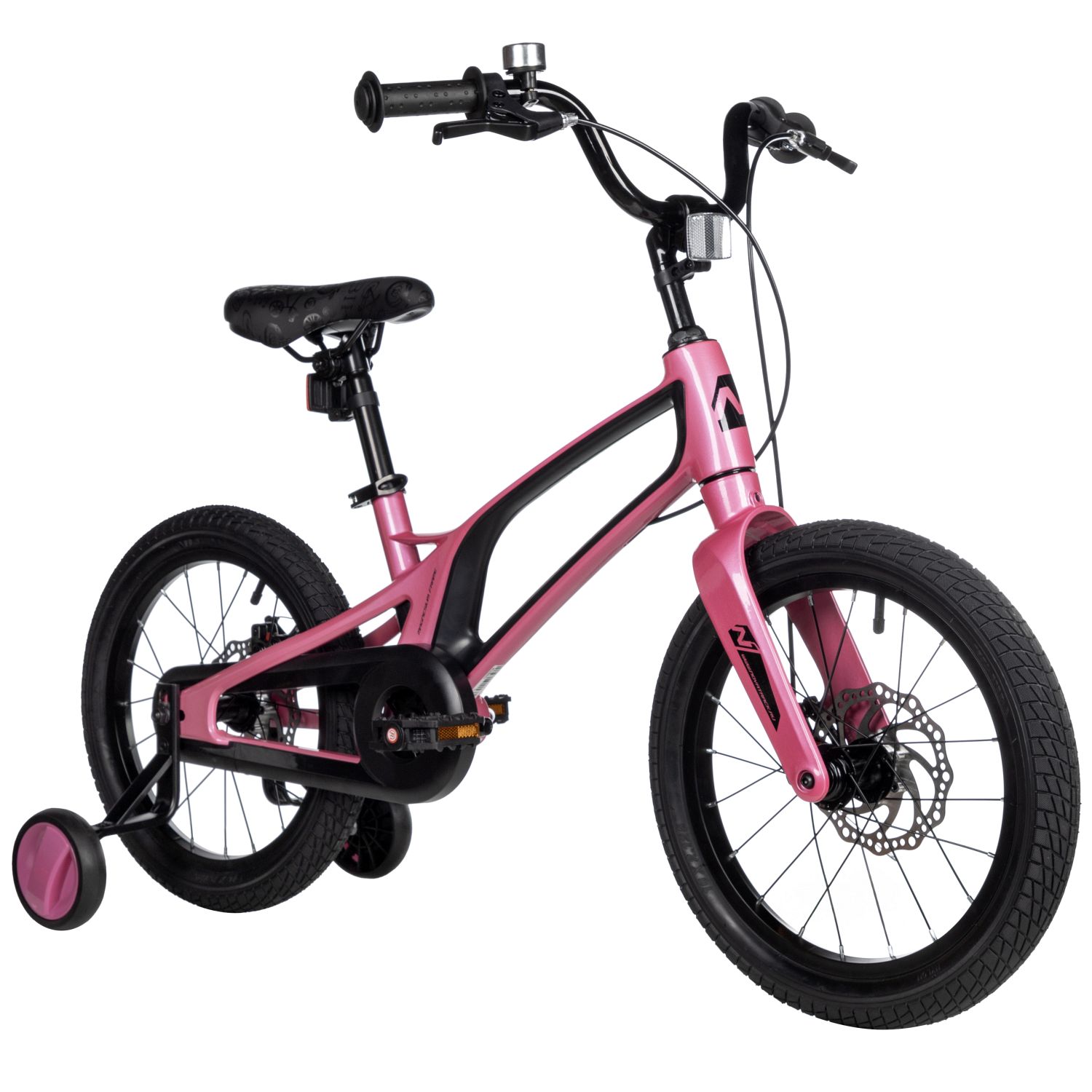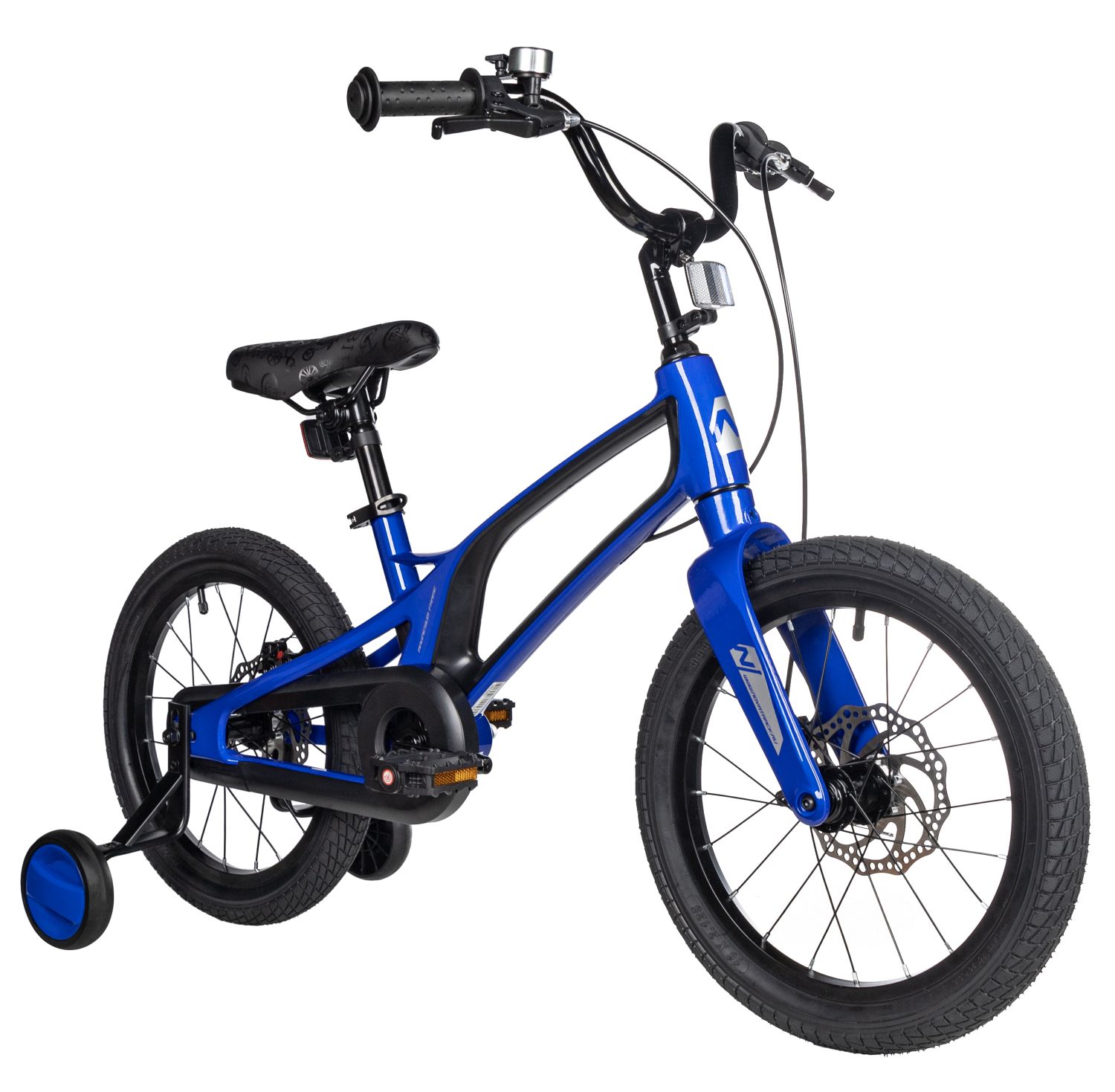 Велосипед, предназначенный для детей в возрасте от трех до шести лет, без переключения передач. Технические особенности: легкая рама из магниевого сплава, жесткая вилка из магниевого сплава, одинарные алюминиевые обода (ниппель AV), дисковые механические тормоза Sparkle (роторы 140/140 мм), полная защита цепи, съемные боковые колеса, звонок, катафоты. Подходит для обучения и прогулочного катания в городских условиях. Диаметр колес - 16 дюймов. Вес - 9,3 кг.