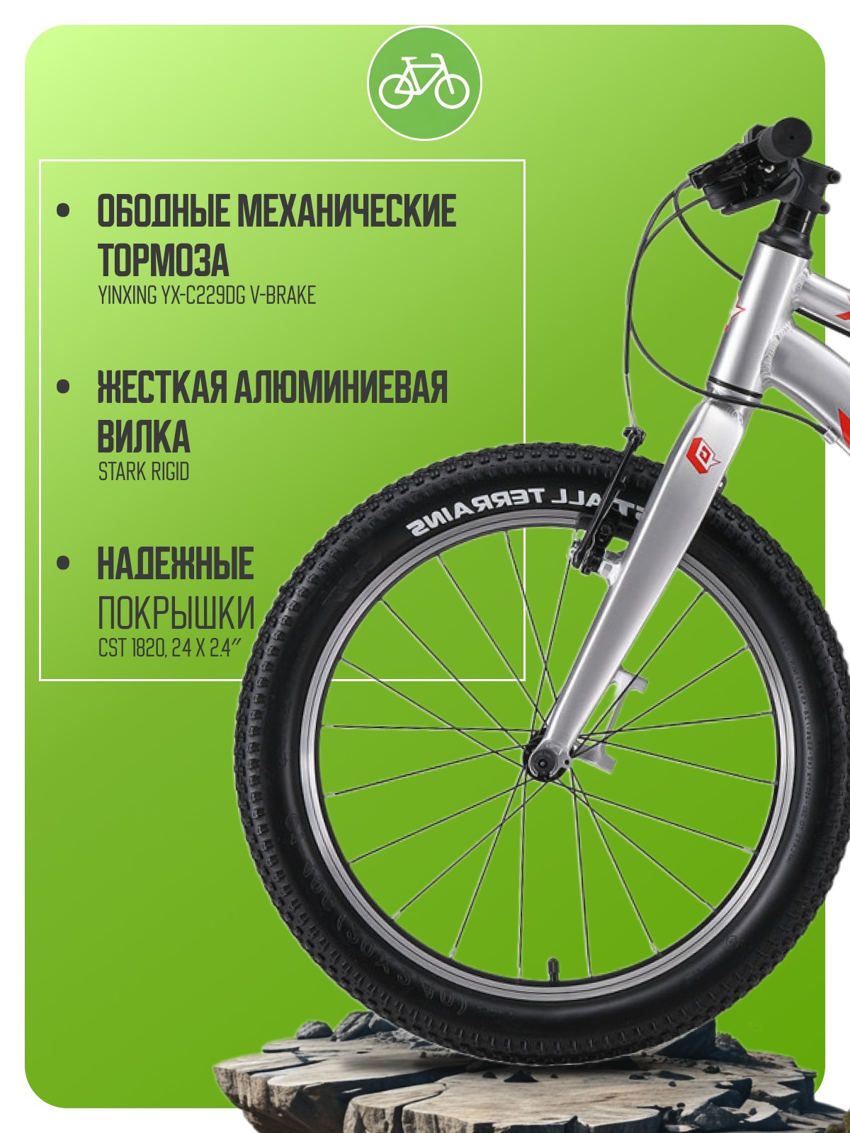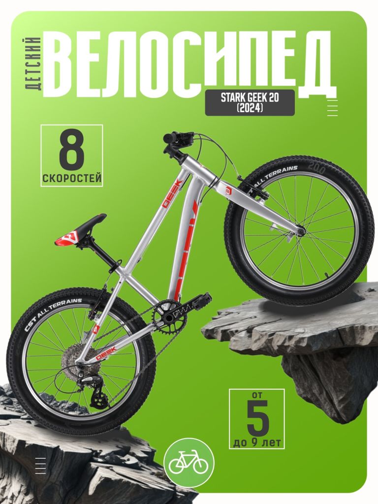 Велосипед, предназначенный для детей в возрасте от пяти до девяти лет, с оборудованием начального любительского класса, 8 скоростей. Технические особенности: легкая алюминиевая рама AL-6061 (гидроформинг, двойной баттинг), жесткая алюминиевая вилка Stark Rigid, двойные алюминиевые обода Citron DP-18E, ободные механические тормоза Yinxing YX-C229DG V-brake. Подходит для обучения и прогулочного катания в городских условиях. Диаметр колес - 20 дюйма. Вес - 8,8 кг.