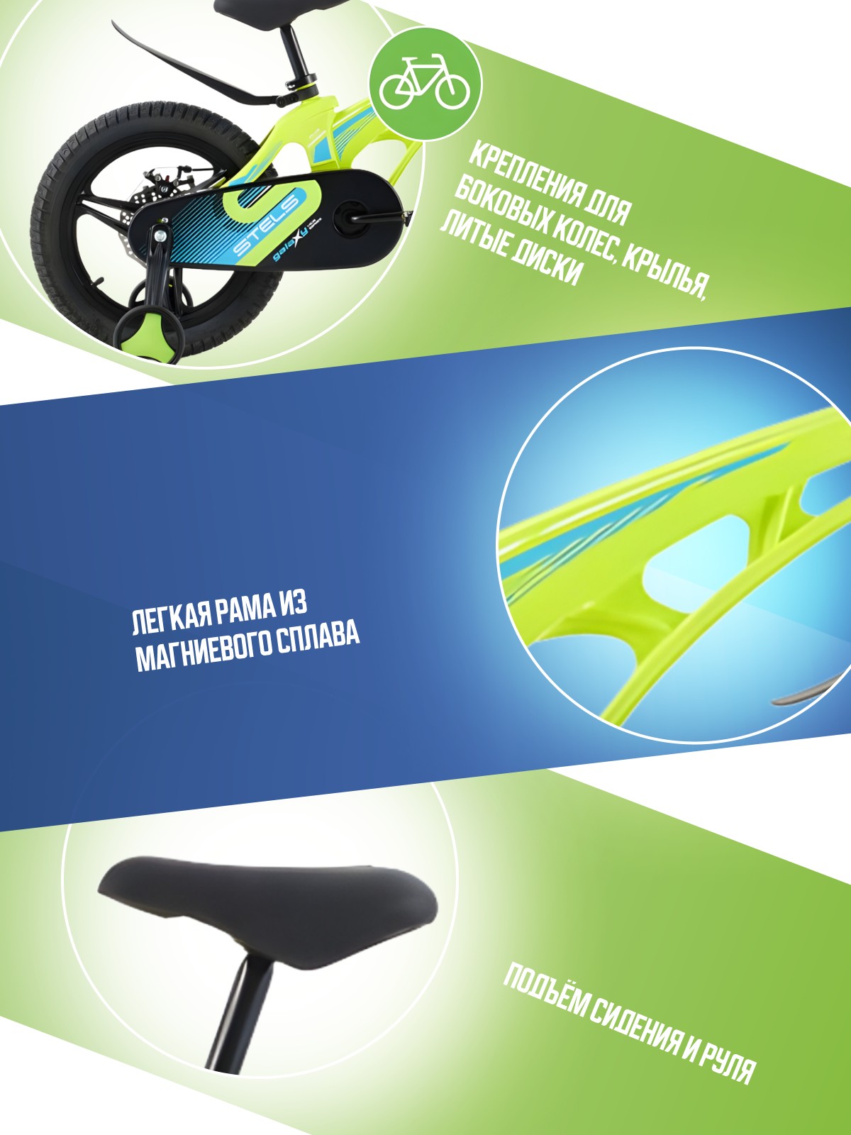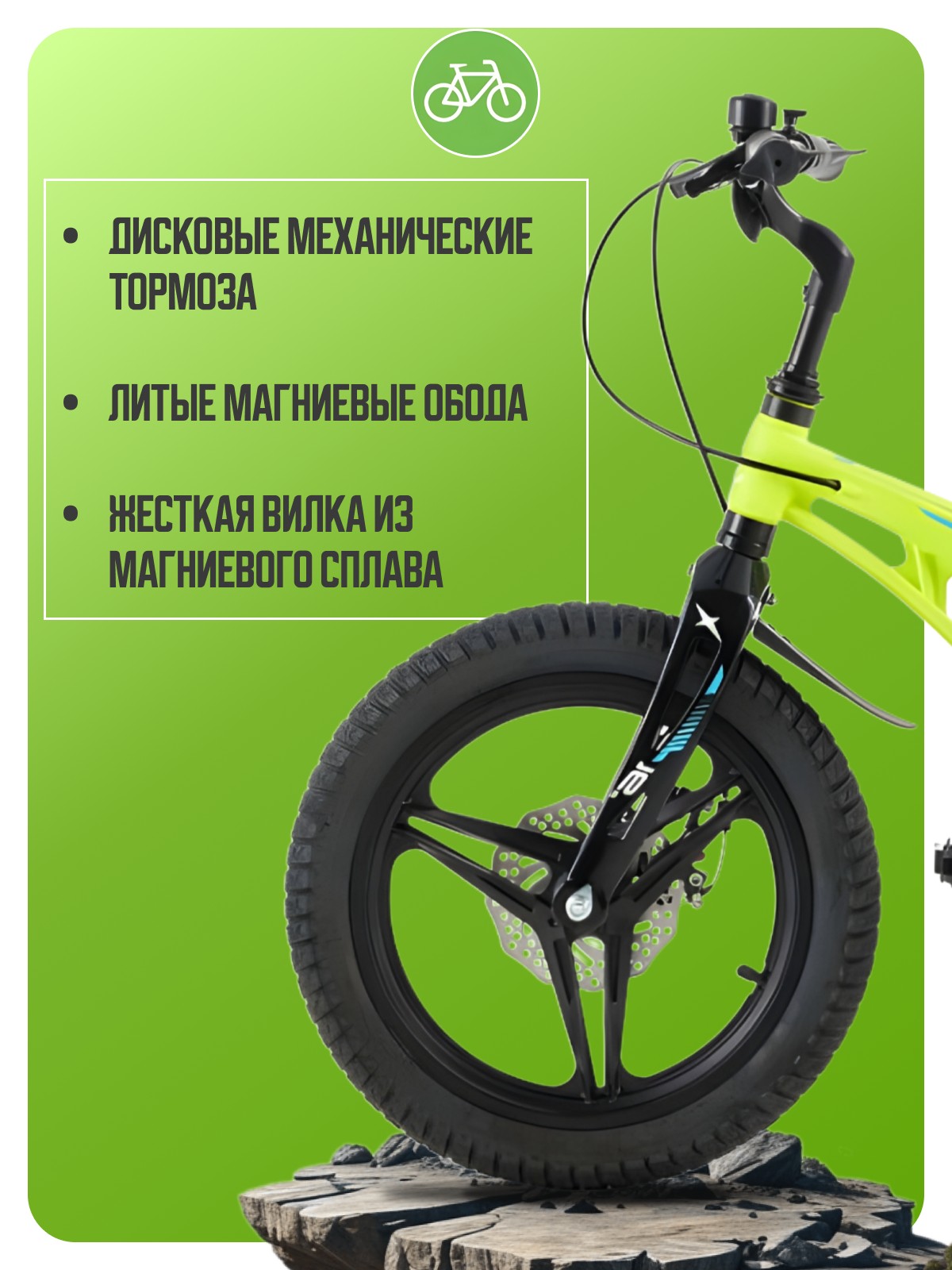 Велосипед, предназначенный для детей в возрасте от трех до шести лет, без переключения передач. Технические особенности: легкая рама из магниевого сплава, жесткая вилка из магниевого сплава, литые магниевые обода (под AV ниппель), дисковые механические тормоза (роторы 140/140 мм), защита цепи, съемные боковые колеса, пластиковые крылья, звонок. Подходит для обучения и прогулочного катания в городских условиях. Диаметр колес - 16 дюймов. Вес - 9,5 кг.