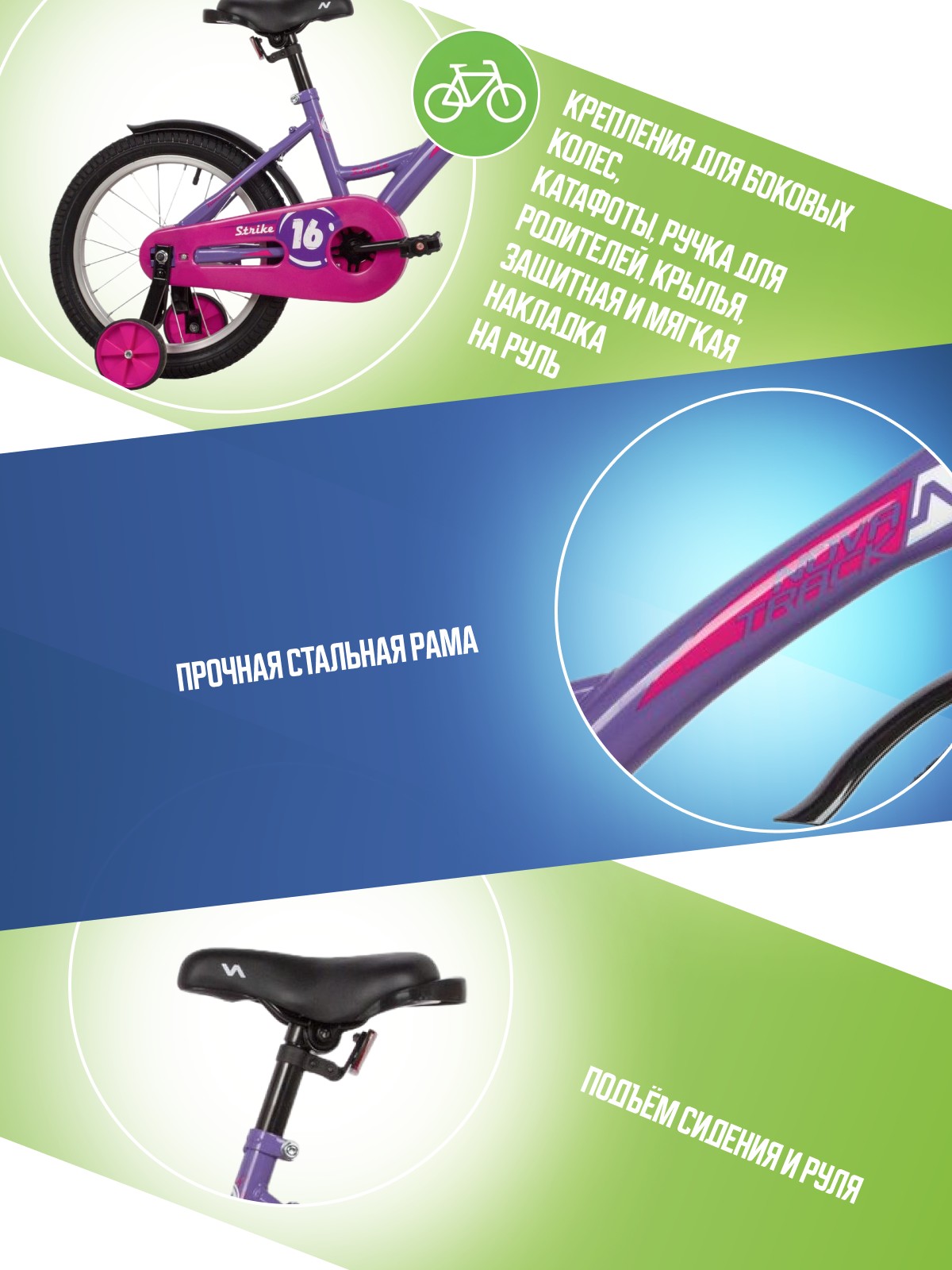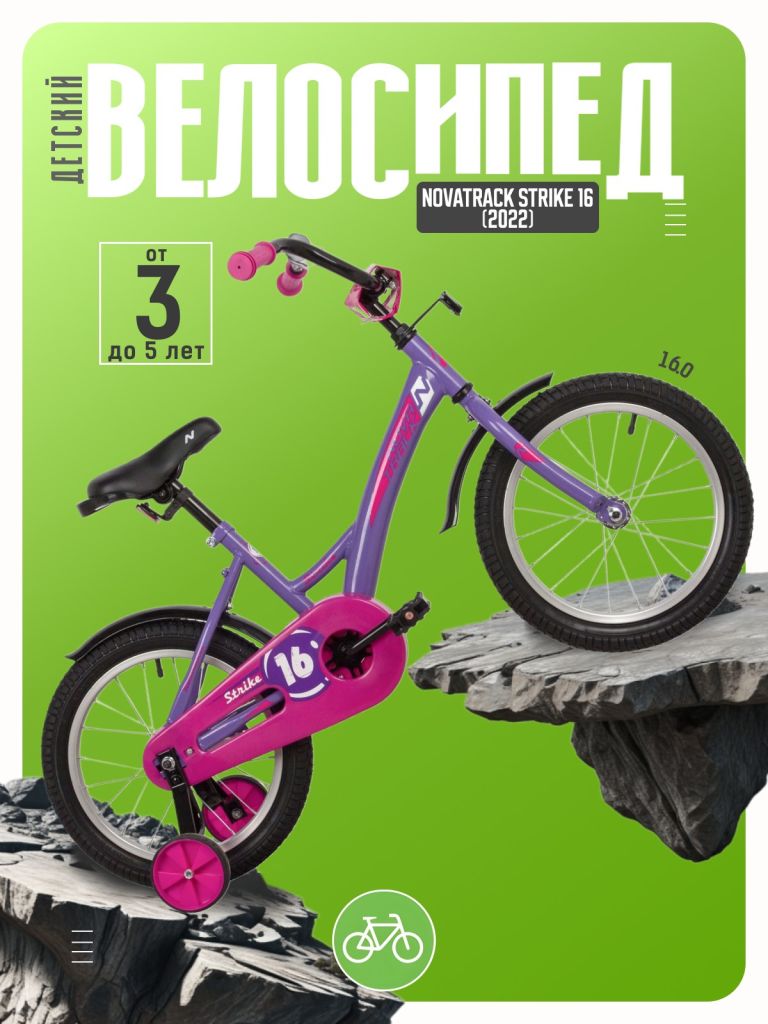 Велосипед, предназначенный для детей в возрасте от трех до шести лет, без переключения передач. Технические особенности: прочная стальная рама, жесткая стальная вилка, одинарные алюминиевые обода, ножные педальные тормоза, полная защита цепи, крылья, съемные боковые колеса, мягкая накладка на руле, звонок, багажник. Подходит для обучения и легких прогулок. Диаметр колес - 16 дюймов. Вес - 9,7 кг.