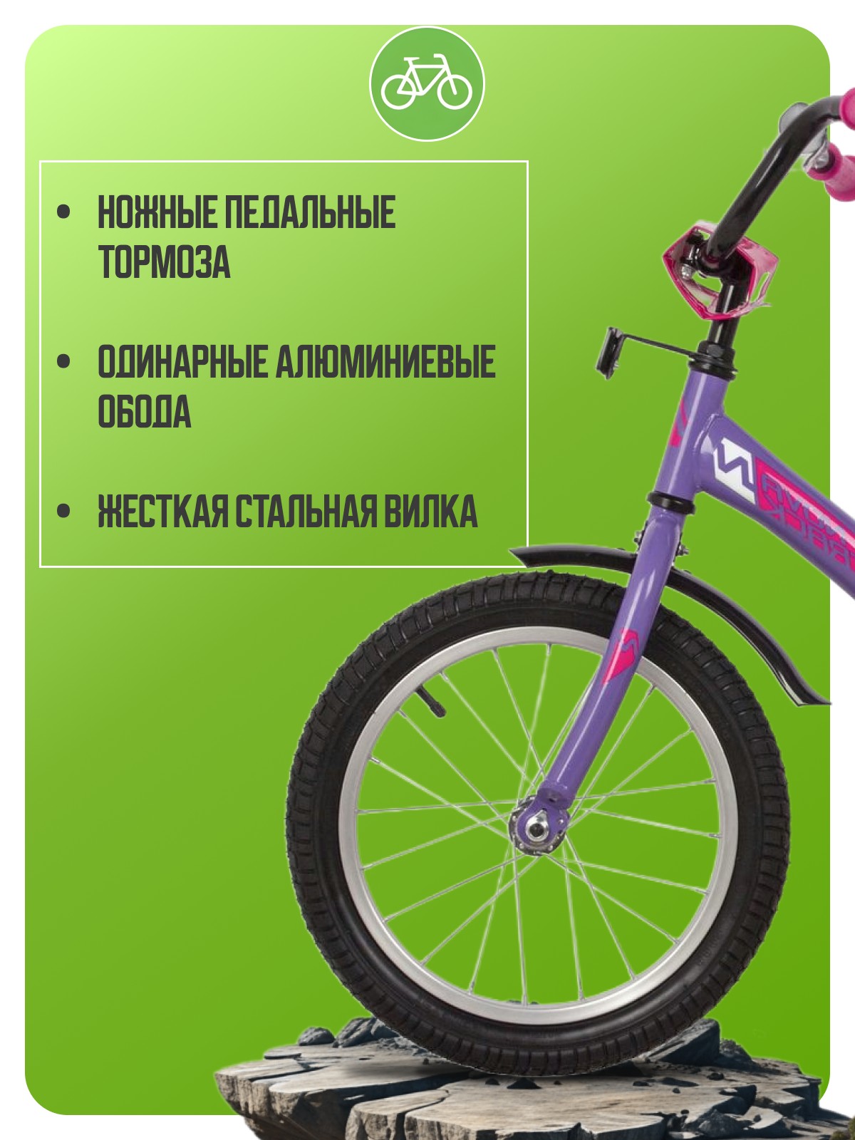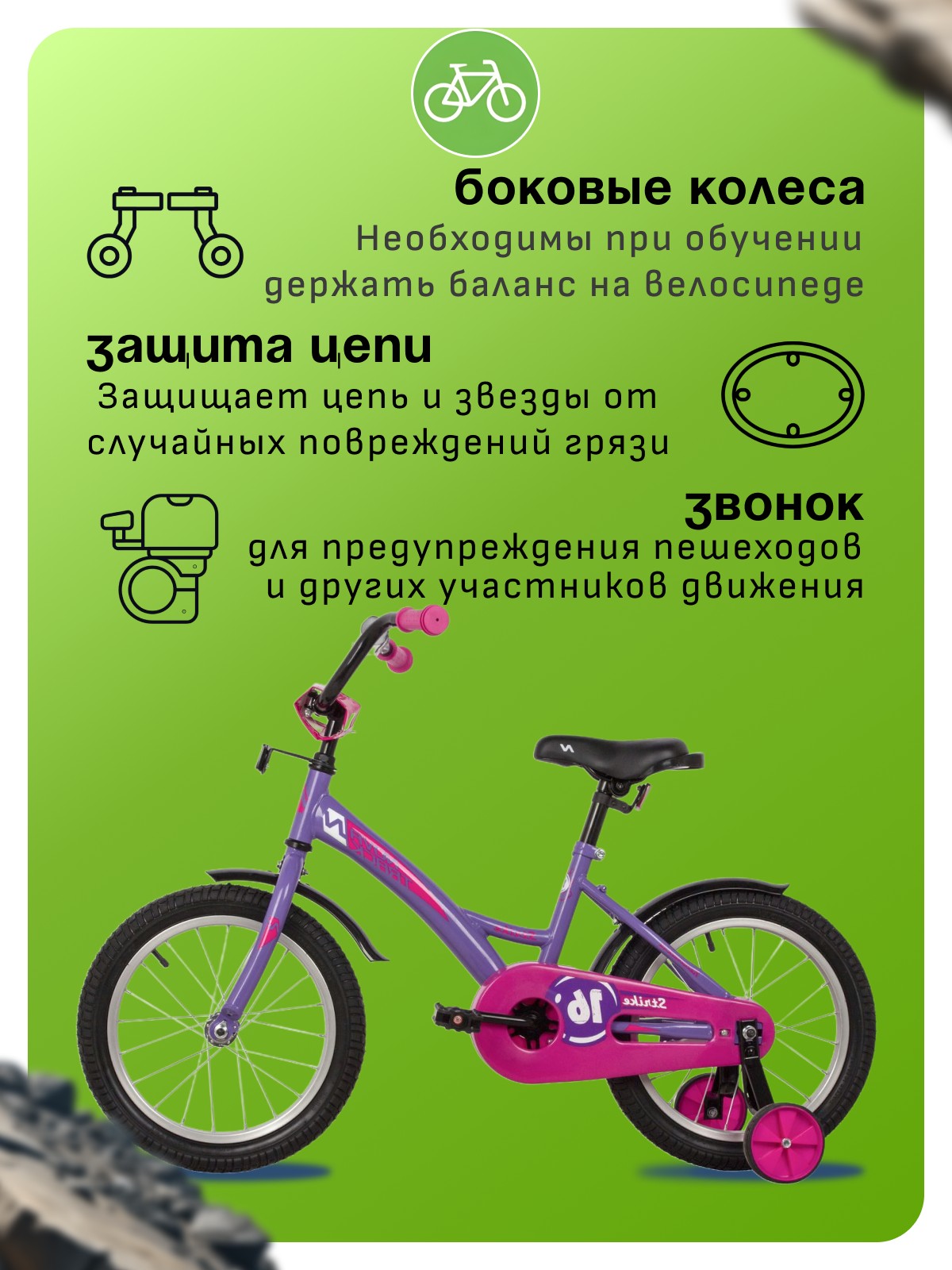 Особенности велосипеда: Боковые колеса, Защита цепи, Защитная накладка на руль, Звонок, Катафоты, Крепления для боковых колес, Крылья, Мягкая накладка на руль, Ножной тормоз, Ручка для родителей.