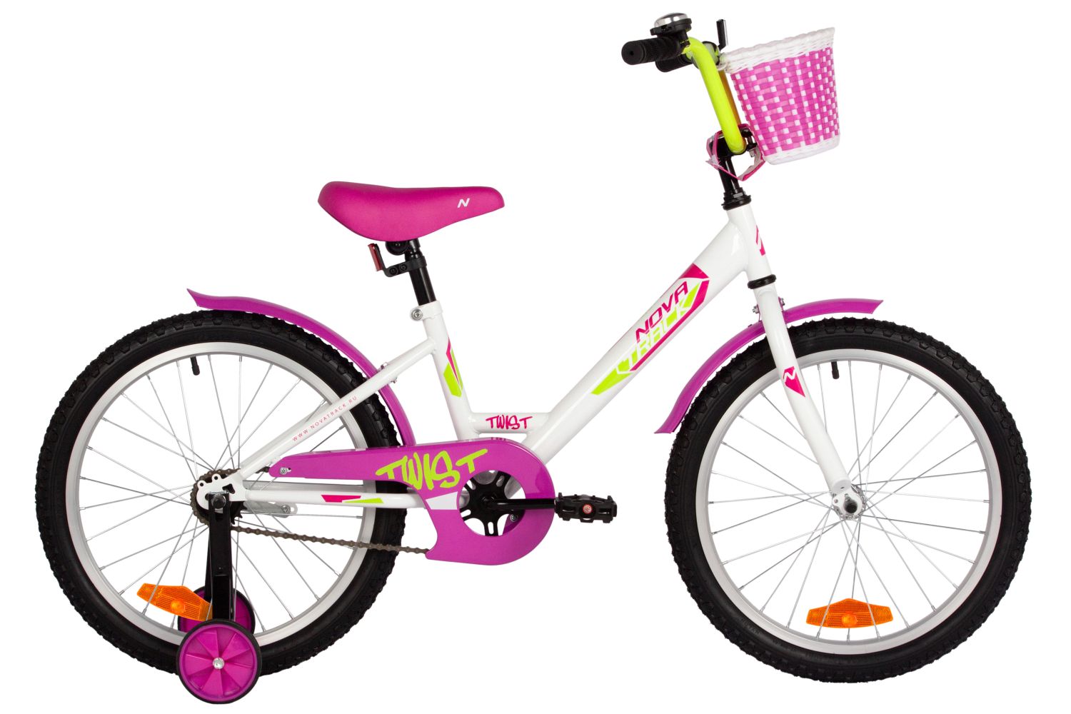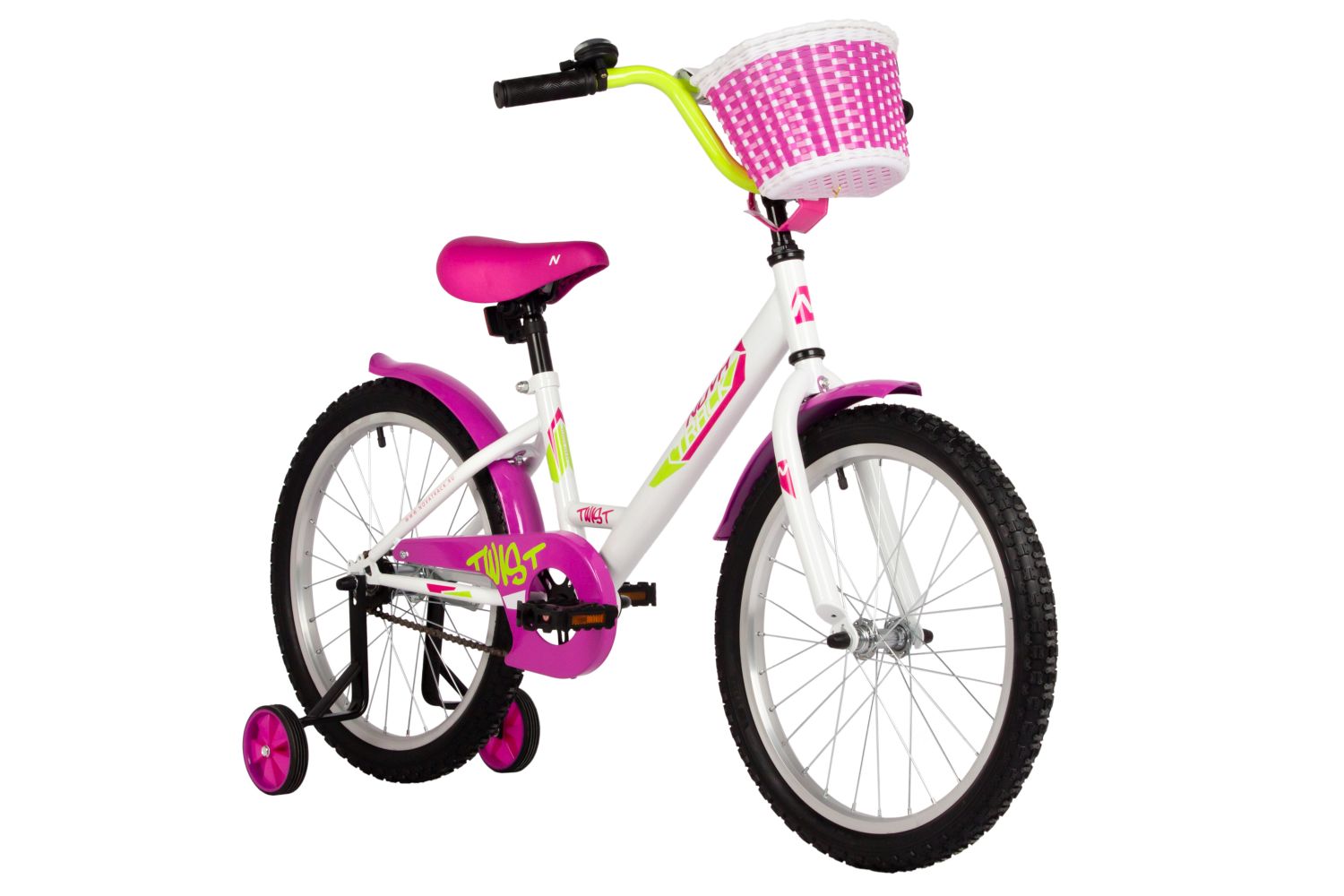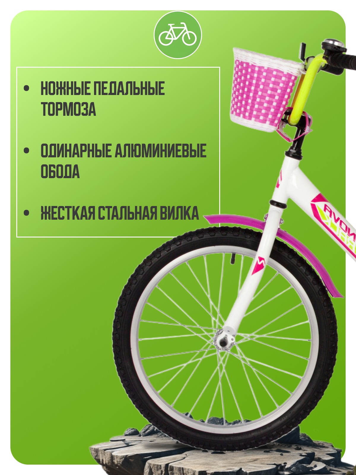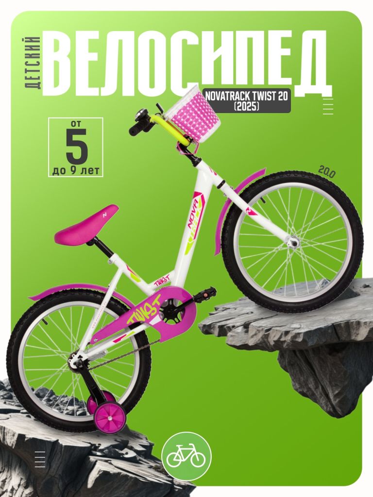 Велосипед, предназначенный для детей в возрасте от пяти до девяти лет, без переключения передач. Технические особенности: прочная стальная рама, жесткая стальная вилка, одинарные алюминиевые обода, ножные педальные тормоза, защита цепи, съемные боковые колеса, крылья, катафоты, мягкая накладка на руль, передняя корзинка, звонок. Подходит для обучения и прогулочного катания в городских условиях. Диаметр колес - 20 дюймов. Вес - 12,5 кг.