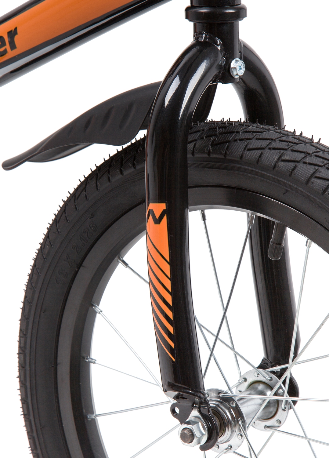 Велосипед, предназначенный для детей в возрасте от трех до шести лет, без переключения передач. Технические особенности: стальная рама, жесткая стальная вилка, одинарные алюминиевые обода, ножные педальные тормоза, полная защита цепи, пластиковые крылья, звонок, боковые колёса. Подходит для обучения и прогулочного катания в городских условиях. Диаметр колес - 16 дюймов. Вес - 10,1 кг.