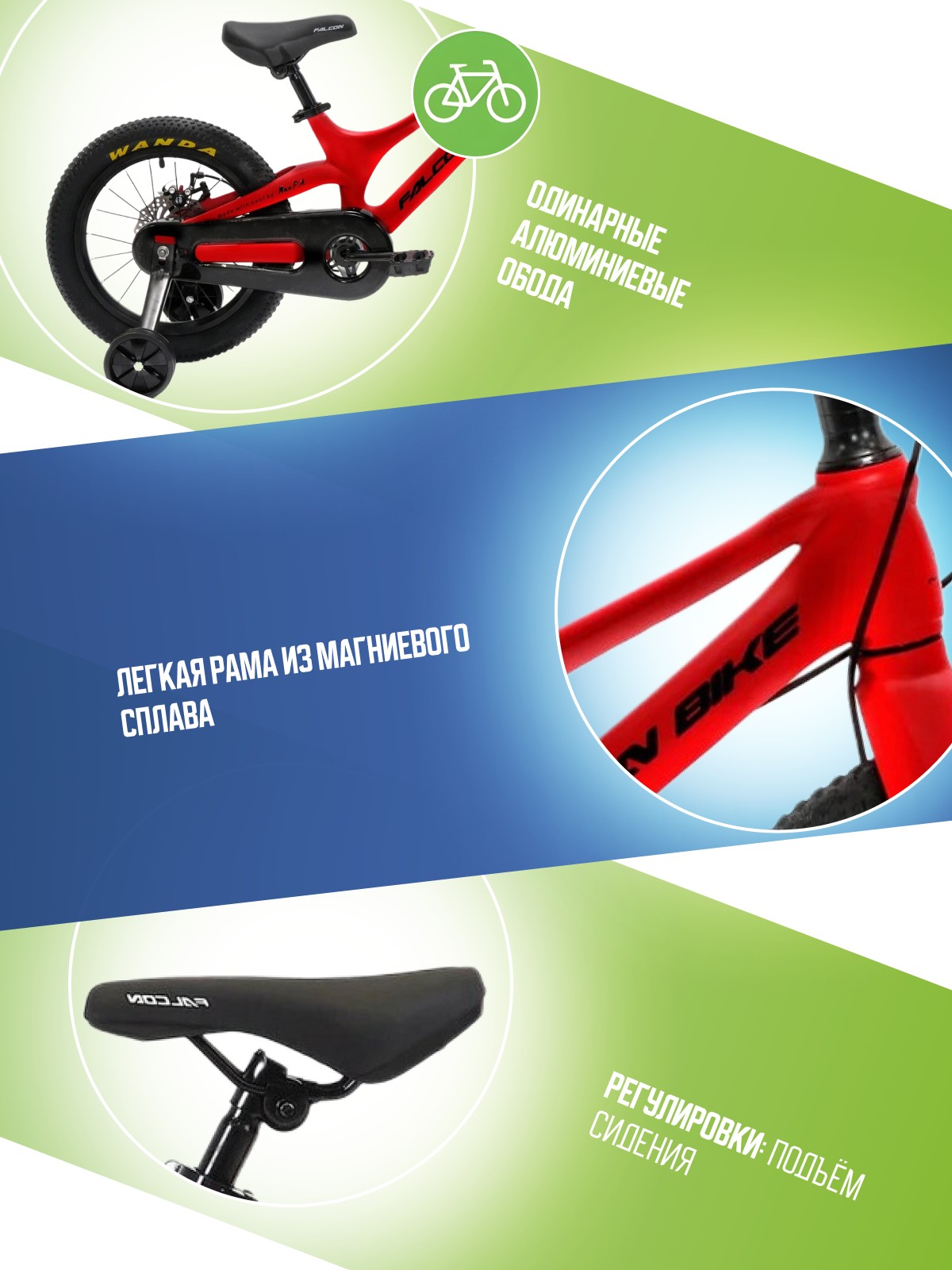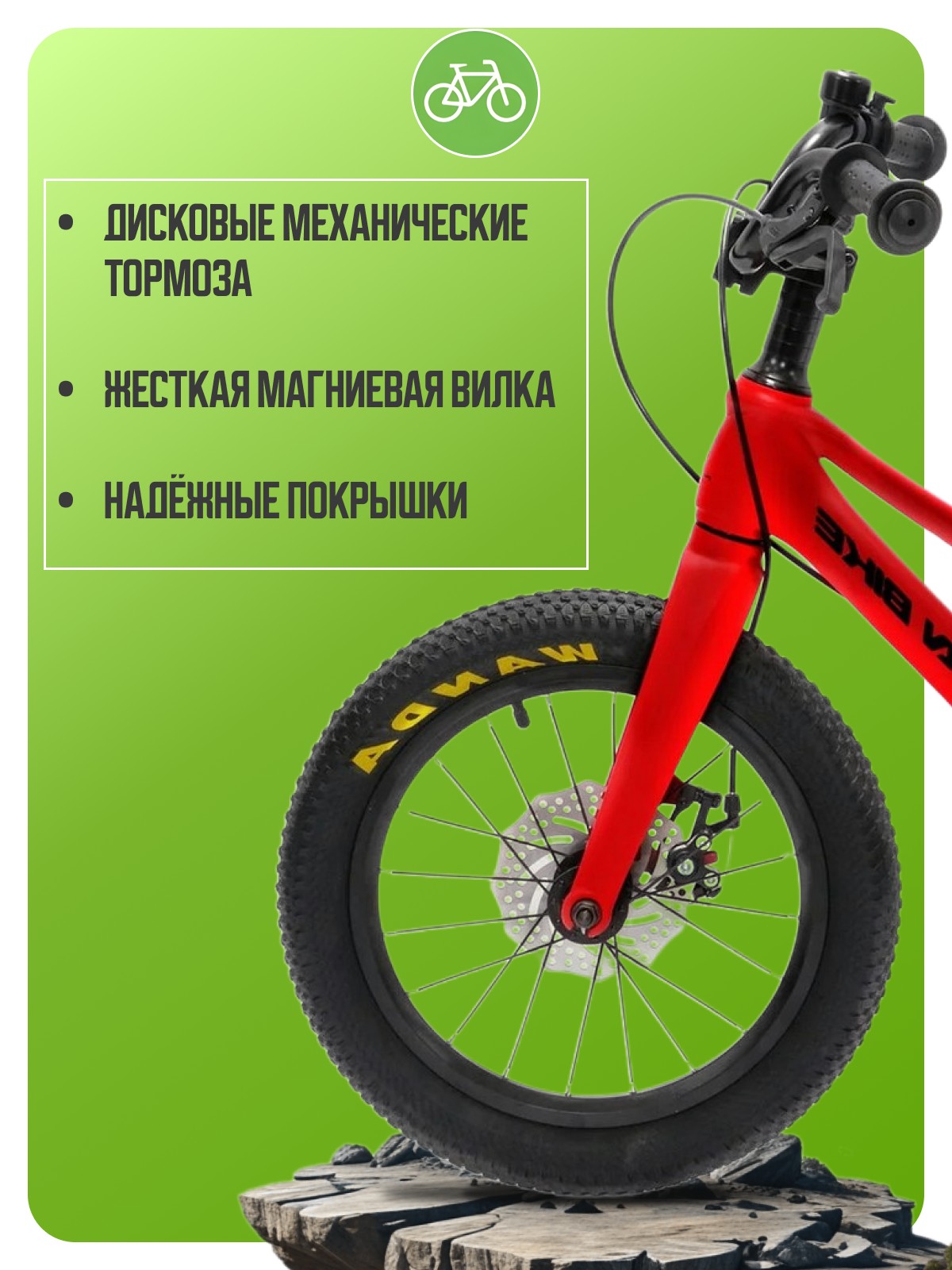 Велосипед, предназначенный для детей в возрасте от 3 до 5 лет, без переключения передач. Технические характеристики: легкая рама из магниевого сплава, жесткая магниевая вилка, одинарные алюминиевые обода, дисковые механические тормоза, полная защита цепи, съемные боковые колеса, звонок. Подходит для обучения и прогулочного катания в городских условиях. Диаметр колес - 16 дюймов. Вес - 9,5 кг.