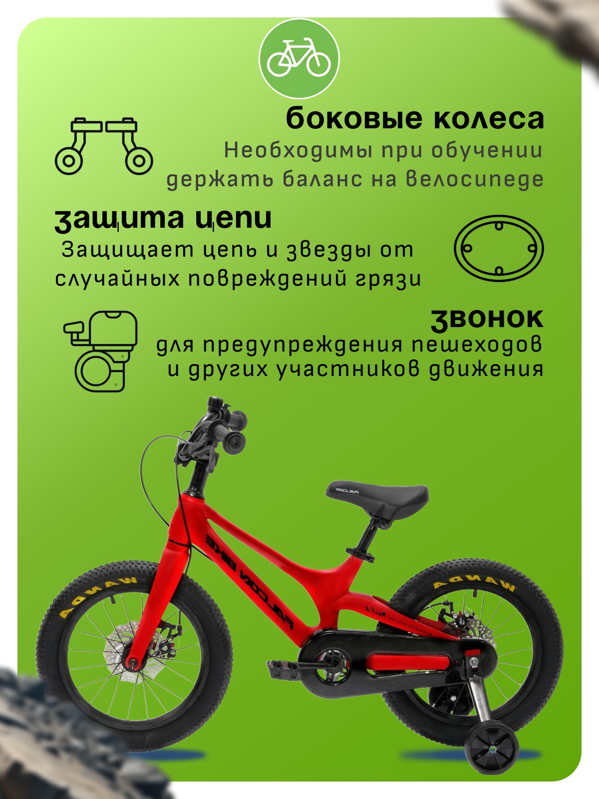 Особенности велосипеда: Боковые колеса, Дисковые тормоза, Защита цепи, Звонок.