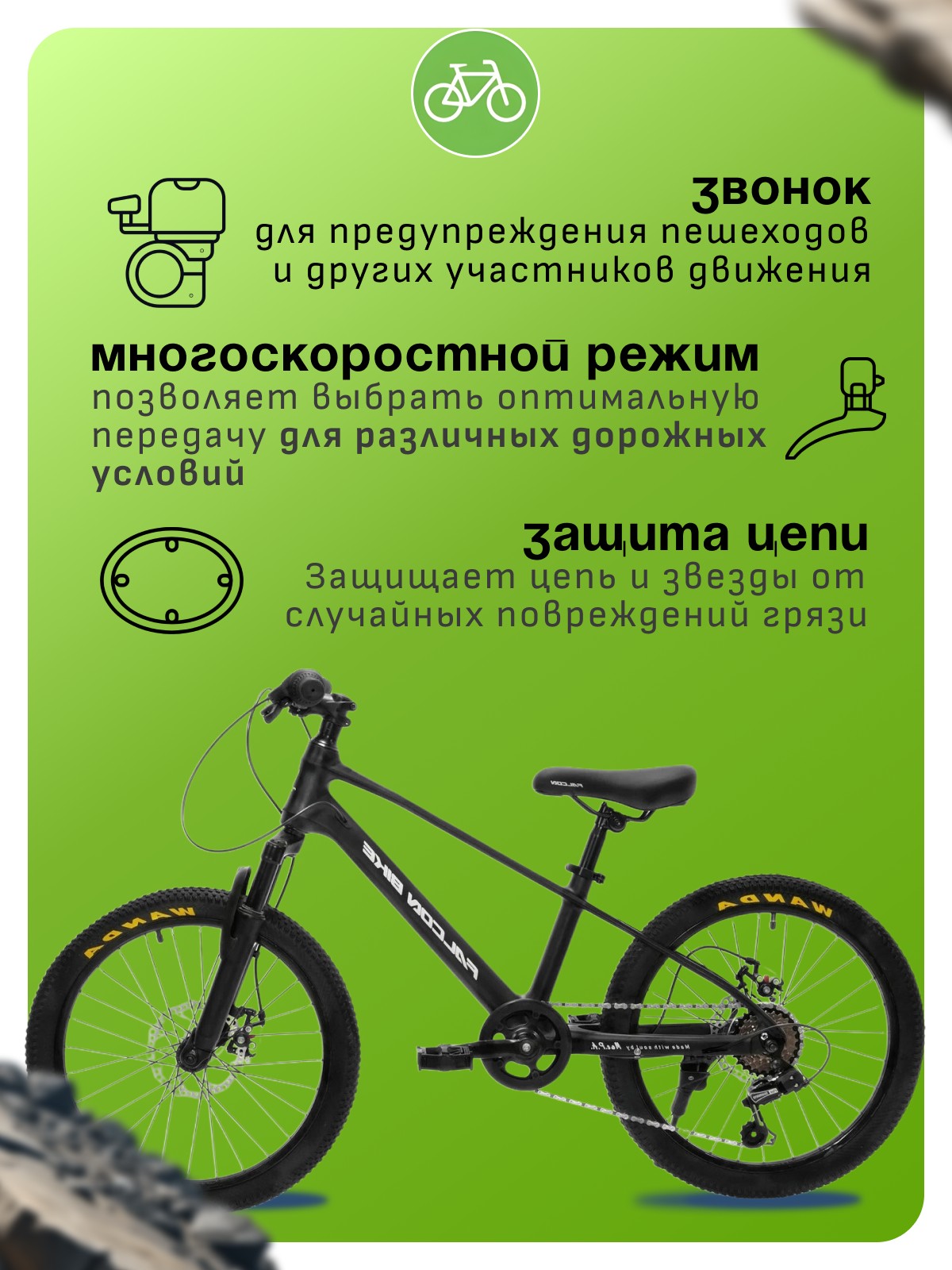 Особенности велосипеда: Амортизационная вилка, Двойные обода, Дисковые тормоза, Защита цепи, Звонок, Многоскоростной, Подножка.