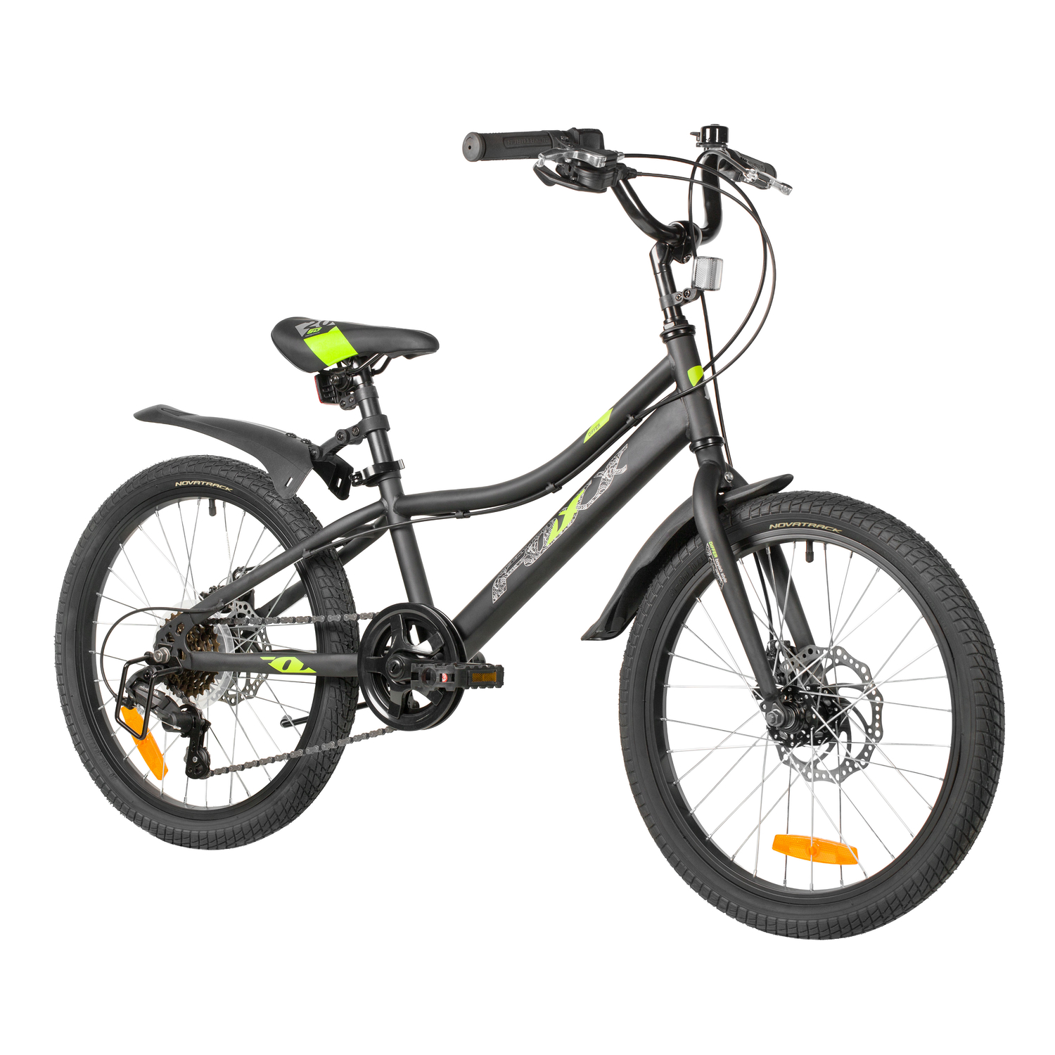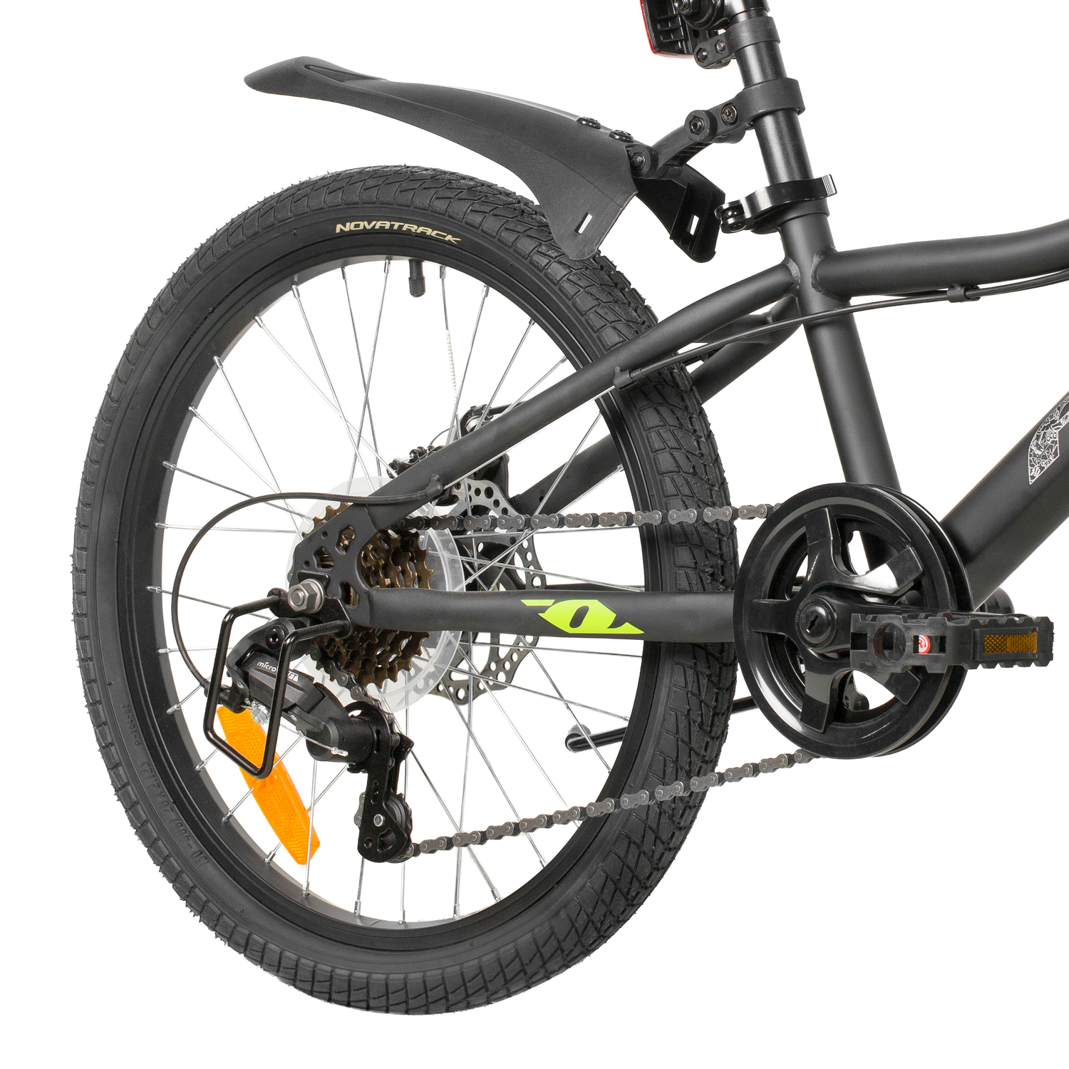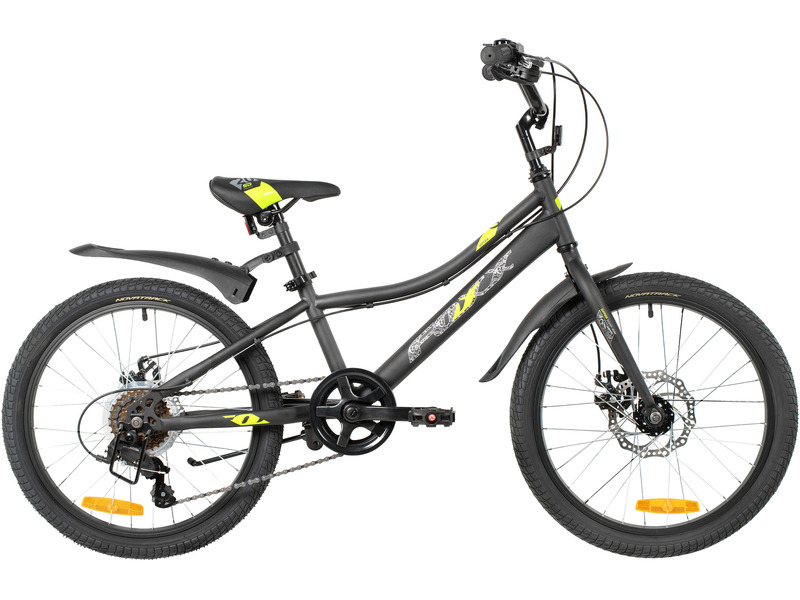 Велосипед, предназначенный для детей в возрасте от пяти до девяти лет, с оборудованием начального класса Microshift, 6 скоростей. Технические особенности: прочная стальная рама (открытая проводка, прямой рулевой стакан, кареточный стакан BSA, интегрированный петух, крепление калипера IS), жесткая стальная вилка (крепление калипера IS), двойные алюминиевые обода (под AV ниппель), дисковые механические тормоза STG (роторы 160/140 мм), защита цепи, защита заднего переключателя, катафоты, звонок, подножка. Подходит для обучения и прогулочного катания в городских условиях. Диаметр колес - 20 дюймов. Вес - 13 кг.