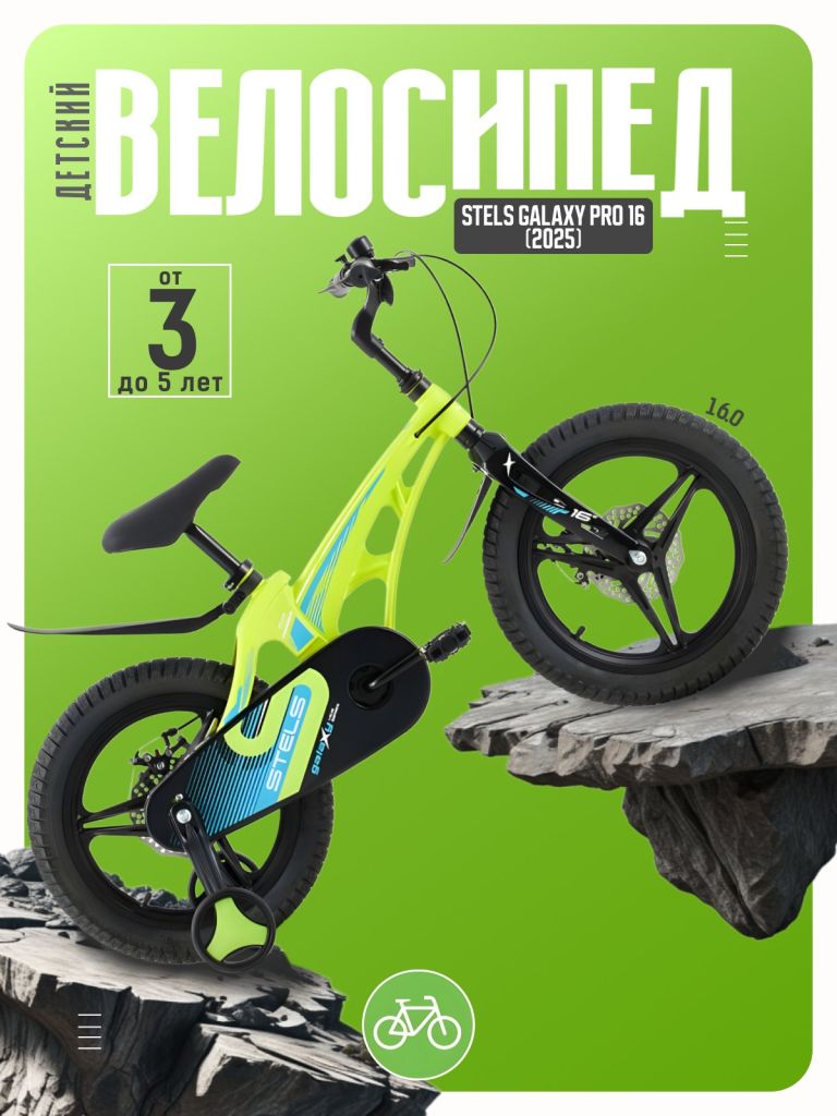 Велосипед, предназначенный для детей в возрасте от трех до шести лет, без переключения передач. Технические особенности: легкая рама из магниевого сплава, жесткая вилка из магниевого сплава, литые магниевые обода (под AV ниппель), дисковые механические тормоза (роторы 140/140 мм), защита цепи, съемные боковые колеса, пластиковые крылья, звонок. Подходит для обучения и прогулочного катания в городских условиях. Диаметр колес - 16 дюймов. Вес - 9,5 кг.