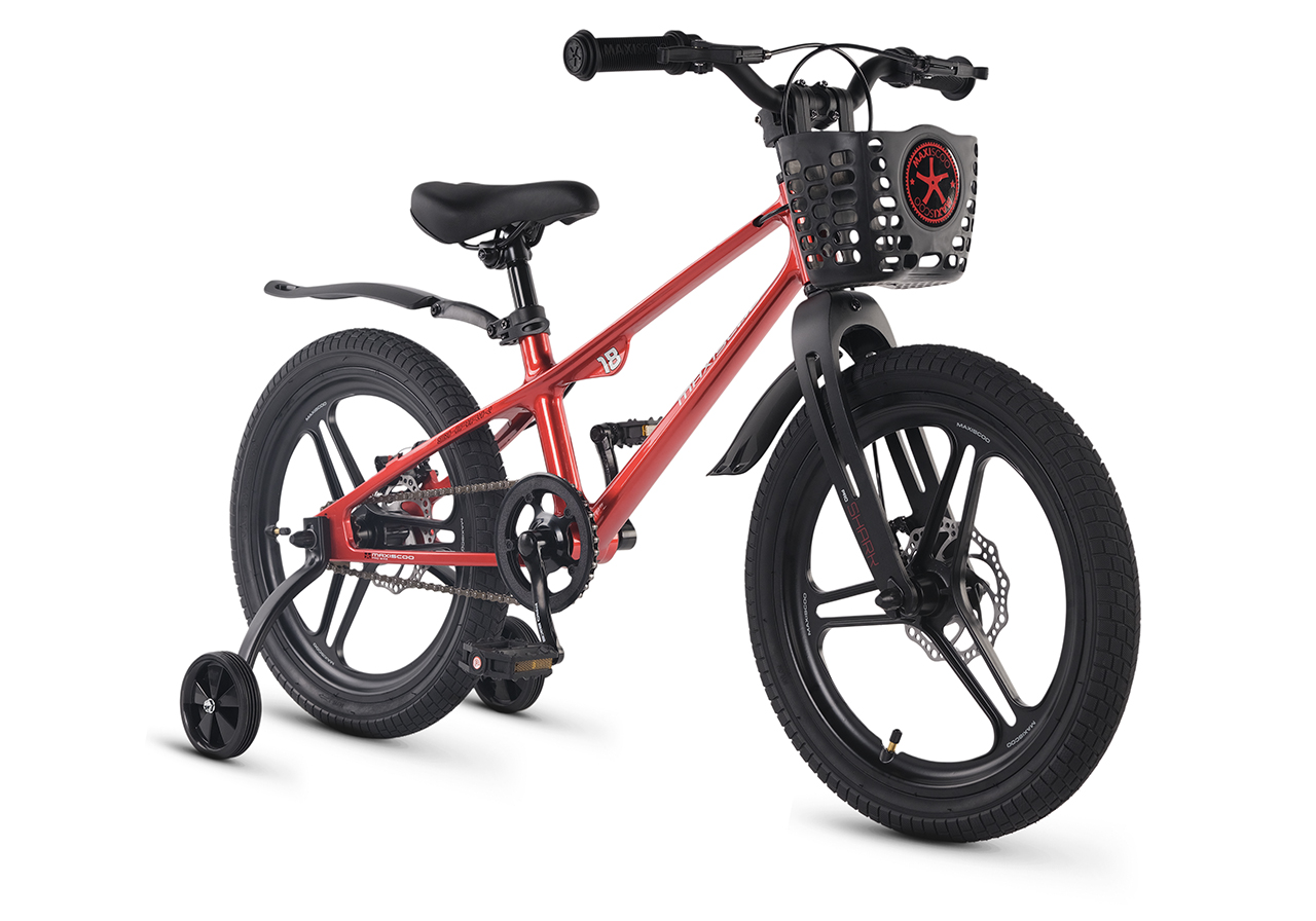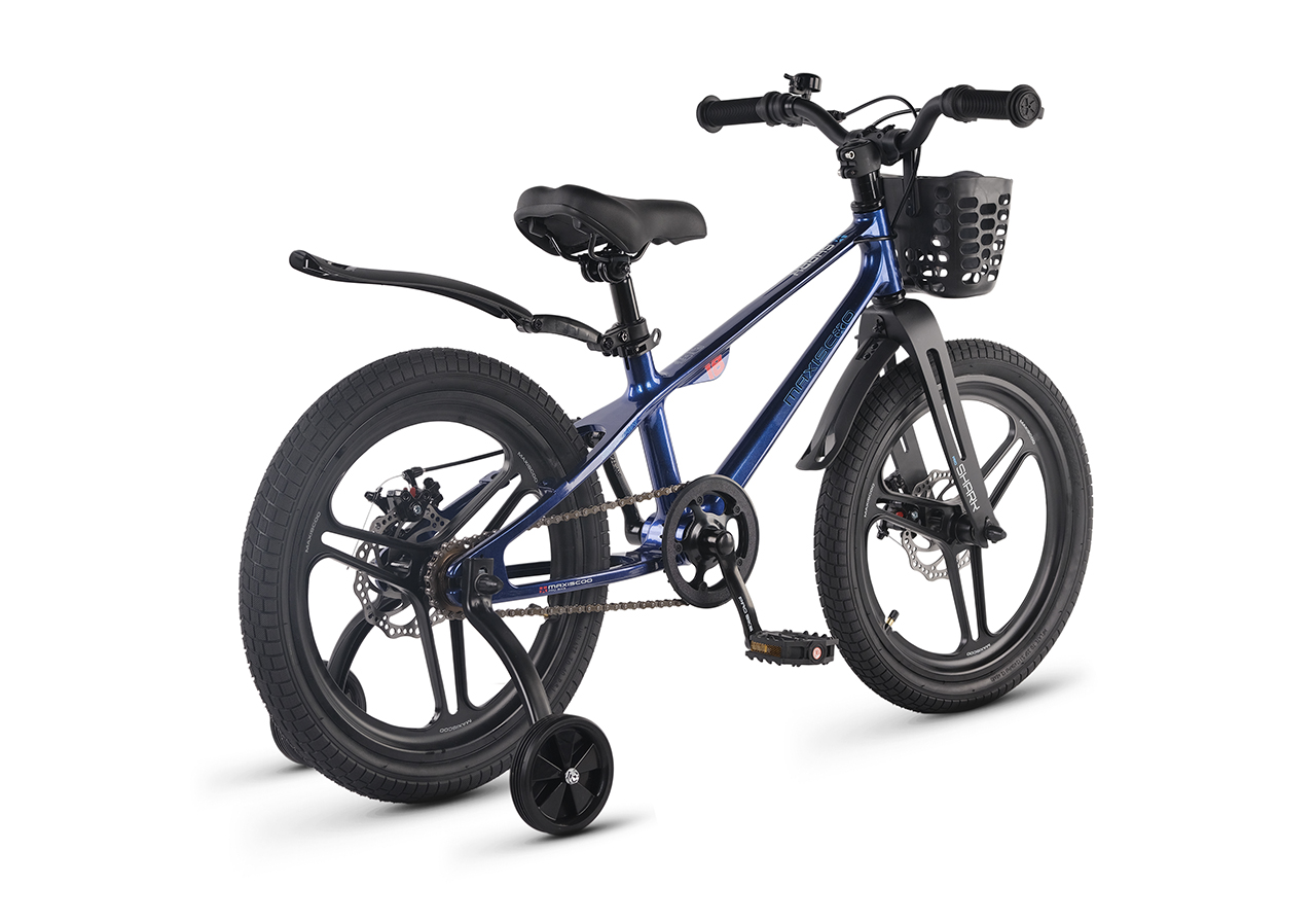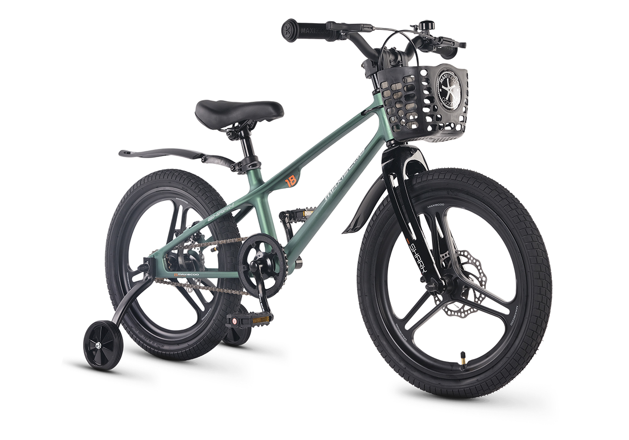 Велосипед, предназначенный для детей в возрасте от четырех до восьми лет, без переключения передач. Технические особенности: легкая рама из магниевого сплава (скрытая проводка, прямой рулевой стакан, крепление калипера IS), жесткая вилка из магниевого сплава (крепление калипера IS), литые колеса из магниевого сплава (трёхлучевые, под ниппель AV), дисковые механические тормоза (роторы 140/140 мм), защита цепи, съемные боковые колеса, пластиковые крылья, передняя корзинка. Максимальная нагрузка - до 40 кг. Подходит для обучения и прогулочного катания в городских условиях. Диаметр колес - 18 дюймов. Вес - 10 кг.
