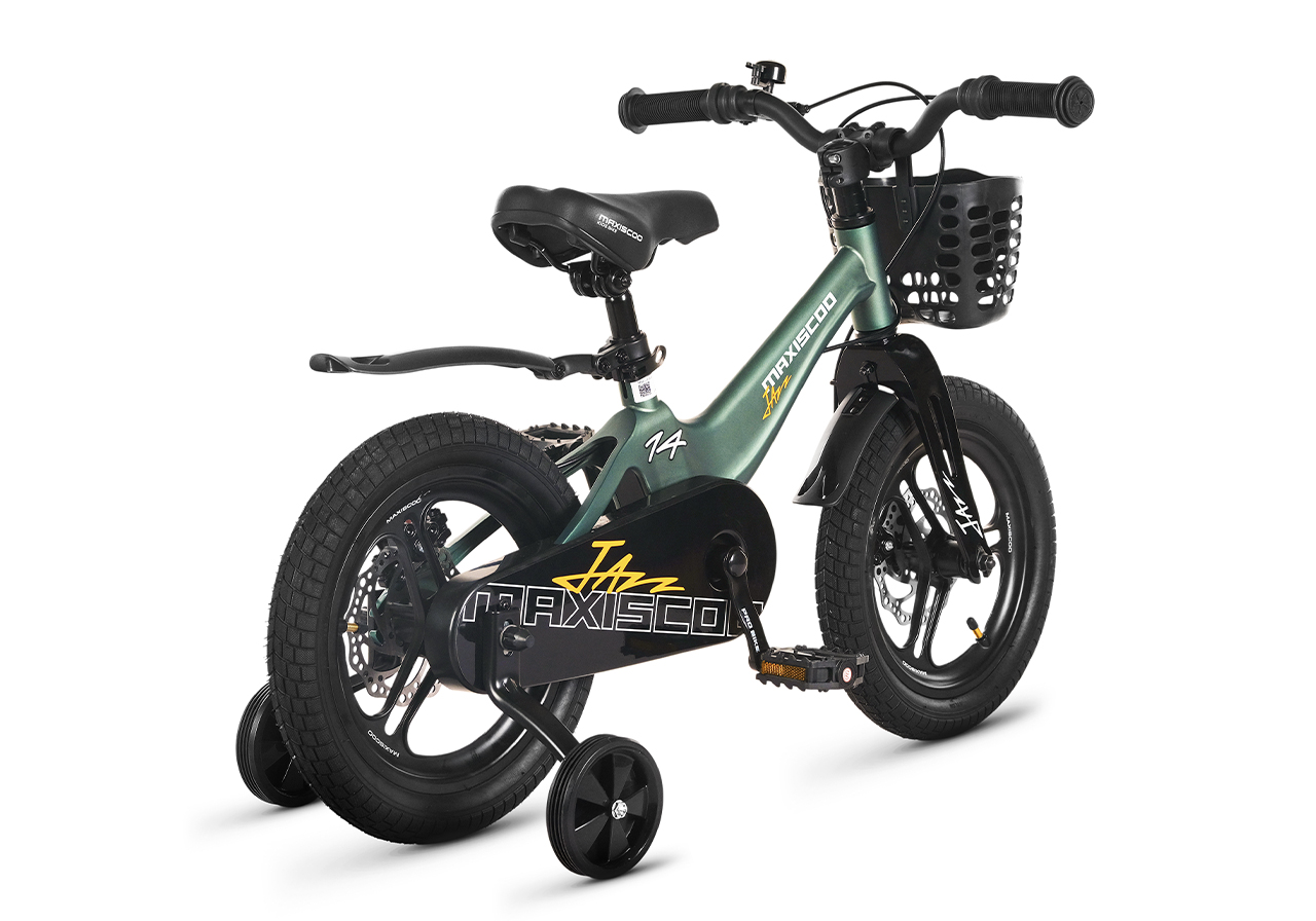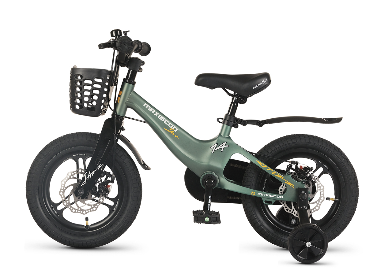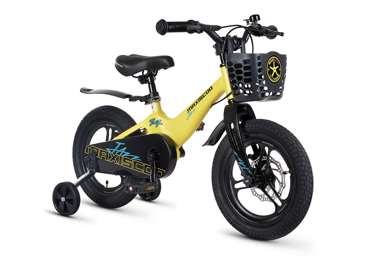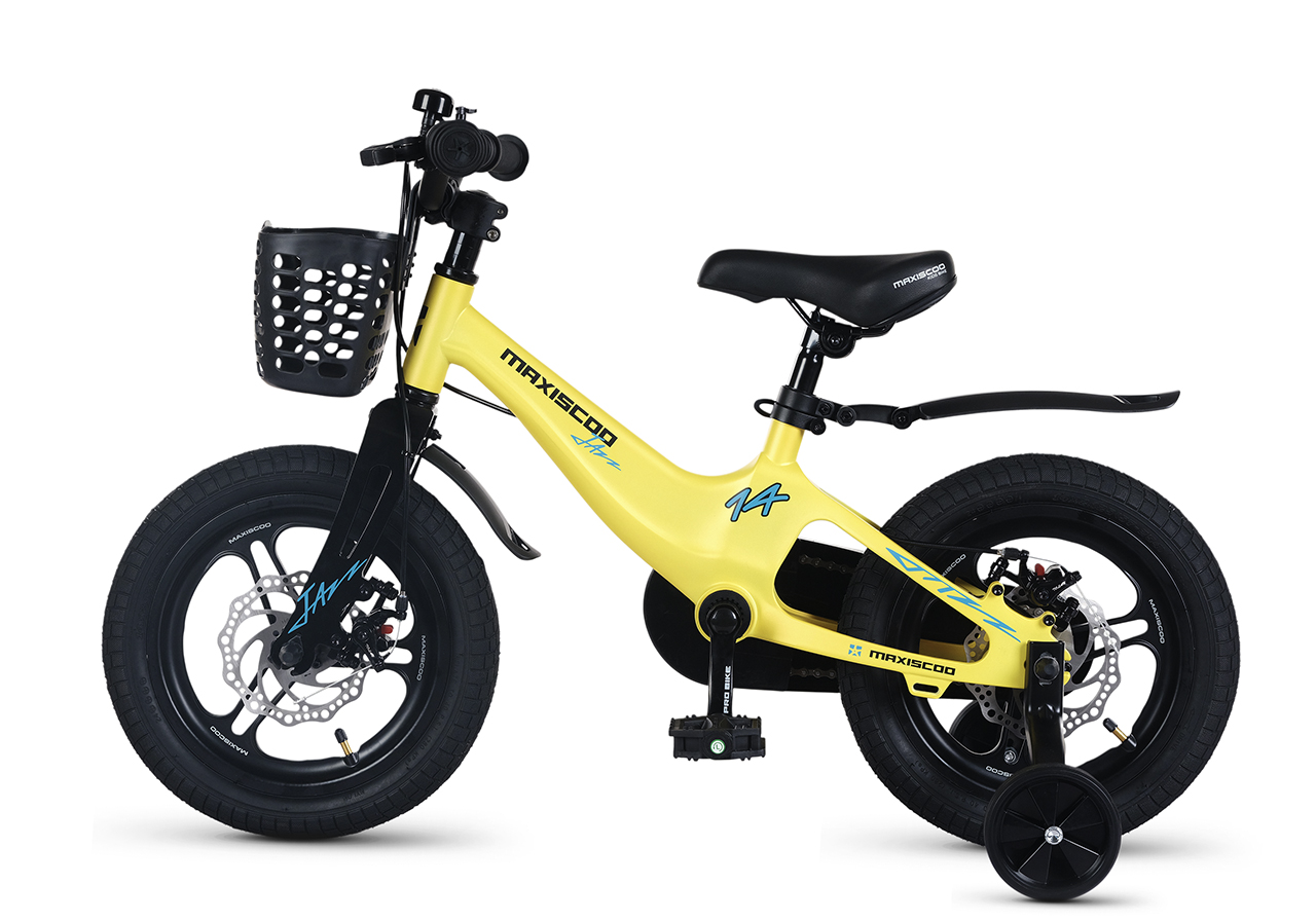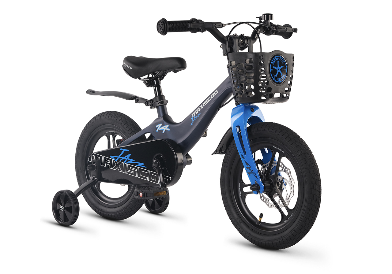 Велосипед, предназначенный для детей в возрасте от двух до четырех лет, без переключения передач. Технические особенности: легкая рама из магниевого сплава (скрытая проводка, прямой рулевой стакан, крепление калипера IS), жесткая вилка из магниевого сплава (крепление калипера IS), литые колеса из магниевого сплава (трёхлучевые, под ниппель AV), дисковые механические тормоза (роторы 140/140 мм), полная защита цепи, съемные боковые колеса, пластиковые крылья, передняя корзинка, звонок. Максимальная нагрузка - до 40 кг. Подходит для обучения и прогулочного катания в городских условиях. Диаметр колес - 14 дюймов. Вес - 8,4 кг.