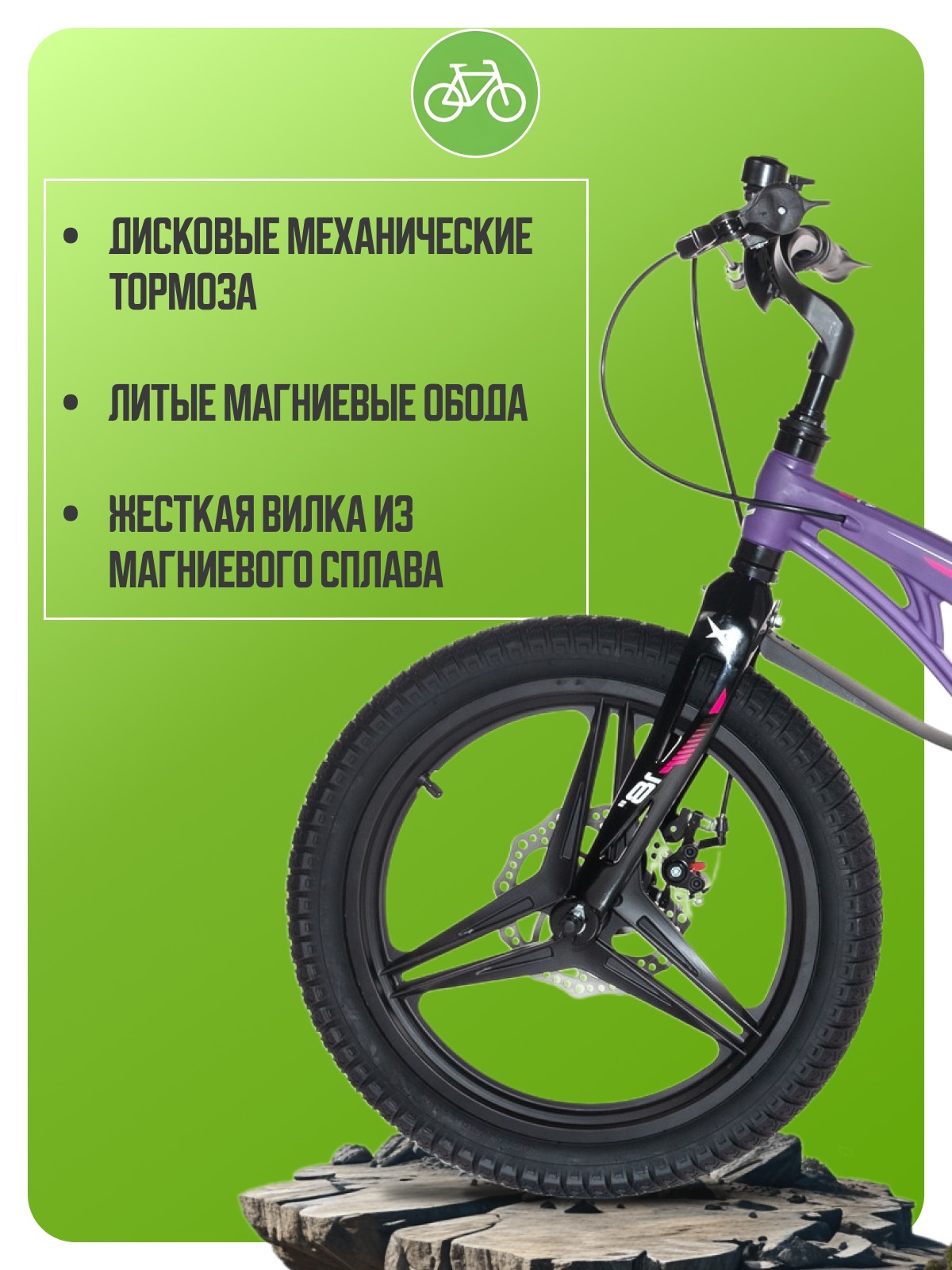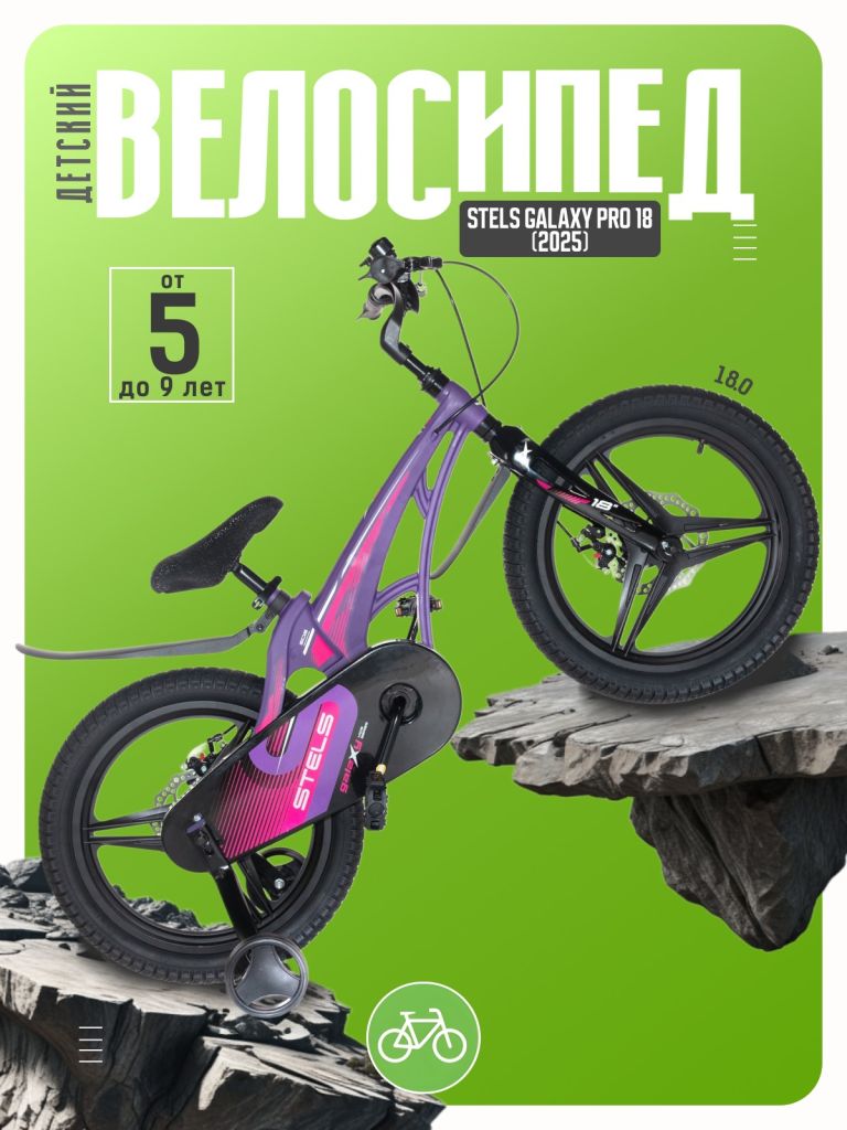 Велосипед, предназначенный для детей в возрасте от четырех до восьми лет, без переключения передач. Технические особенности: легкая рама из магниевого сплава, жесткая вилка из магниевого сплава, литые магниевые обода (под AV ниппель), дисковые механические тормоза (роторы 140/140 мм), защита цепи, съемные боковые колеса, пластиковые крылья, звонок. Подходит для обучения и прогулочного катания в городских условиях. Диаметр колес - 18 дюймов. Вес - 10,5 кг.