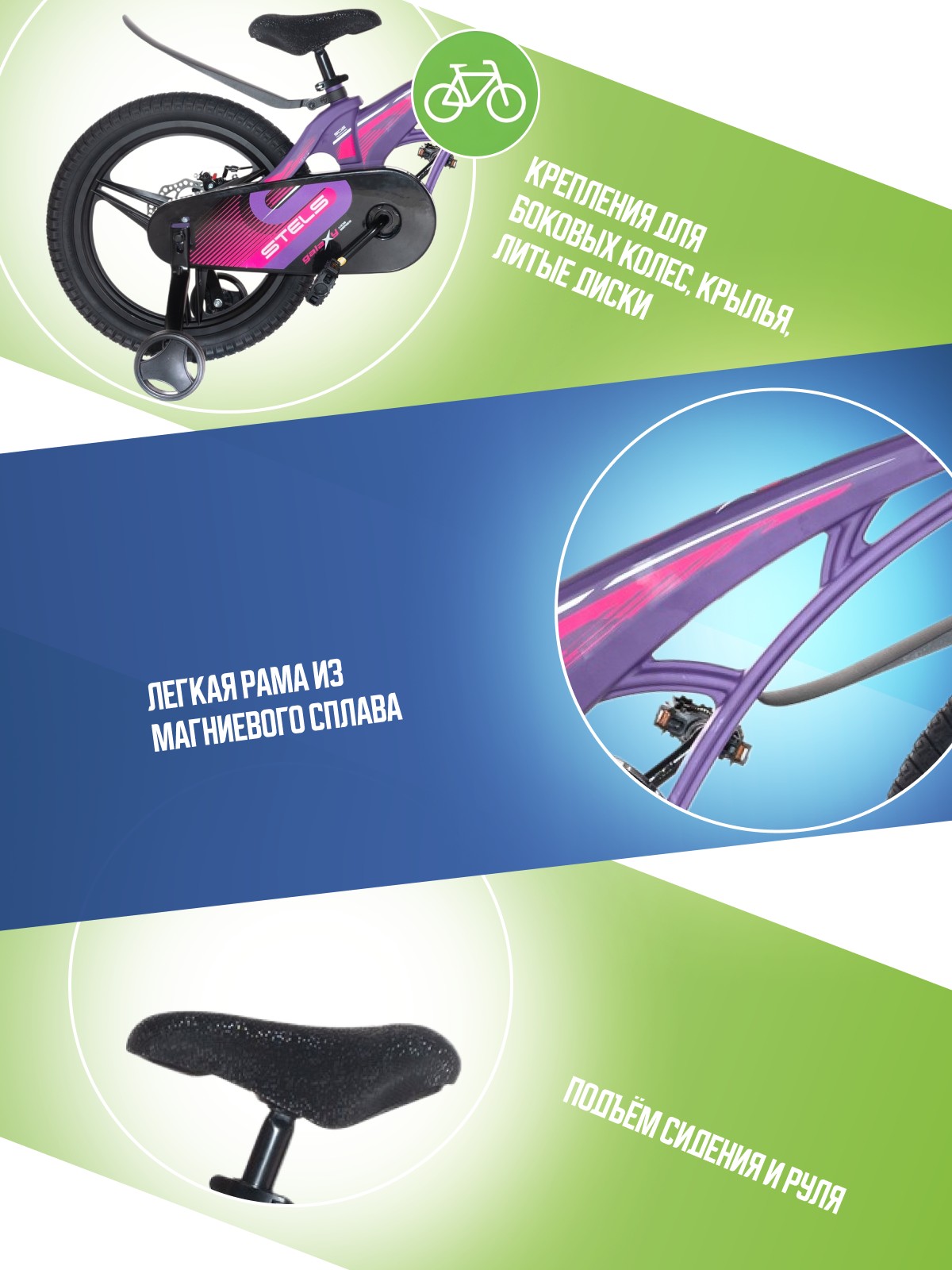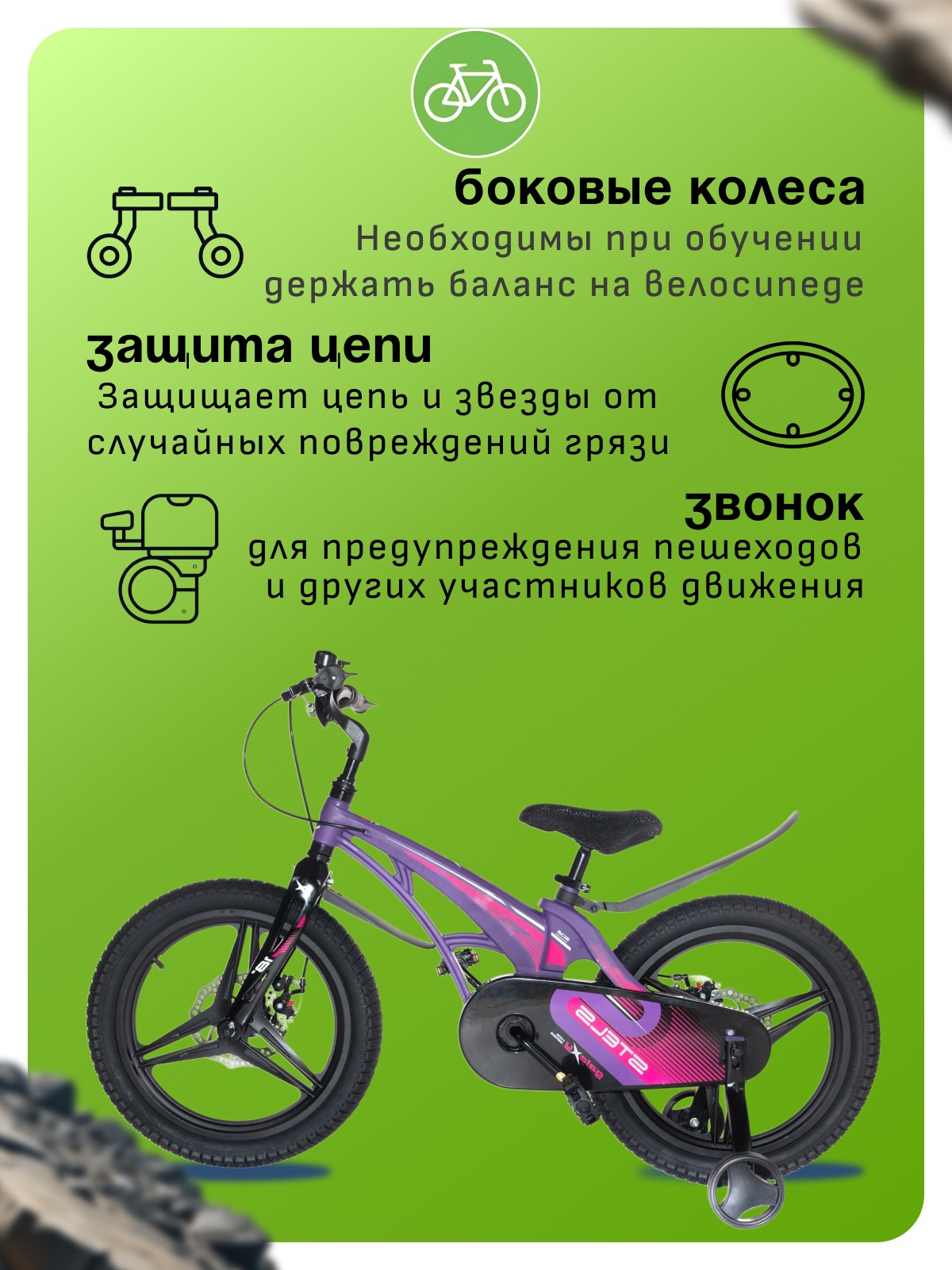 Особенности велосипеда: Боковые колеса, Дисковые тормоза, Защита цепи, Звонок, Крепления для боковых колес, Крылья, Литые диски.