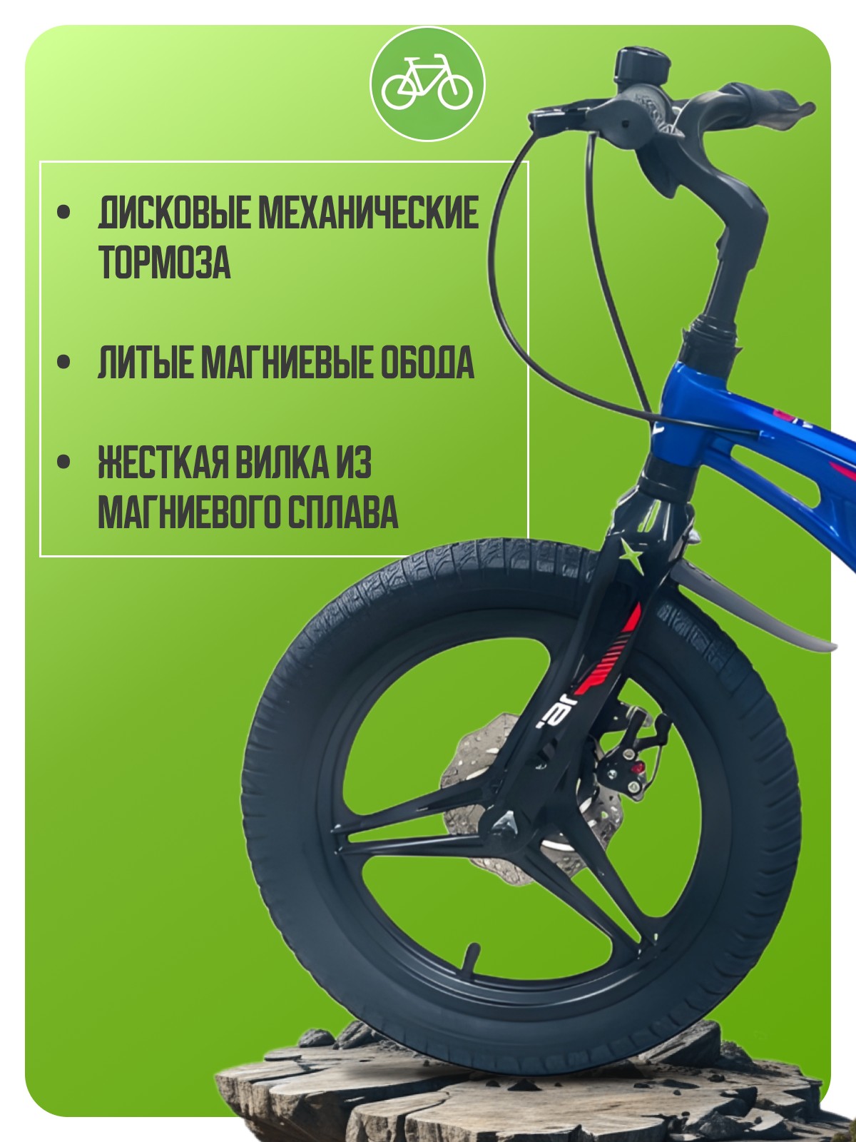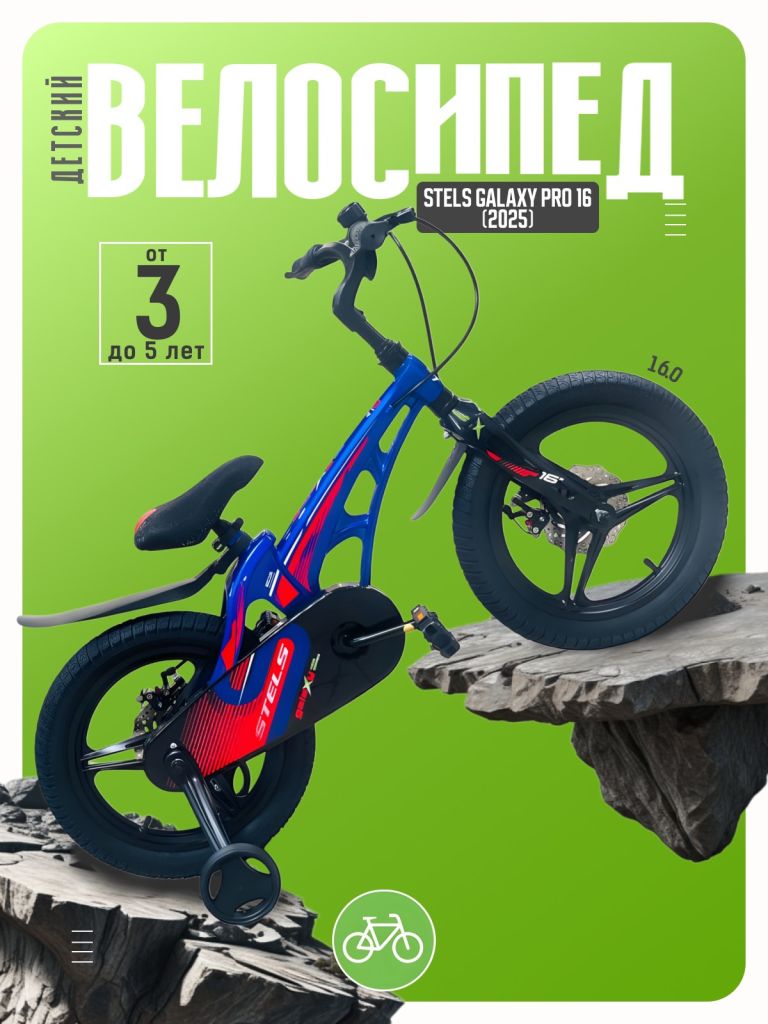 Велосипед, предназначенный для детей в возрасте от трех до шести лет, без переключения передач. Технические особенности: легкая рама из магниевого сплава, жесткая вилка из магниевого сплава, литые магниевые обода (под AV ниппель), дисковые механические тормоза (роторы 140/140 мм), защита цепи, съемные боковые колеса, пластиковые крылья, звонок. Подходит для обучения и прогулочного катания в городских условиях. Диаметр колес - 16 дюймов. Вес - 9,5 кг.