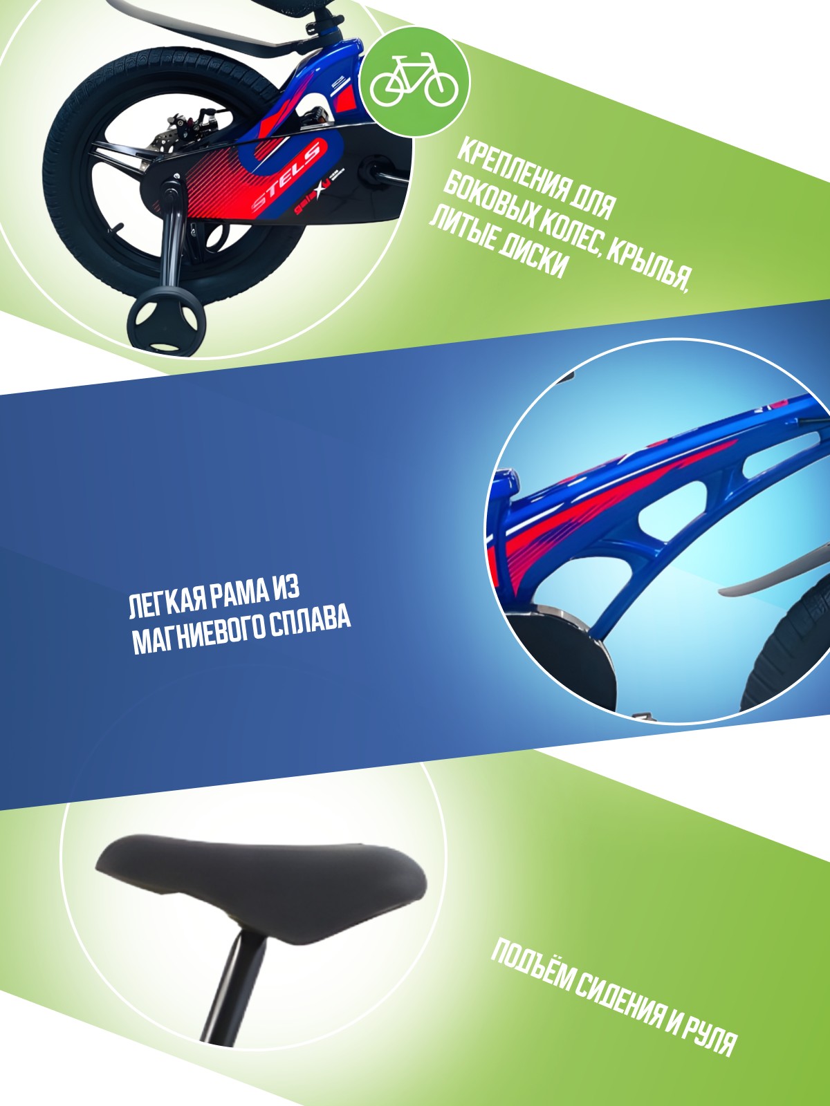 Особенности велосипеда: Боковые колеса, Дисковые тормоза, Защита цепи, Звонок, Крепления для боковых колес, Крылья, Литые диски.