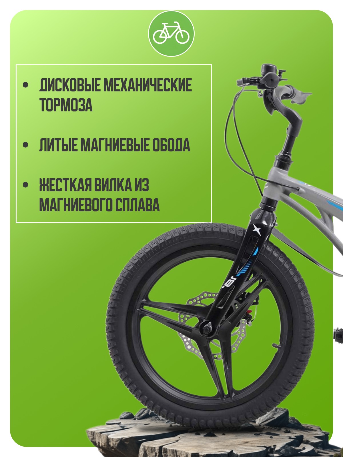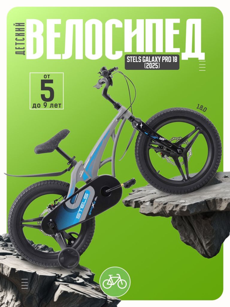 Велосипед, предназначенный для детей в возрасте от четырех до восьми лет, без переключения передач. Технические особенности: легкая рама из магниевого сплава, жесткая вилка из магниевого сплава, литые магниевые обода (под AV ниппель), дисковые механические тормоза (роторы 140/140 мм), защита цепи, съемные боковые колеса, пластиковые крылья, звонок. Подходит для обучения и прогулочного катания в городских условиях. Диаметр колес - 18 дюймов. Вес - 10,5 кг.