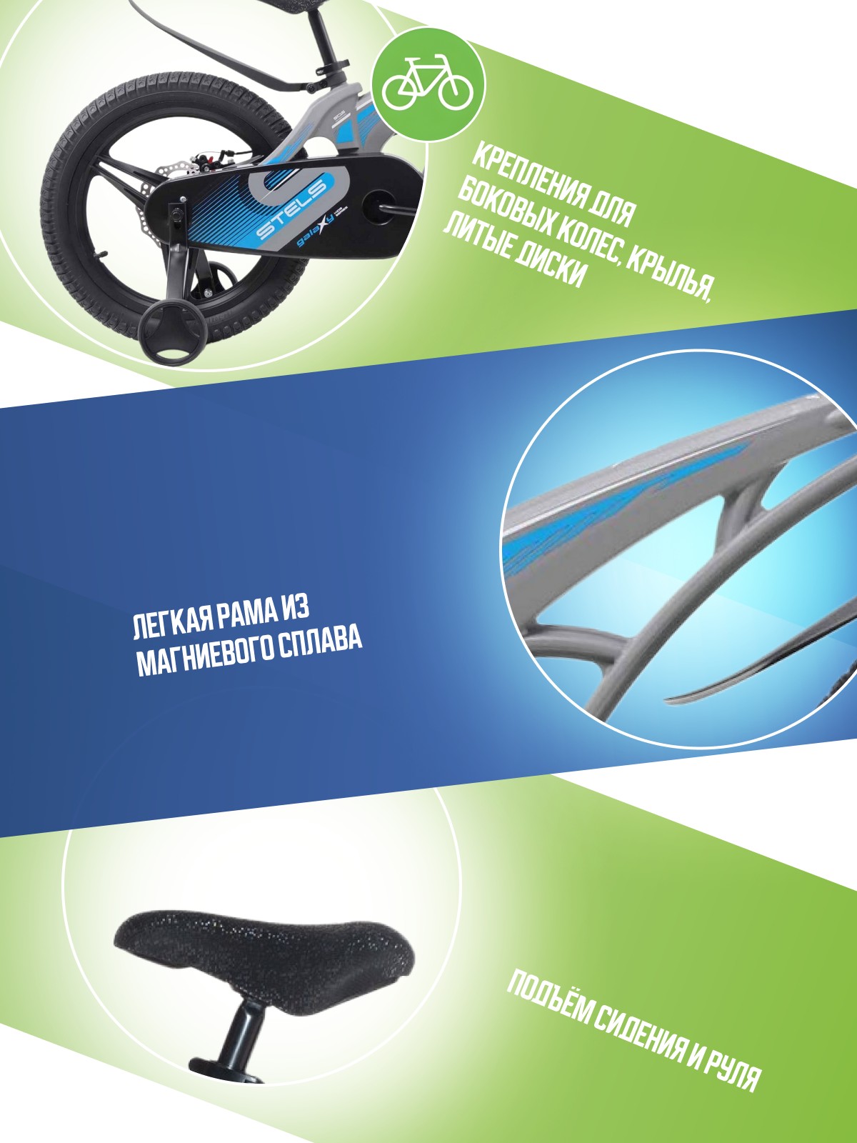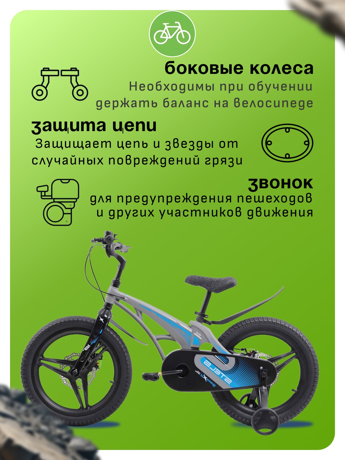 Особенности велосипеда: Боковые колеса, Дисковые тормоза, Защита цепи, Звонок, Крепления для боковых колес, Крылья, Литые диски.
