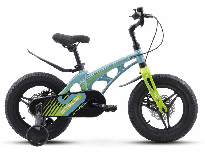 Велосипед, предназначенный для детей в возрасте от двух до четырех лет, без переключения передач. Технические особенности: легкая рама из магниевого сплава, жесткая вилка из магниевого сплава, литые магниевые обода (под AV ниппель), дисковые механические тормоза (роторы 140/140 мм), защита цепи, съемные боковые колеса, пластиковые крылья, звонок. Подходит для обучения и прогулочного катания в городских условиях. Диаметр колес - 14 дюймов. Вес - 8,5 кг.