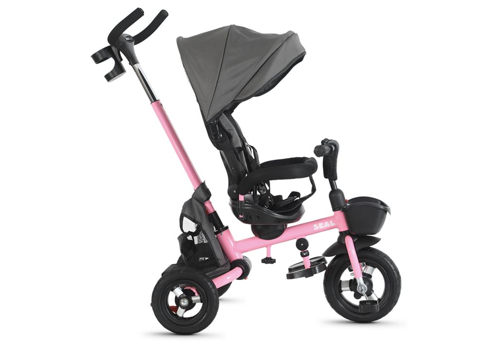 Трехколесный велосипед, предназначенный для детей в возрасте от полутора до трех лет, без переключения передач. Технические особенности: складная стальная рама, жесткая стальная вилка, усиленные пластиковые колеса, блокировка задних колес, телескопическая родительская ручка с подстаканником, ремни безопасности, поручень, функция свободного хода переднего колеса, комфортное сиденье с мягкой подкладкой, регулировкой наклона спинки и поворотным механизмом, передняя пластиковая корзинка, сумка для игрушек, регулируемый козырёк. Подходит для прогулочного катания в городских условиях. Диаметр колес: 11 и 9 дюймов. Вес - 10 кг.