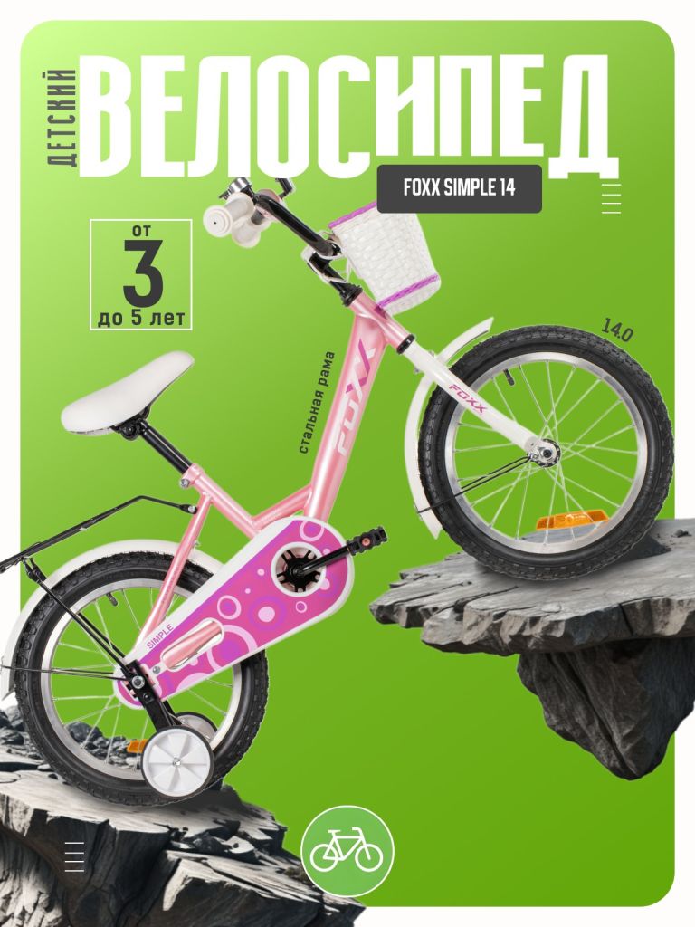 Велосипед, предназначенный для детей в возрасте от двух до четырех лет, без переключения передач. Технические особенности: прочная стальная рама, жесткая стальная вилка, одинарные алюминиевые обода (ниппель AV), ножной педальный тормоз, полная защита цепи, съемные боковые колеса, длинные крылья, задний багажник с зажимом, передняя корзинка, мягкая накладка на руле, звонок, катафоты. Подходит для обучения и прогулочного катания в городских условиях. Диаметр колес - 14 дюймов. Вес - 9,2 кг.