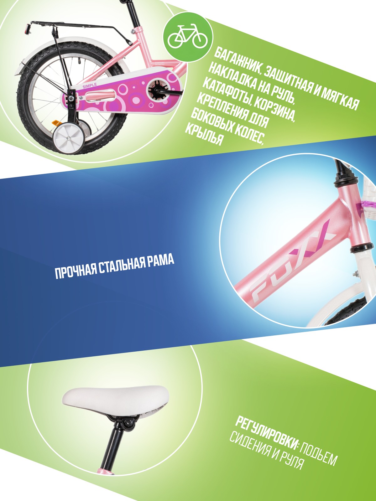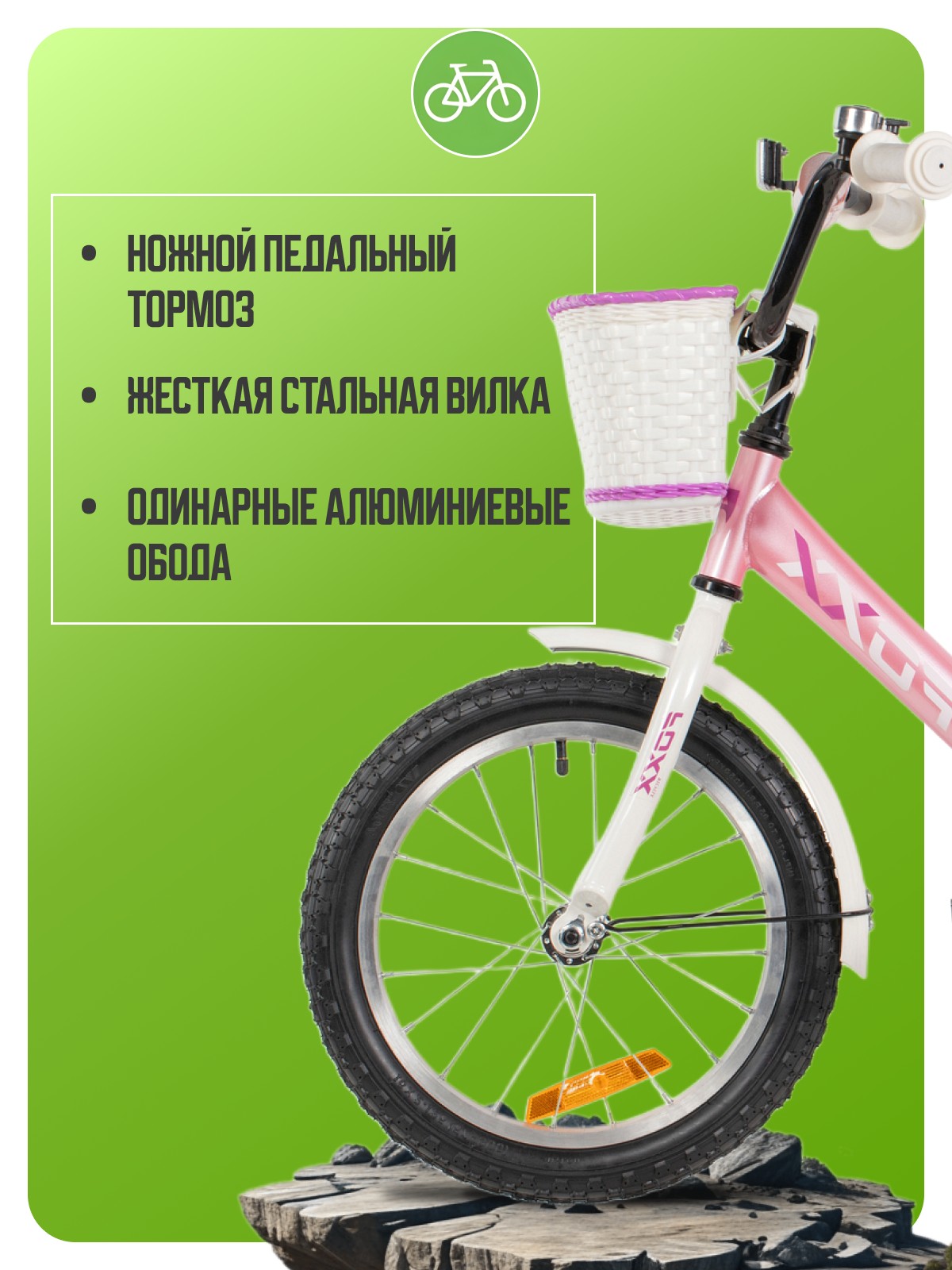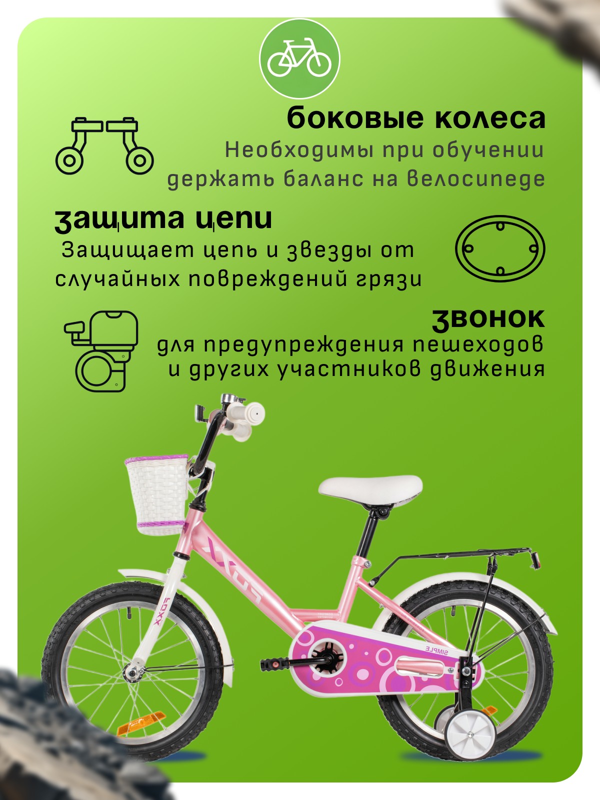 Особенности велосипеда: Багажник, Боковые колеса, Защита цепи, Защитная накладка на руль, Звонок, Катафоты, Корзина, Крепления для боковых колес, Крылья, Мягкая накладка на руль, Ножной тормоз.