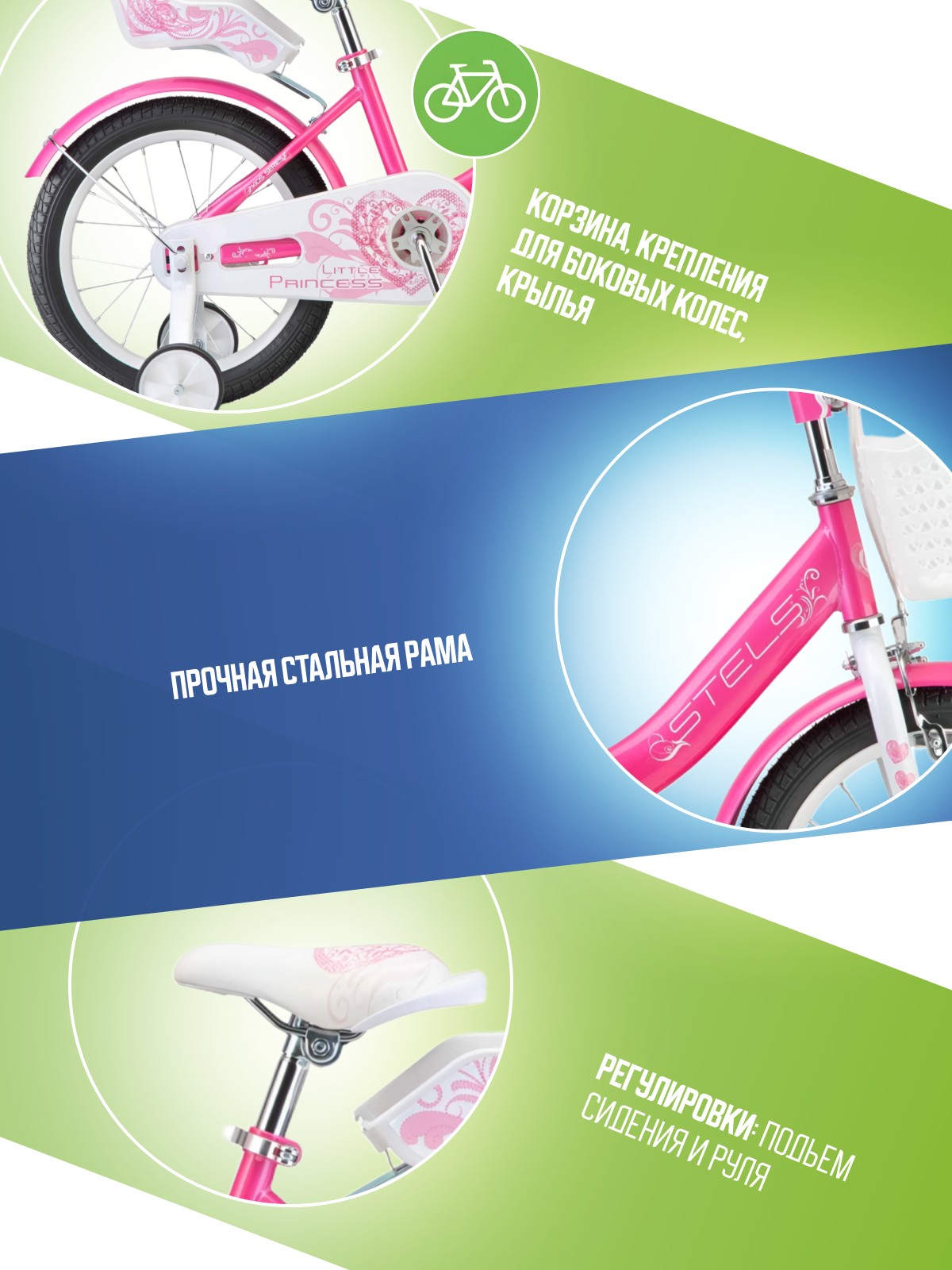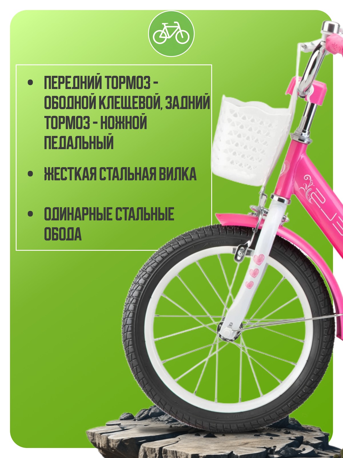 Велосипед, предназначенный для девочек в возрасте от двух до четырех лет, без переключения передач. Технические особенности: прочная стальная рама, жесткая стальная вилка, одинарные стальные обода (под AV ниппель), передний тормоз - ободной клещевой, задний тормоз - ножной педальный, полная защита цепи, полноразмерные крылья, съемные боковые колеса, передняя корзина, сиденье для куклы, звонок. Подходит для обучения и прогулочного катания в городских условиях. Диаметр колес - 14 дюймов. Вес - 9,4 кг.