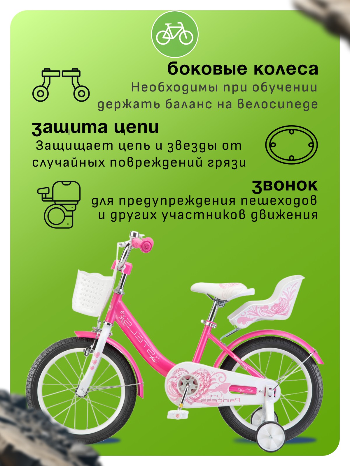 Особенности велосипеда: Боковые колеса, Защита цепи, Звонок, Корзина, Крепления для боковых колес, Крылья, Ножной тормоз.