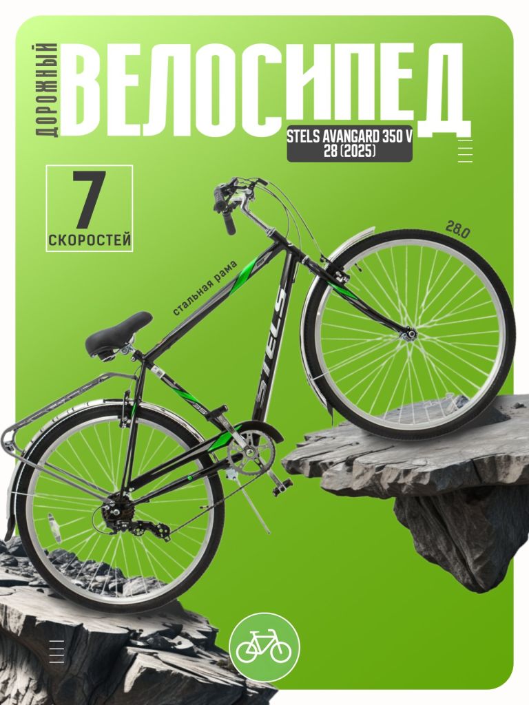 Дорожный велосипед с навесным оборудованием начального уровня Shimano, 7 скоростей. Технические особенности: прочная стальная рама, жесткая стальная вилка, двойные алюминиевые обода (под ниппель AV), надежные ободные тормоза V-brake, защита цепи, длинные крылья из нержавеющей стали, задний багажник, комфортное седло, звонок, катафоты. Подходит для прогулочной езды по шоссе и ровным проселочным дорогам. Диаметр колес - 28 дюймов. Вес - 17,47 кг.