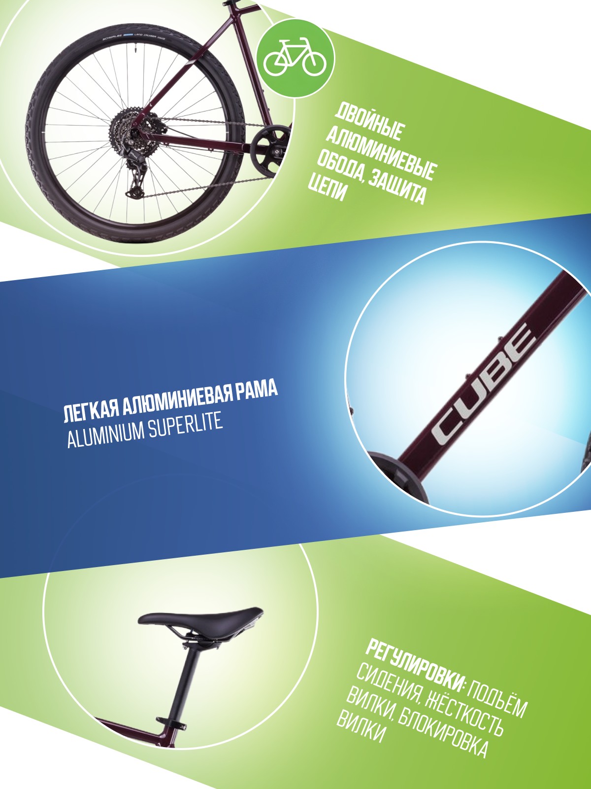 Дорожный велосипед гибридного типа с оборудованием любительского класса Shimano, 8 скоростей. Технические особенности: алюминиевая рама Aluminium Superlite (двойной баттинг, гидроформинг, конический рулевой стакан, скрытая проводка рубашки переключателей), амортизационная вилка SR Suntour NEX HLO (пружинная, ход 63 мм, гидравлическая блокировка), двойные алюминиевые обода CUBE EX25 (подходят для бескамерного использования), дисковые гидравлические тормоза Shimano BR-MT200 (роторы 160/160 мм), защита цепи. Подходит для активной езды по шоссе и несложной пересеченной местности. Диаметр колес - 28 дюймов. Вес - 14,7 кг.