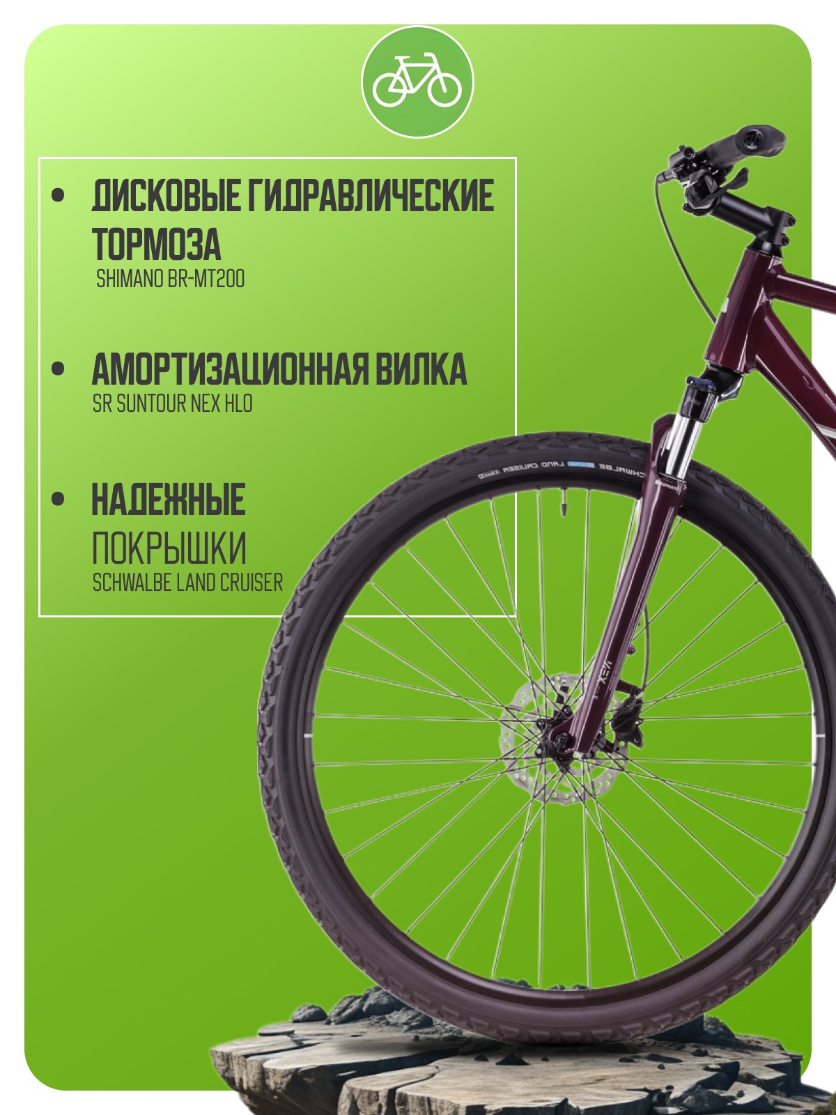 Особенности велосипеда: Алюминиевая рама, Амортизационная вилка, Баттинг рамы, Гидравлический привод тормозов, Гидроформинг рамы, Двойные обода, Дисковые тормоза, Защита цепи, Многоскоростной.