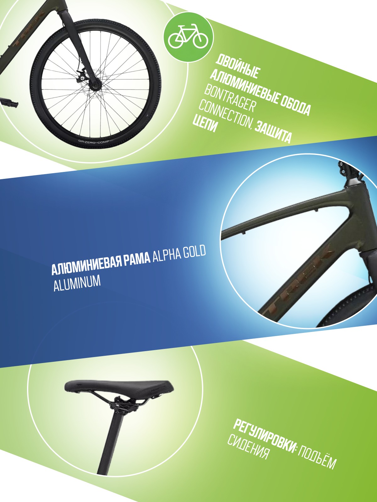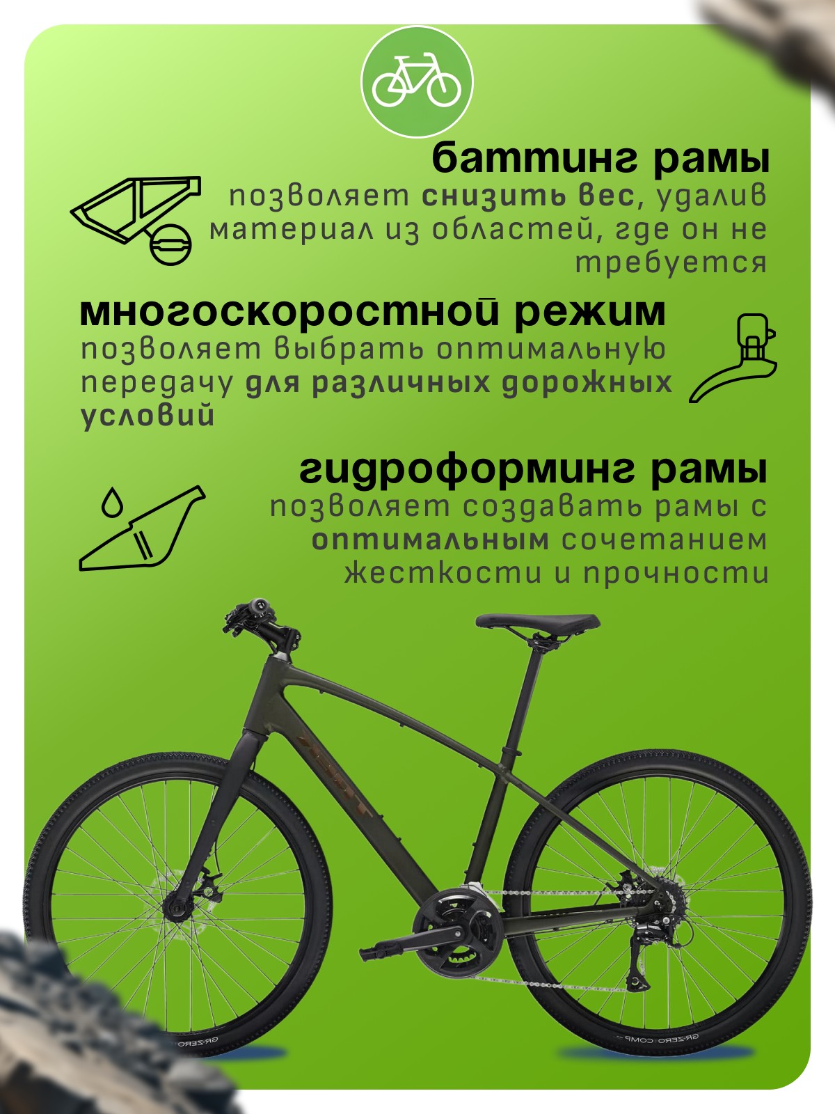 Особенности велосипеда: Алюминиевая рама, Баттинг рамы, Гидроформинг рамы, Двойные обода, Дисковые тормоза, Защита цепи, Многоскоростной.