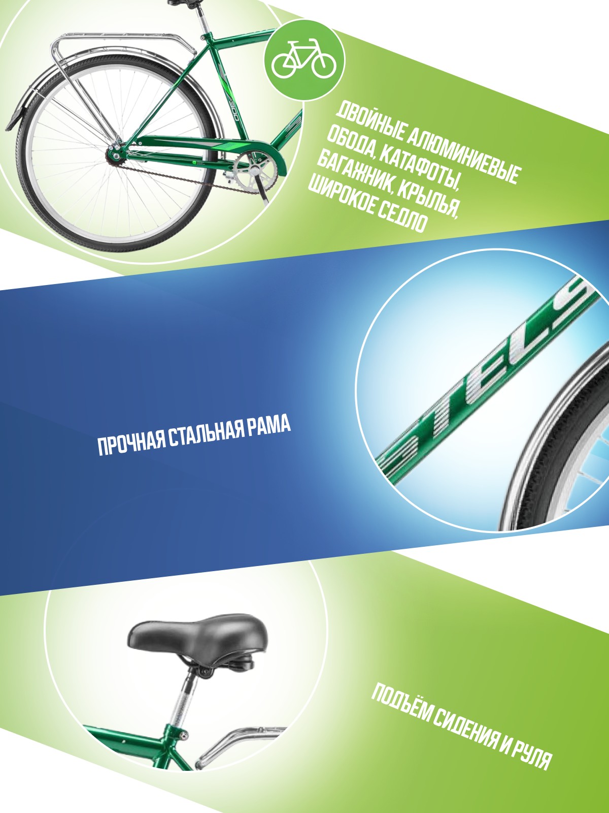 Двойные обода, Защита цепи, Звонок, Катафоты, Крылья, Ножной тормоз, Широкое седло, Багажник