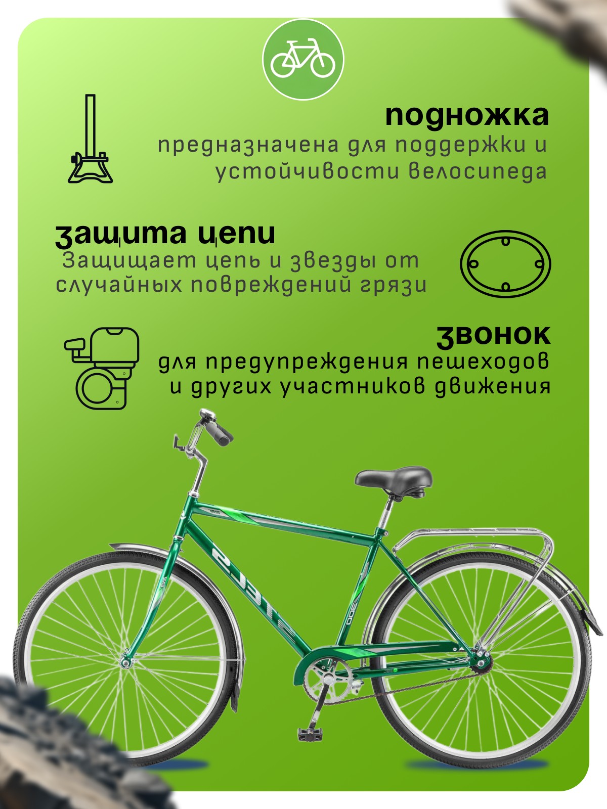 Особенности велосипеда: Двойные обода, Защита цепи, Звонок, Катафоты, Крылья, Ножной тормоз, Широкое седло, Багажник.