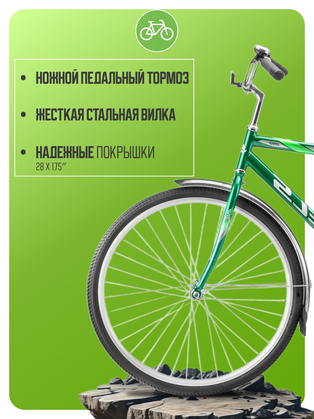 Дорожный велосипед начального уровня без переключения передач. Технические особенности: прочная стальная рама, жесткая стальная вилка, двойные алюминиевые обода, ножной педальный тормоз, защита цепи, длинные крылья, багажник, комфортное седло, звонок, катафоты. Подходит для прогулочной езды по шоссе и ровным проселочным дорогам. Диаметр колес - 28 дюймов. Вес - 17,47 кг.
