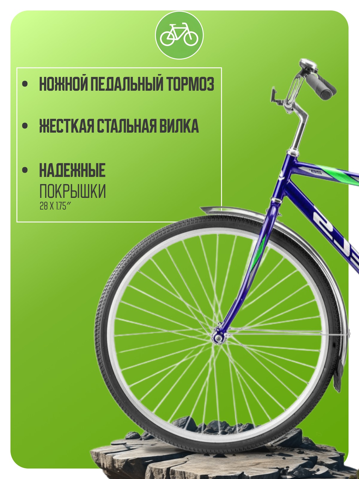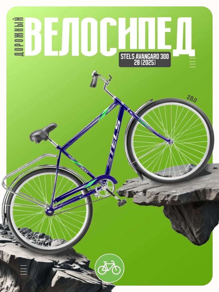 Дорожный велосипед начального уровня без переключения передач. Технические особенности: прочная стальная рама, жесткая стальная вилка, двойные алюминиевые обода, ножной педальный тормоз, защита цепи, длинные крылья, багажник, комфортное седло, звонок, катафоты. Подходит для прогулочной езды по шоссе и ровным проселочным дорогам. Диаметр колес - 28 дюймов. Вес - 17,47 кг.