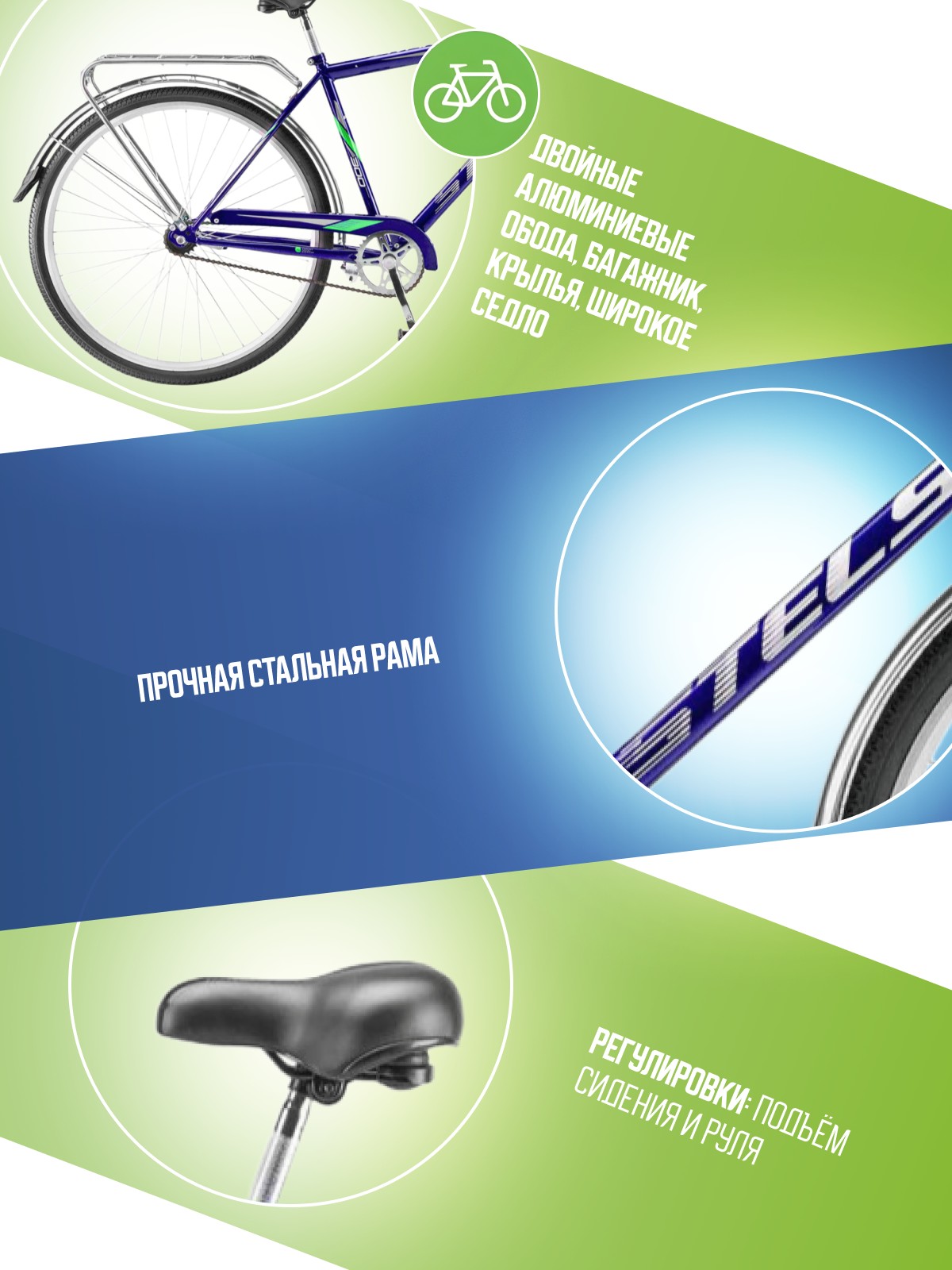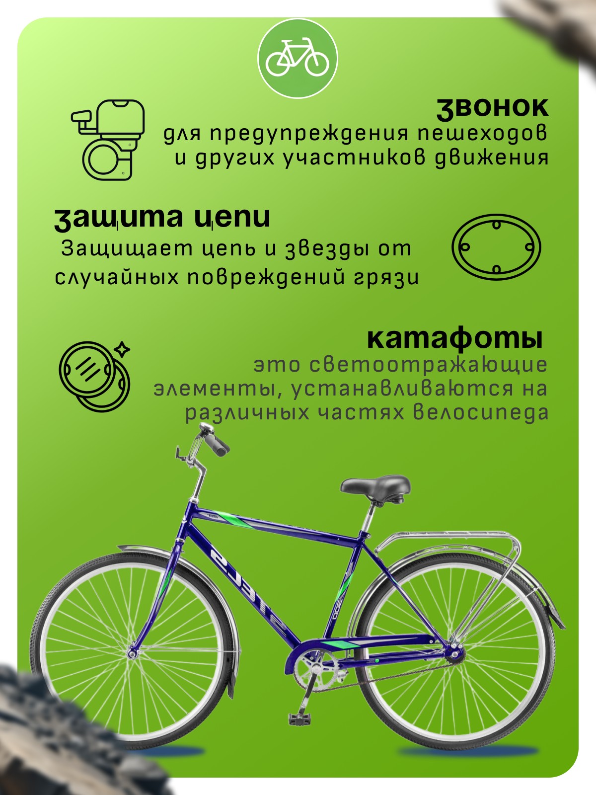 Двойные обода, Защита цепи, Звонок, Катафоты, Крылья, Ножной тормоз, Широкое седло, Багажник