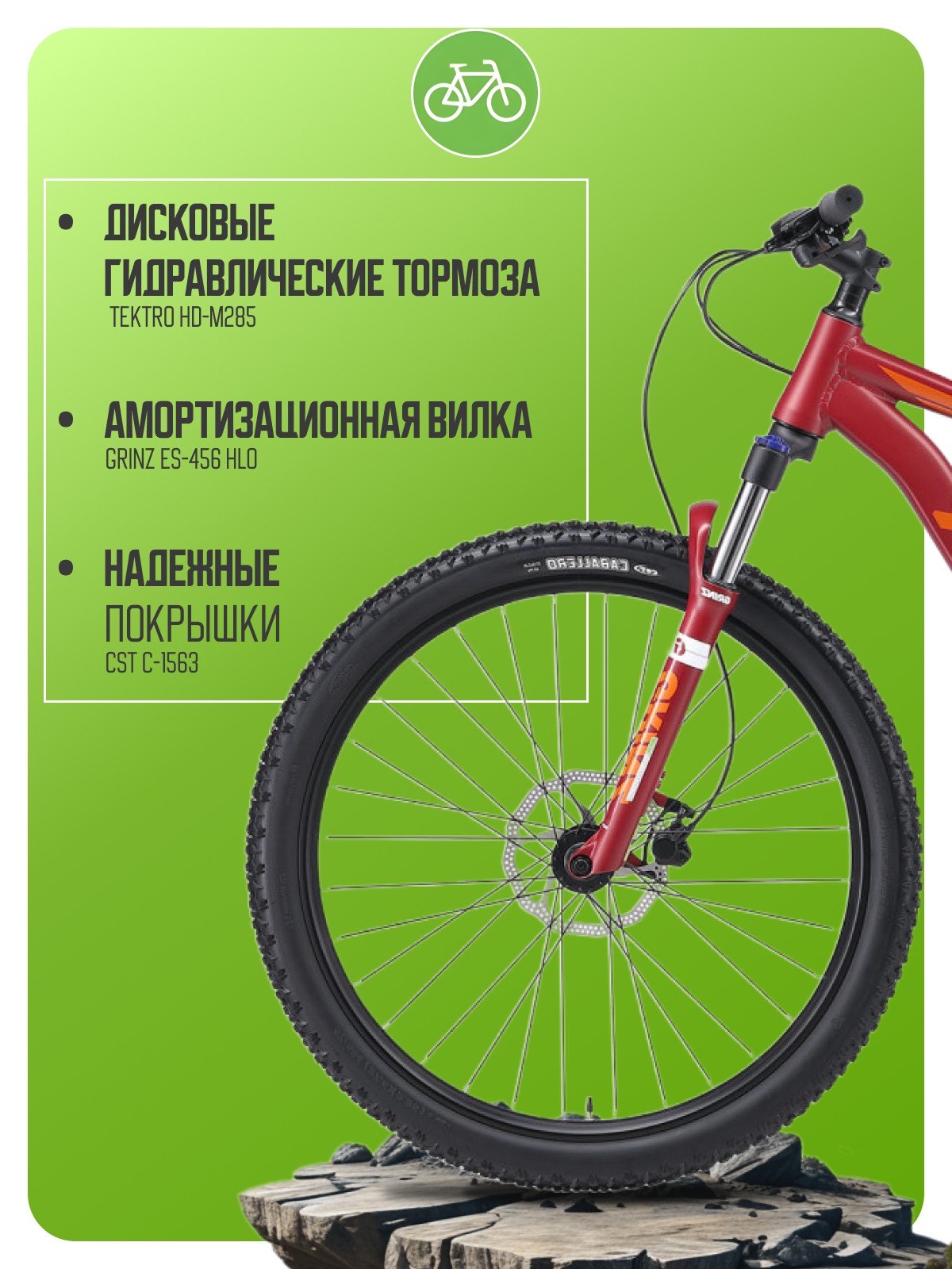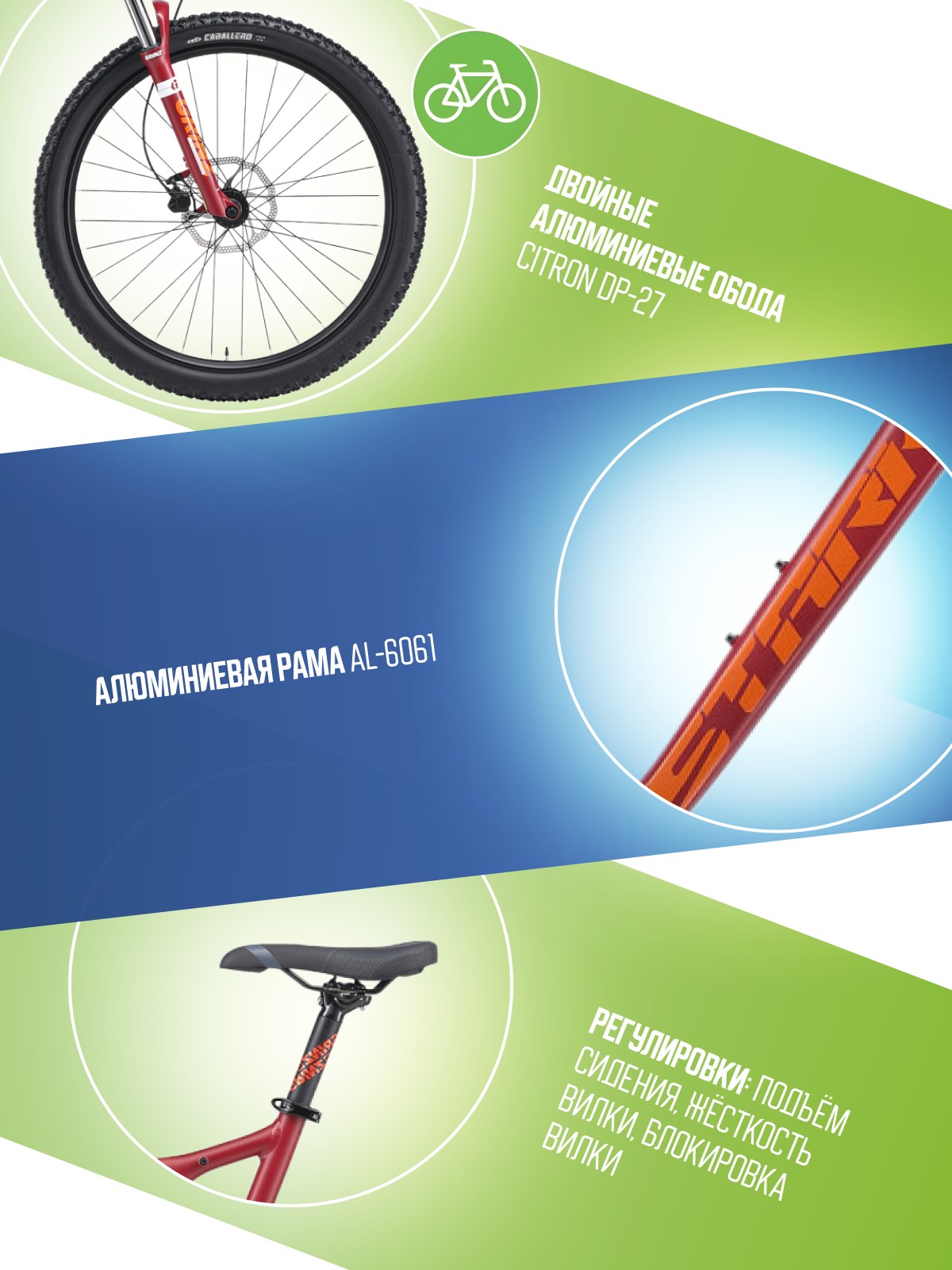 Двухподвес продвинутого уровня с оборудованием высшего любительского класса Shimano, 9 скоростей. Технические особенности: алюминиевая рама AL-6061 (дропауты под полую ось 142х12, внутренняя проводка всех тросов), амортизационная вилка Grinz ES-456 HLO (пружинно-масляная, ход 100 мм, предварительная нагрузка, блокировка), задний амортизатор KS Shock A5-RE 150х24, двойные алюминиевые обода Citron DP-27, дисковые гидравлические тормоза Tektro HD-M285 (роторы 180/160 мм). Подходит для активной езды по различным дорогам и пересеченной местности. Диаметр колес - 27,5 дюймов. Вес - 15,5 кг.
