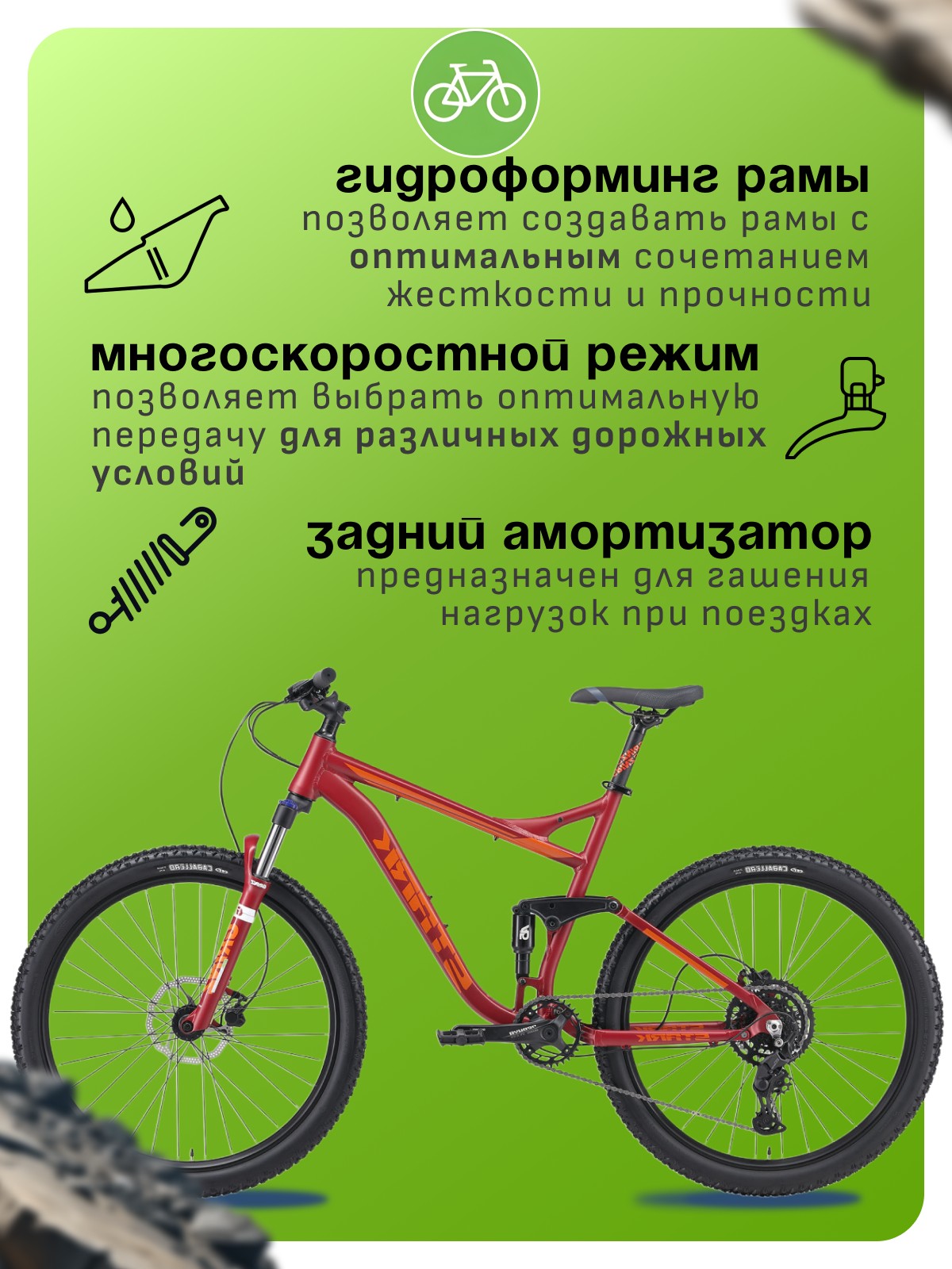 Особенности велосипеда: Алюминиевая рама, Амортизационная вилка, Гидравлический привод тормозов, Гидроформинг рамы, Двойные обода, Дисковые тормоза, Задний амортизатор, Многоскоростной.