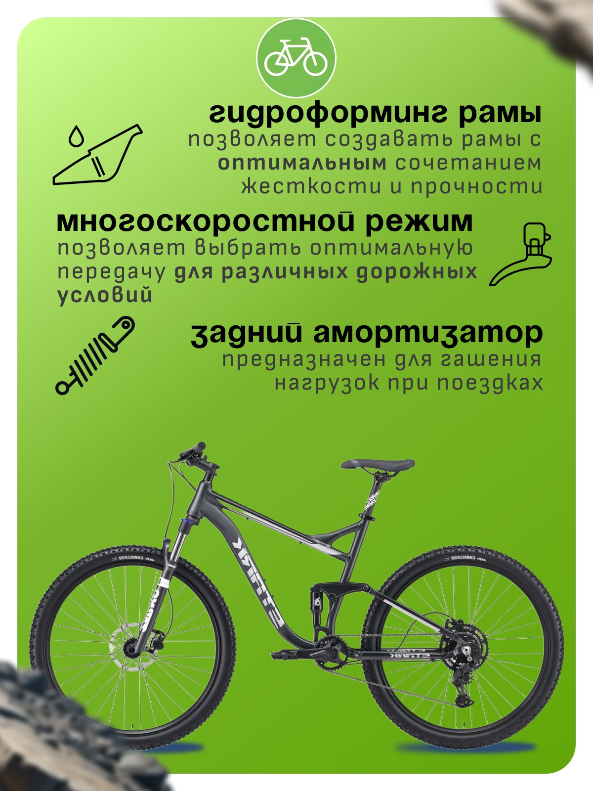 Особенности велосипеда: Алюминиевая рама, Амортизационная вилка, Гидравлический привод тормозов, Гидроформинг рамы, Двойные обода, Дисковые тормоза, Задний амортизатор, Многоскоростной.