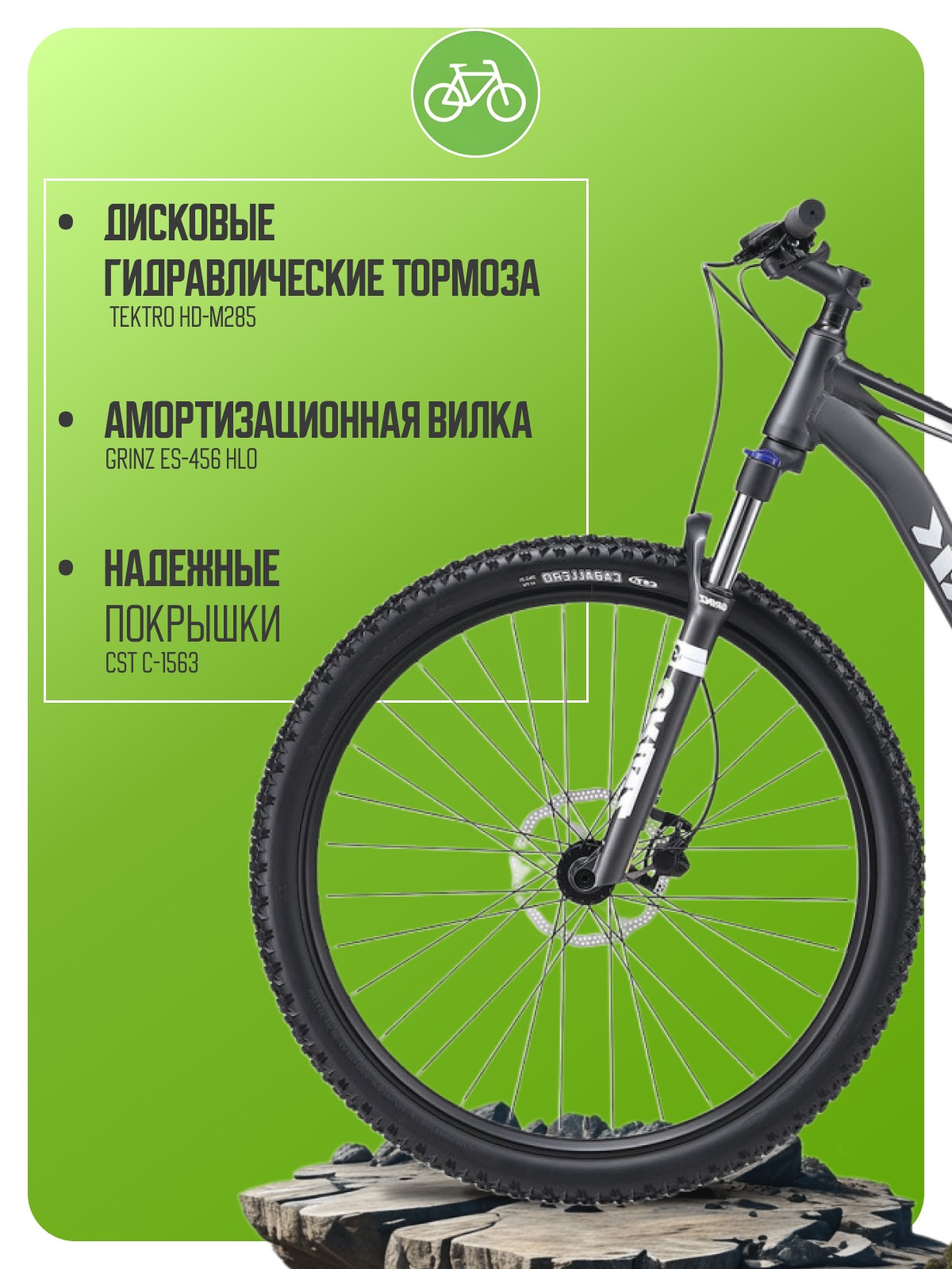 Двухподвес продвинутого уровня с оборудованием высшего любительского класса Shimano, 9 скоростей. Технические особенности: алюминиевая рама AL-6061 (дропауты под полую ось 142х12, внутренняя проводка всех тросов), амортизационная вилка Grinz ES-456 HLO (пружинно-масляная, ход 100 мм, предварительная нагрузка, блокировка), задний амортизатор KS Shock A5-RE 150х24, двойные алюминиевые обода Citron DP-27, дисковые гидравлические тормоза Tektro HD-M285 (роторы 180/160 мм). Подходит для активной езды по различным дорогам и пересеченной местности. Диаметр колес - 29 дюймов. Вес - 15,9 кг.