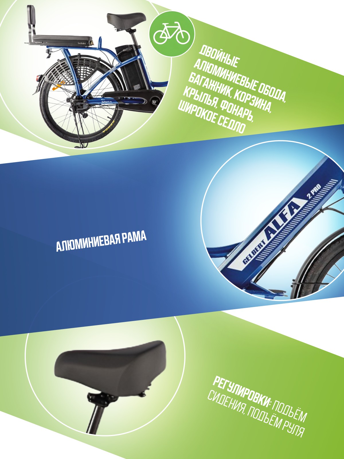 Комфортабельный электровелосипед без переключения передач. Подходит для прогулочного катания в городских условиях и по несложным маршрутам в лесу. Диаметр колес - 24 дюйма. Вес - 36 кг. Грузоподъемность - до 110 кг. Пробег на одной зарядке - до 40 км. Максимальная скорость - до 30 км/ч. Технические особенности: алюминиевая рама (Hardtail, интегрированный багажник), амортизационная вилка пружинного типа, двойные алюминиевые обода (под ниппель AV), передний тормоз - дисковый механический (ротор 160 мм), задний тормоз - барабанный, редукторный мотор мощностью 500 Вт, литий-ионная батарея емкостью 13 Ah, защита цепи, длинные металлические крылья, задний багажник с сиденьем и спинкой, комфортное седло, передняя корзина, система освещения, центральная подножка, подножки для водителя и пассажира, зеркала заднего вида.